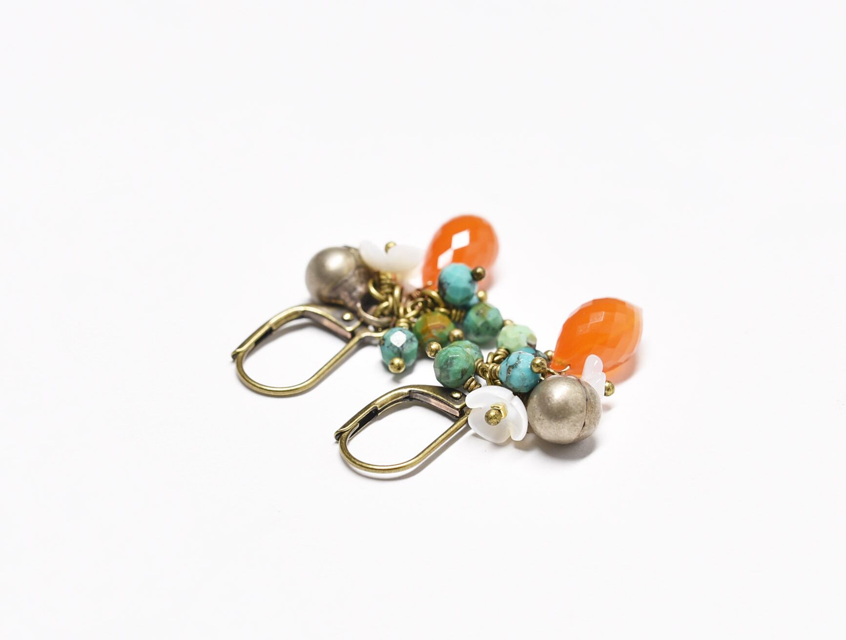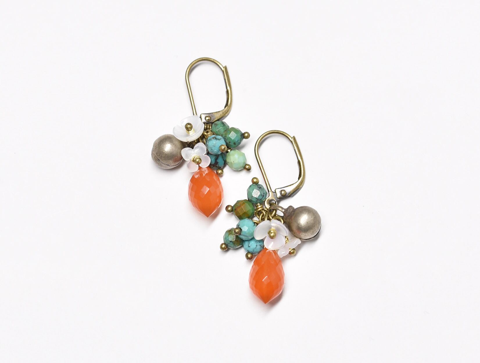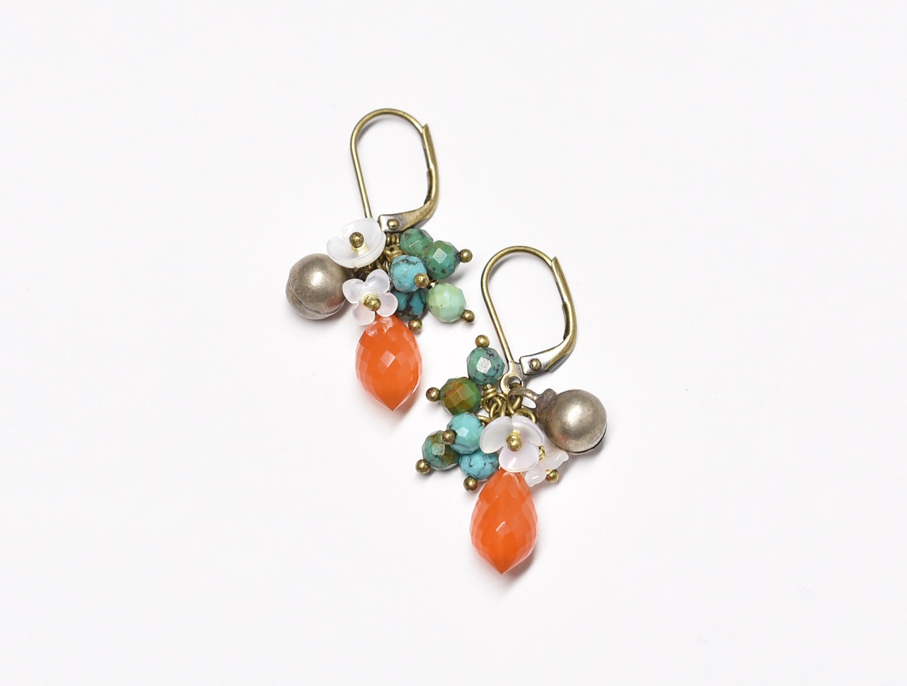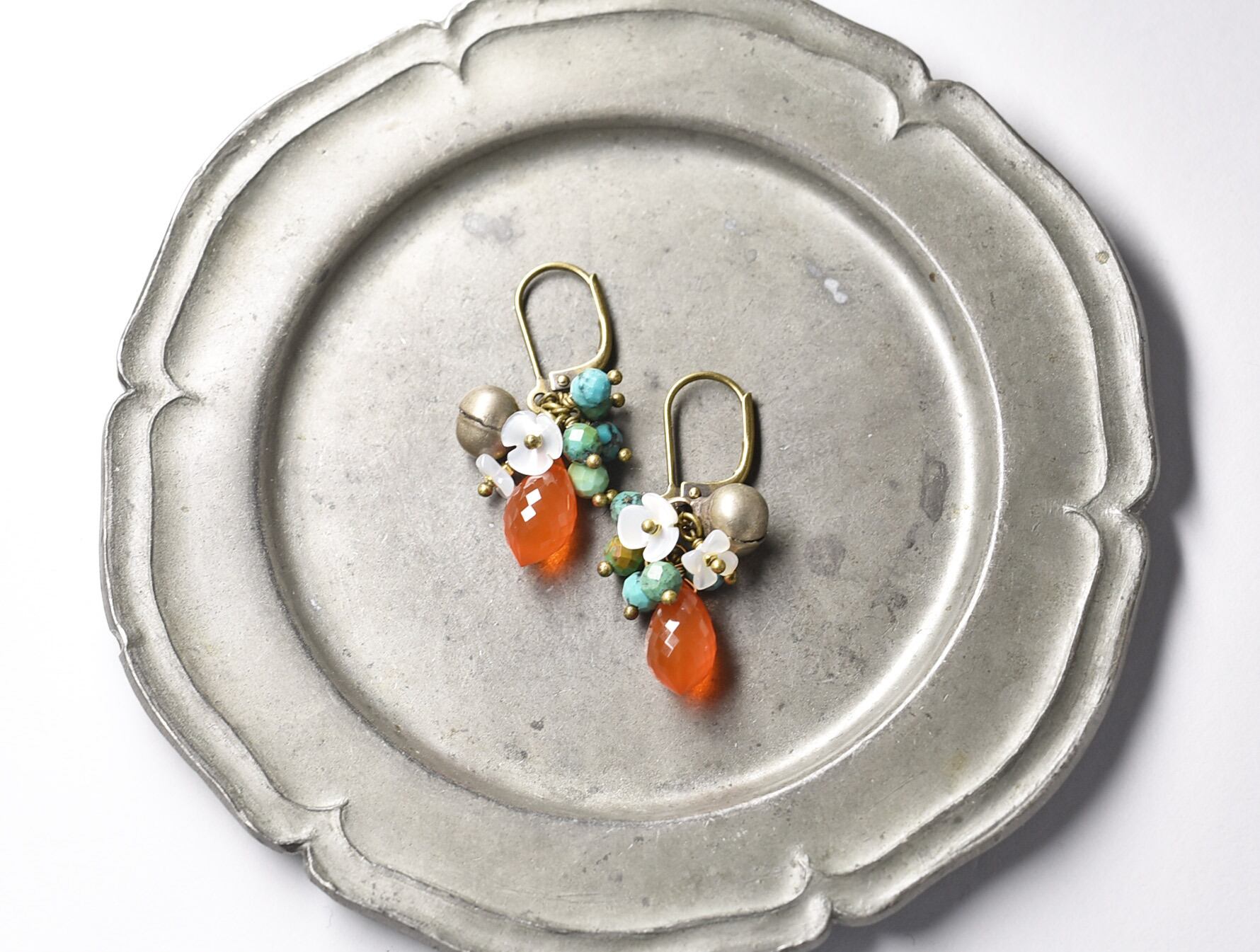 カーネリアンとたわわなグリーンターコイズ、白蝶貝の小花、民族鈴を繋いだピアスです。