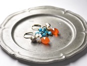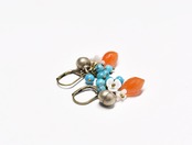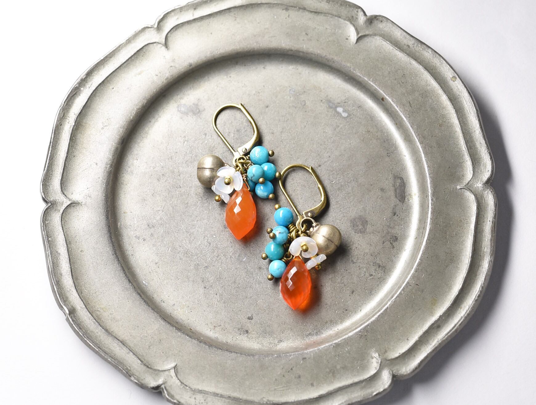 カーネリアンとたわわなスカイブルーターコイズ、白蝶貝の小花、民族鈴を繋いだピアスです。