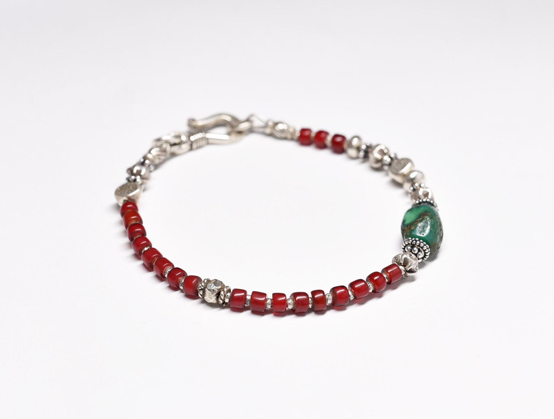 oldチベタンターコイズと濃赤ホワイトハーツ、様々なカレンシルバーを繋いだブレスです。