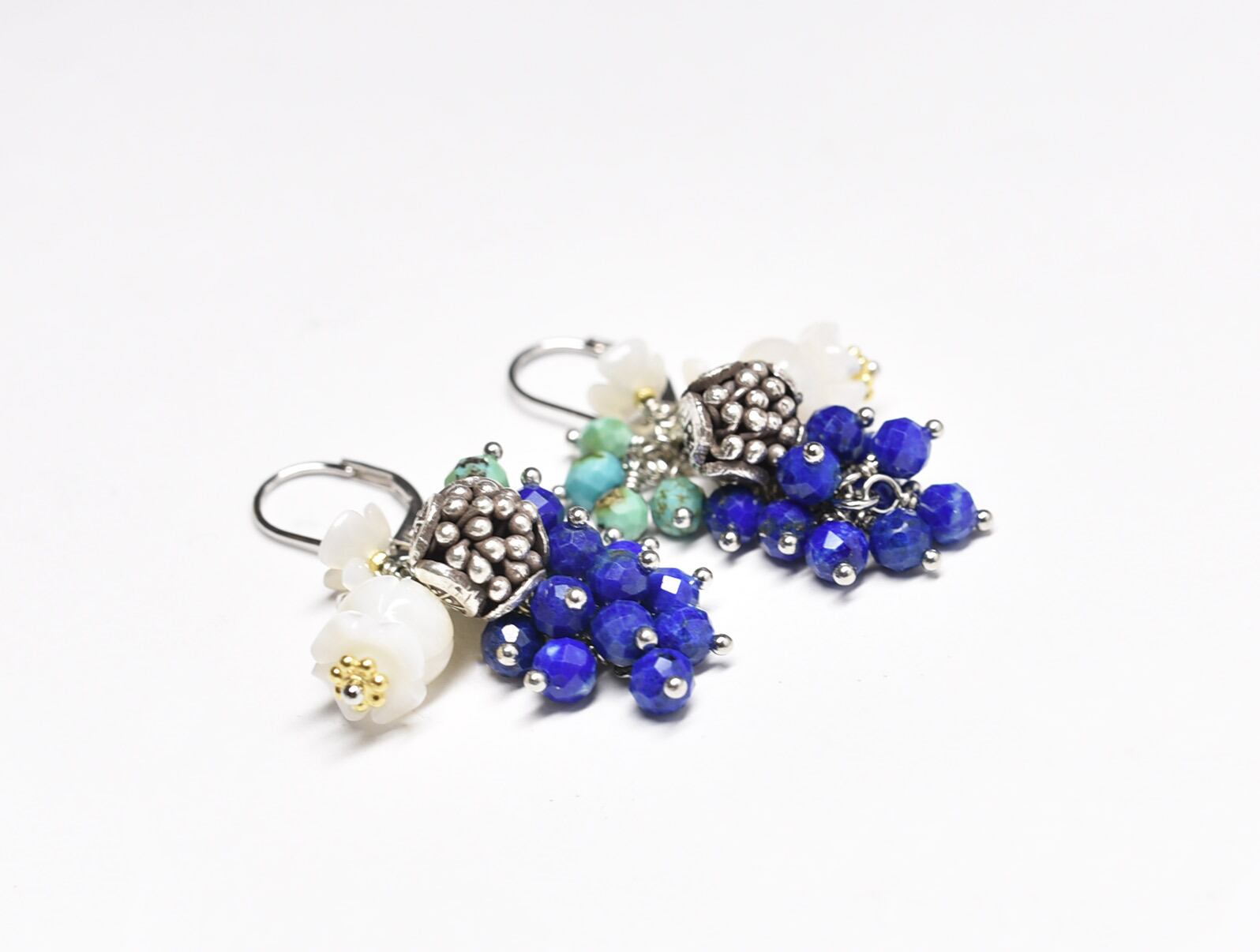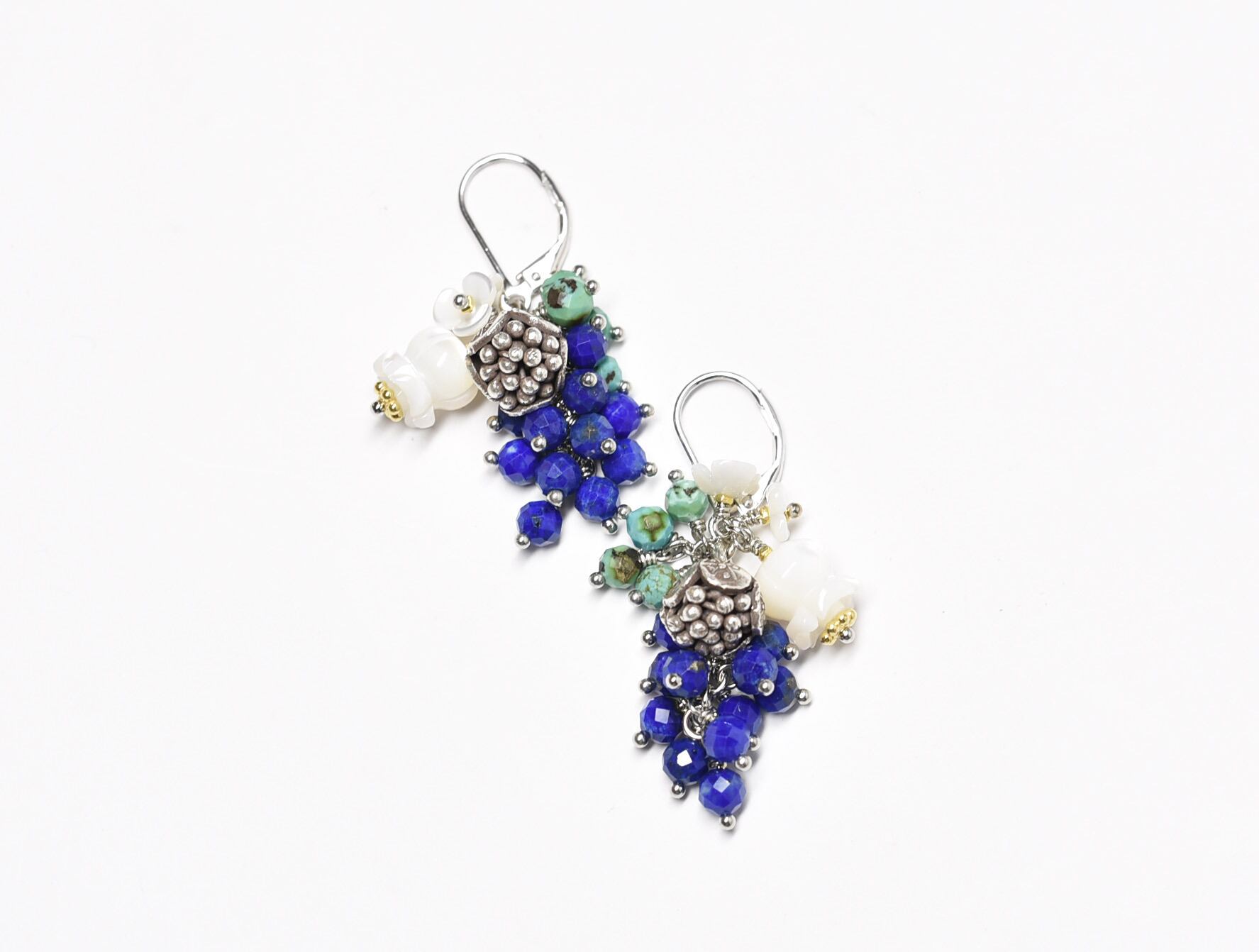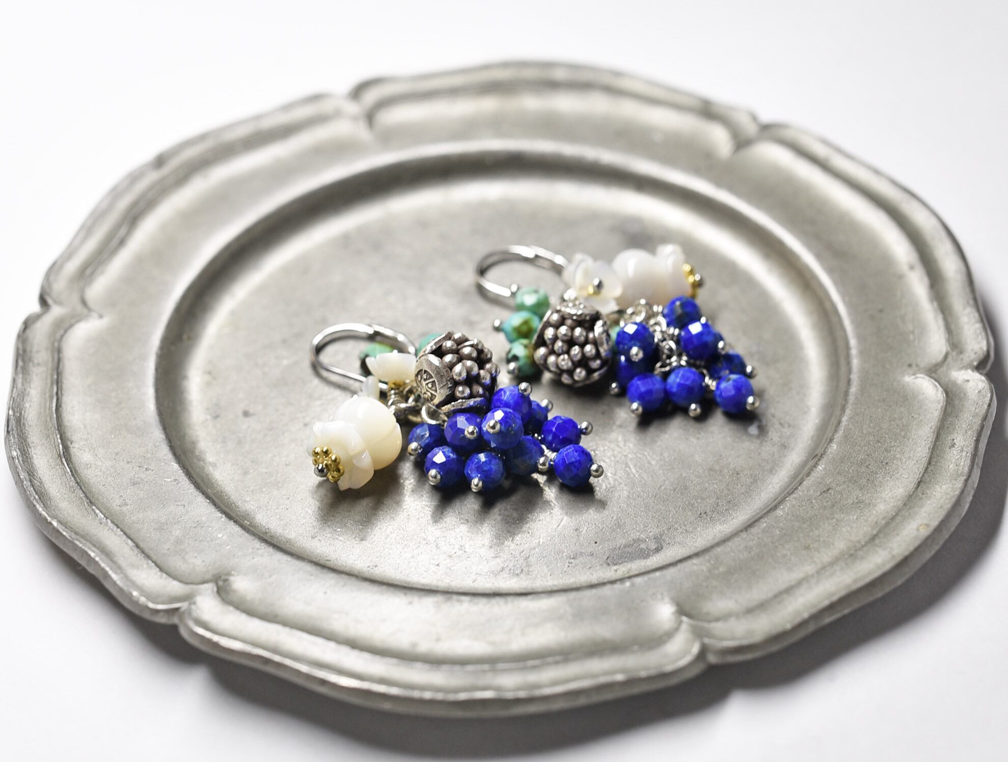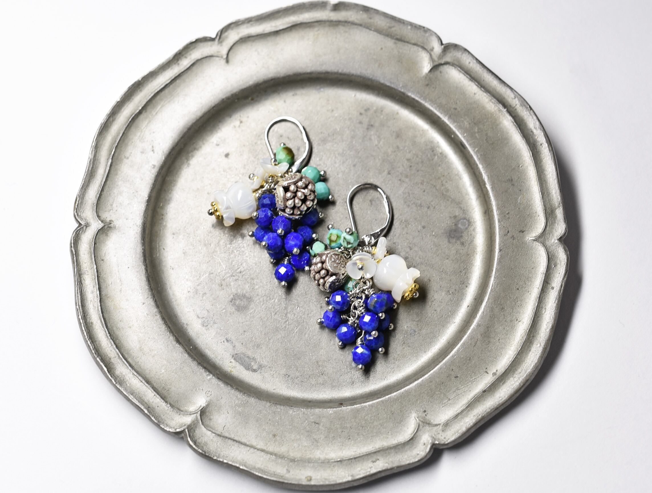 たわわなラピスとターコイズ、白蝶貝のスズランと小花、コロンと丸いお花カレンシルバーのピアス