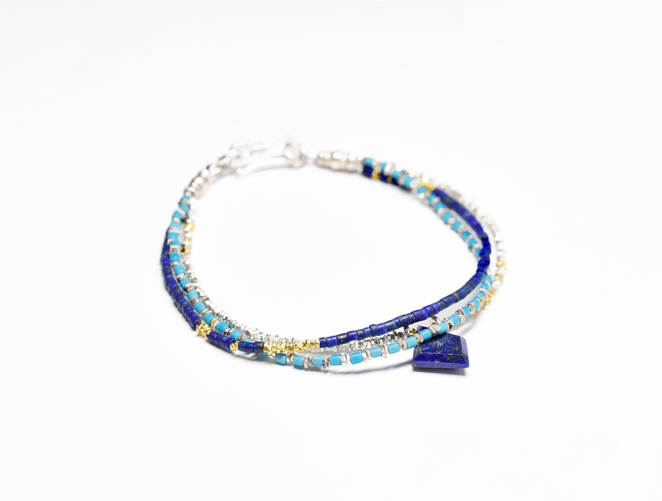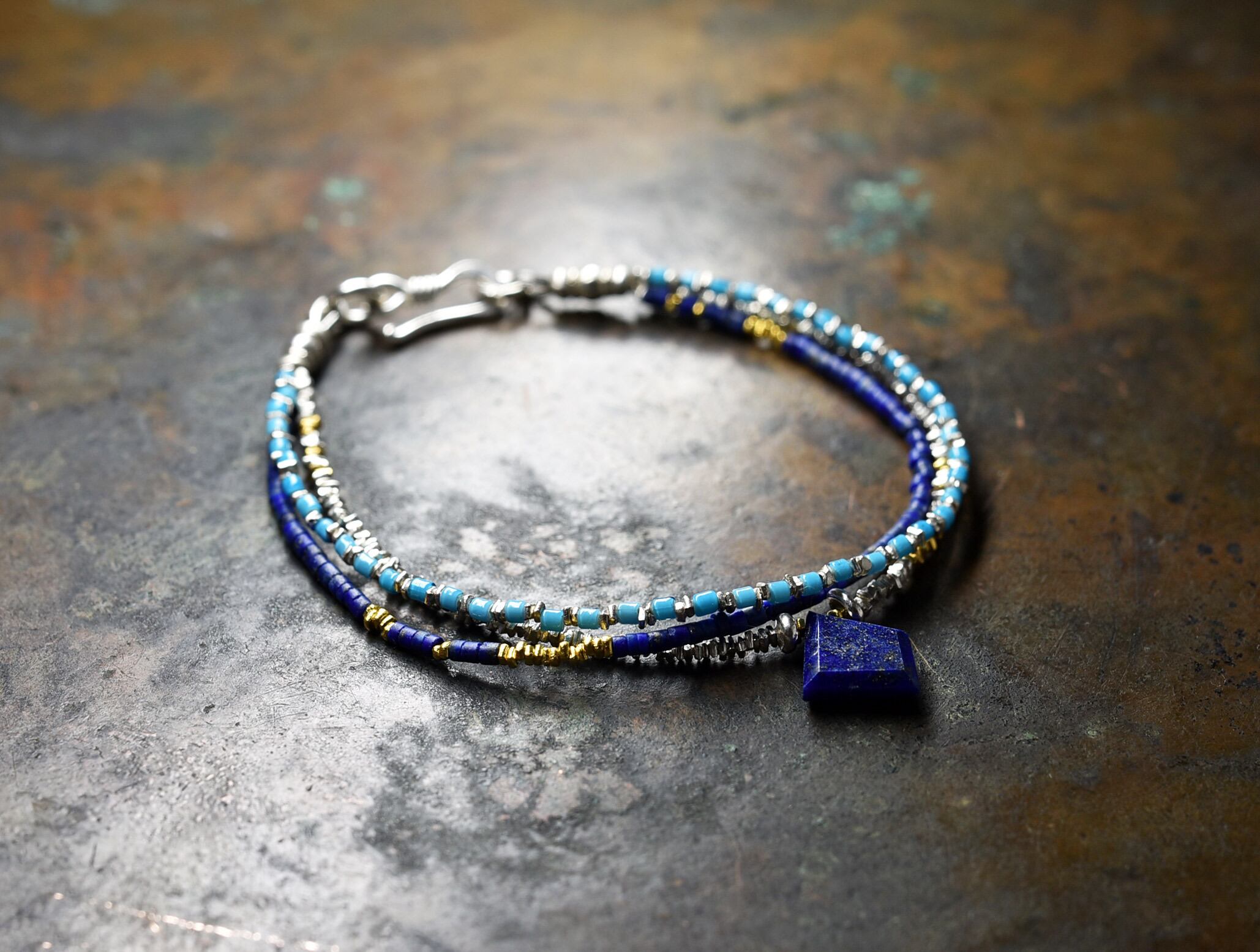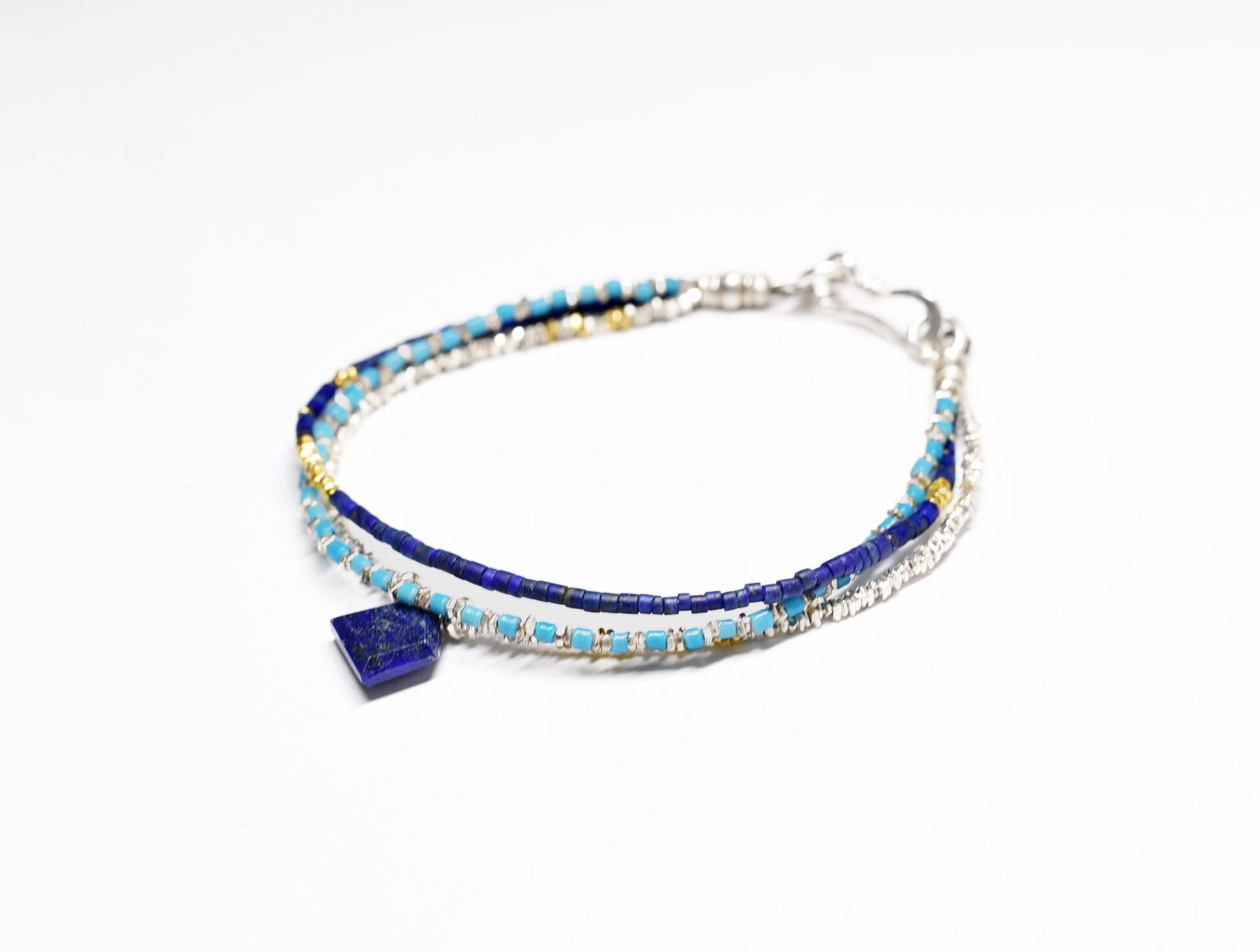 ラピスと、スカイブルーホワイトハーツ、煌めくカレンシルバーの3連ブレス