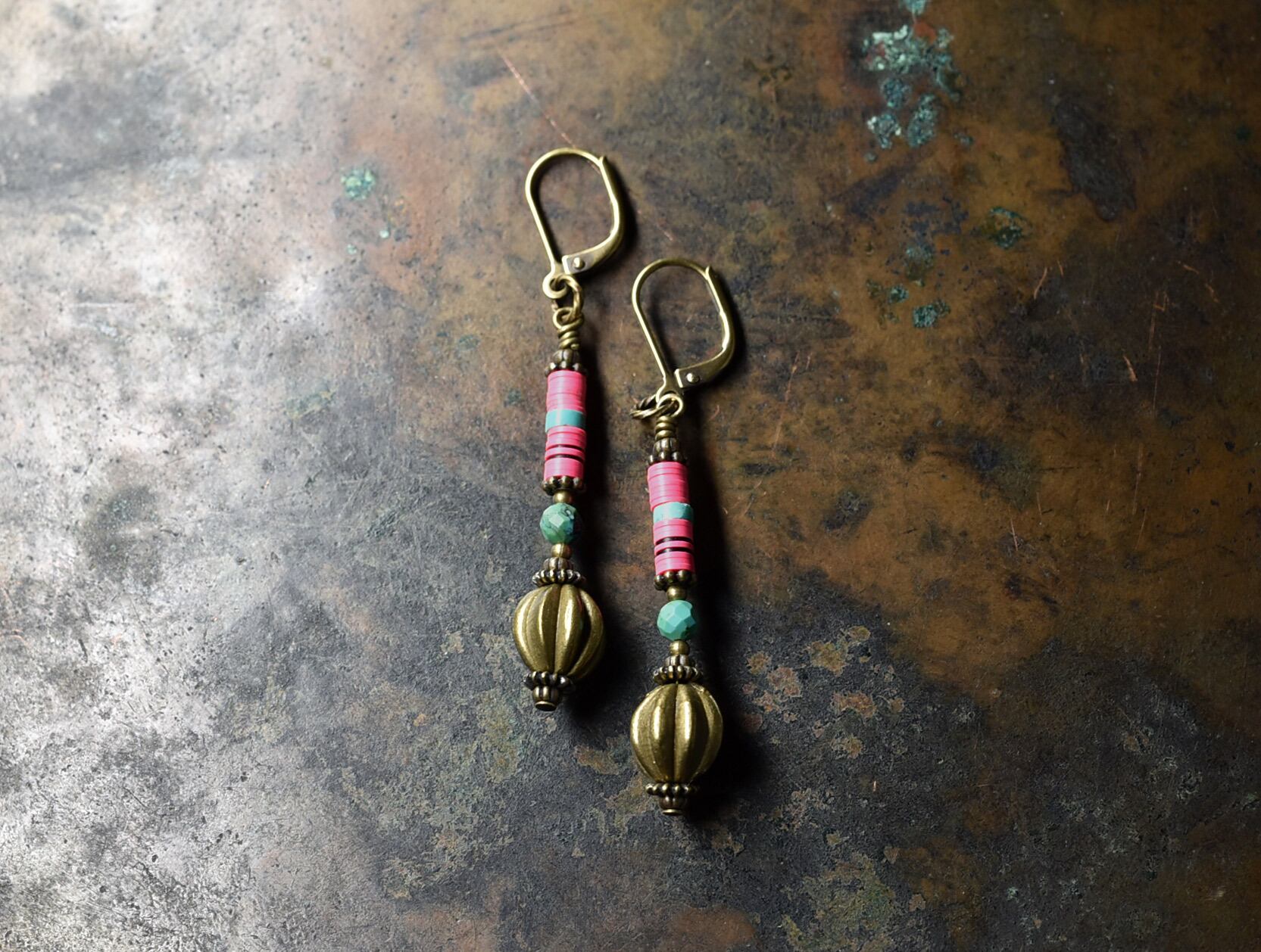 ショッキングピンクレコード盤とスラウェシ島oldブラス、ターコイズを繋いだピアスです。