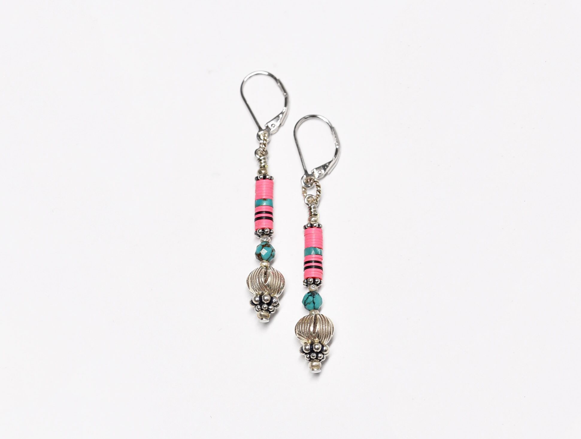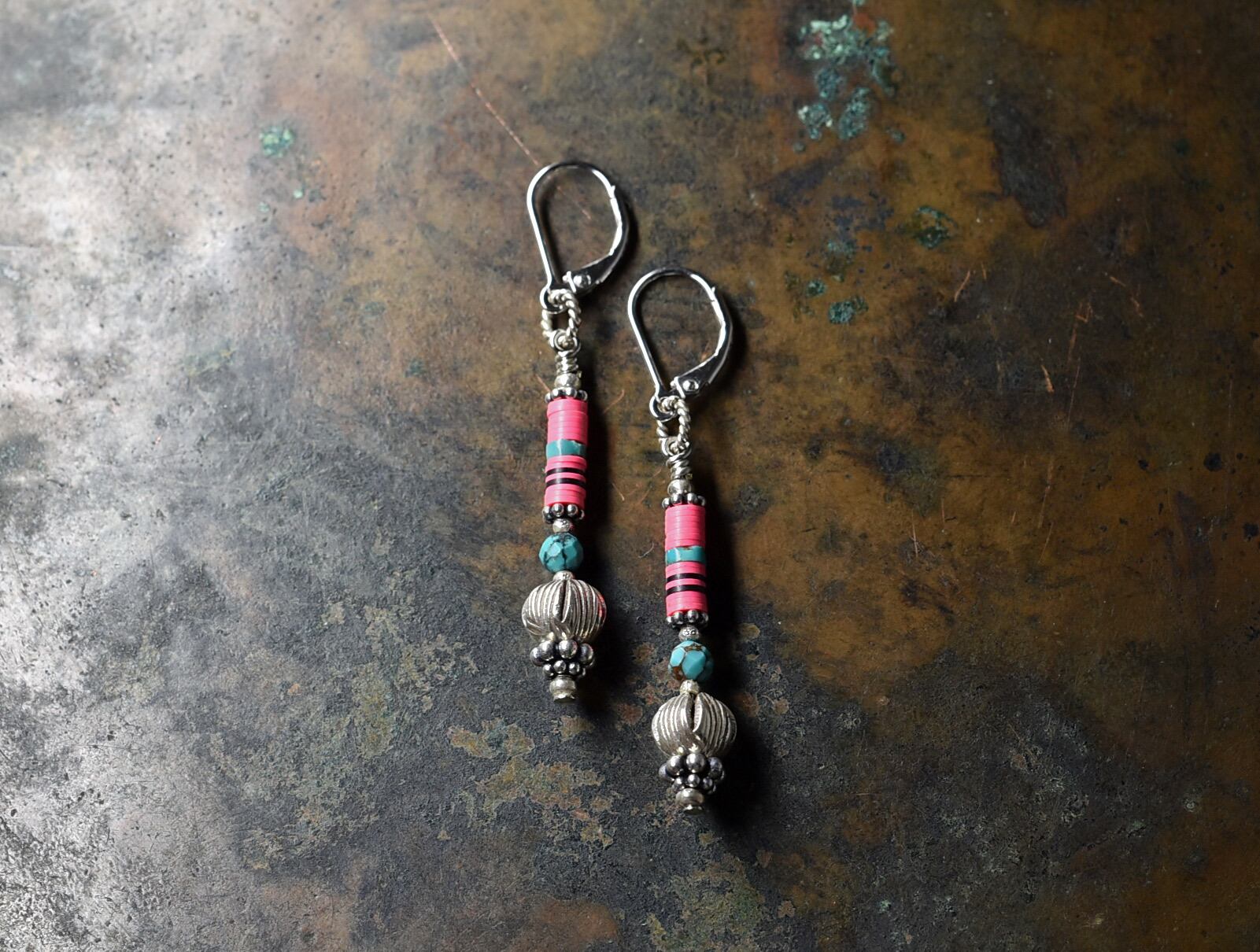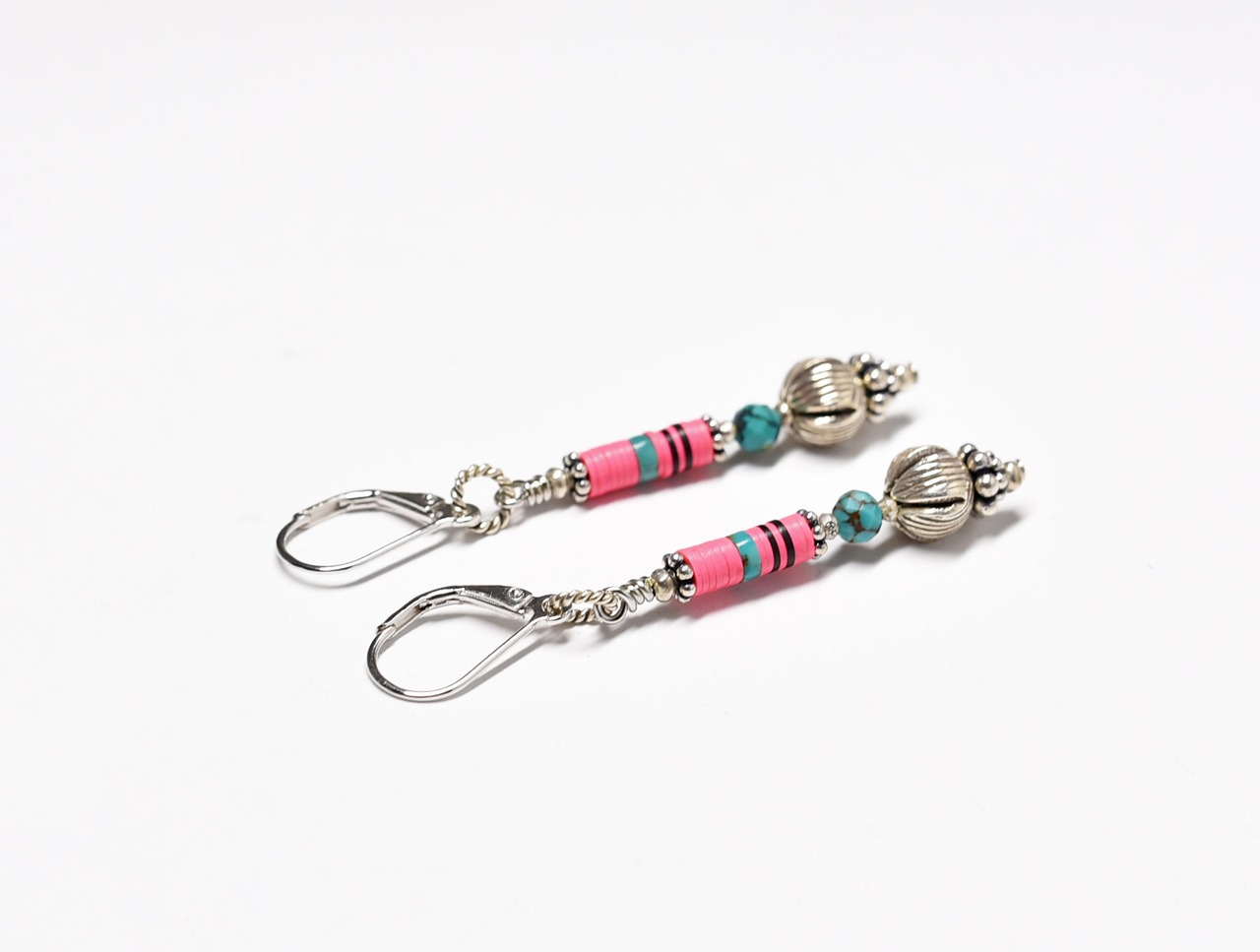 ショッキングピンクレコード盤とカレンシルバー、ターコイズを繋いだピアスです。