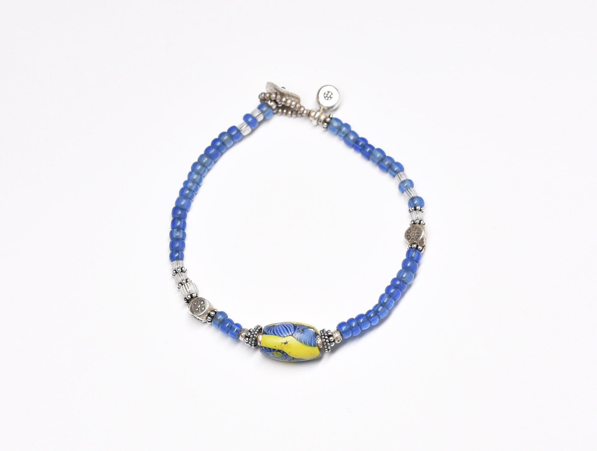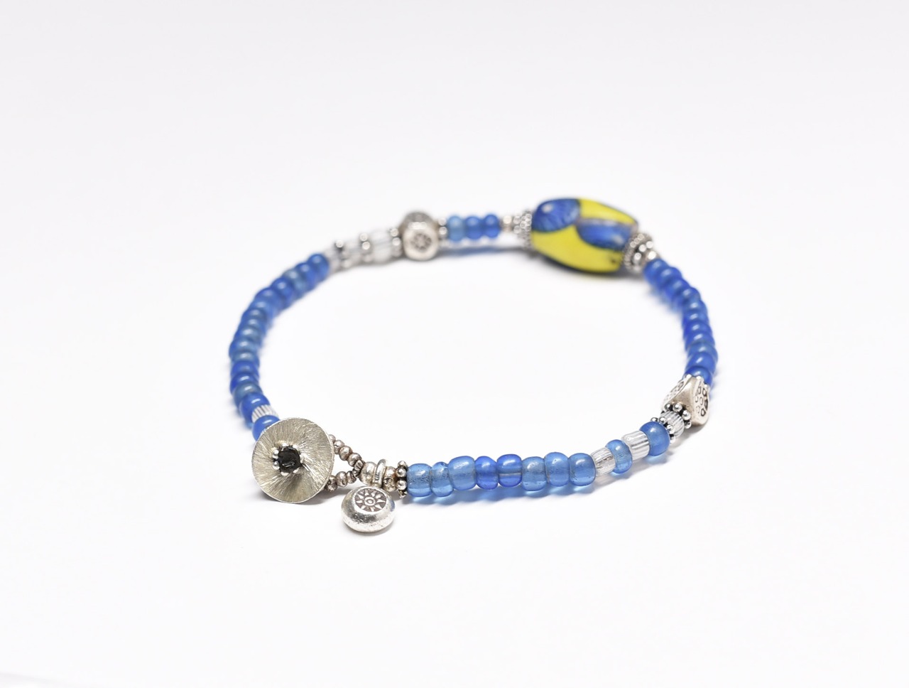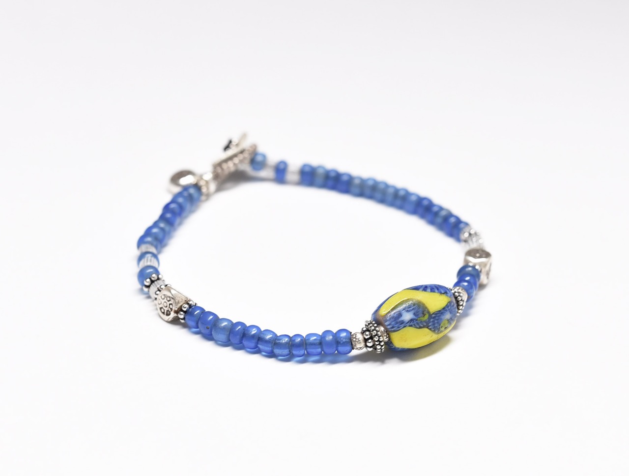 ベネチアアンティークイエローミルフィオリと青藤色ビーズ、カレンシルバーのブレス