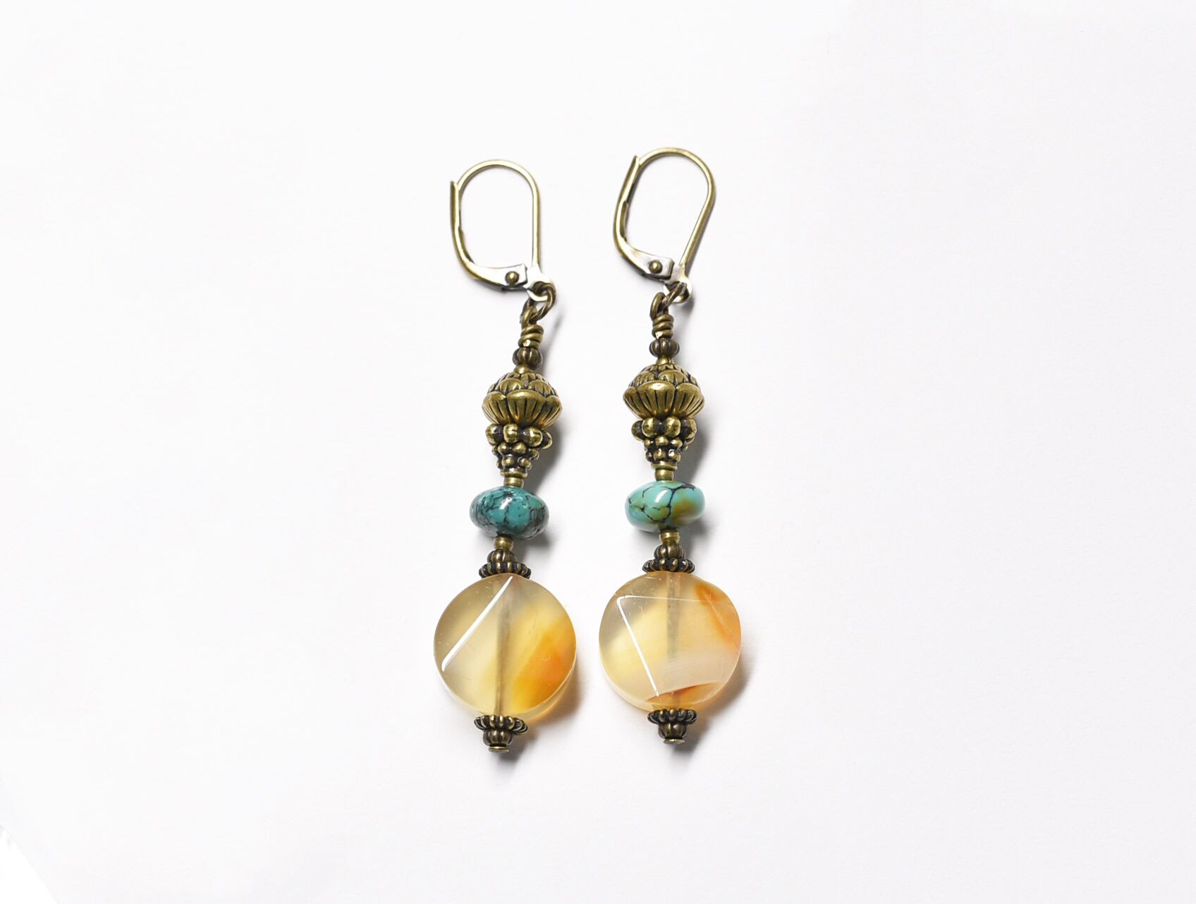 カーネリアンとターコイズ、蓮華ブラスを繋いだアンシメトリーなピアスです。