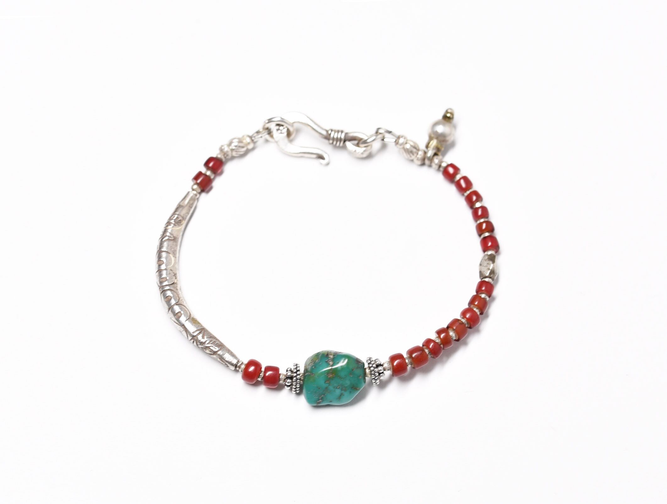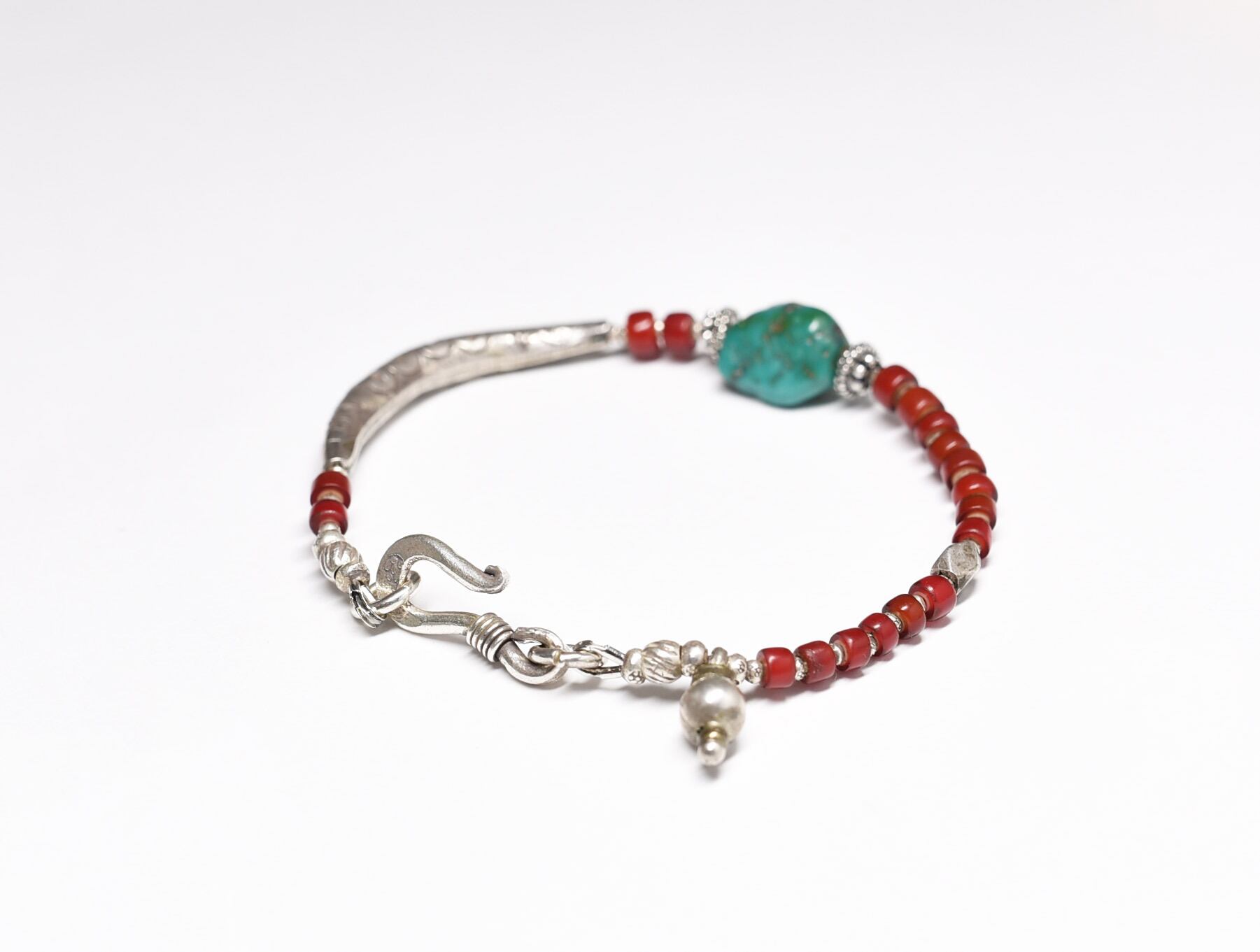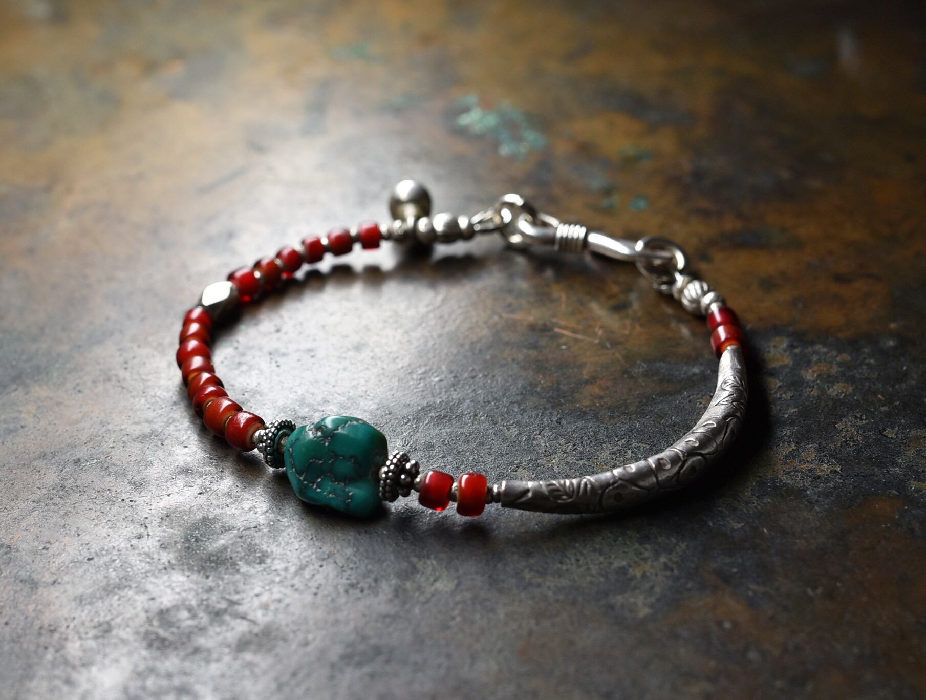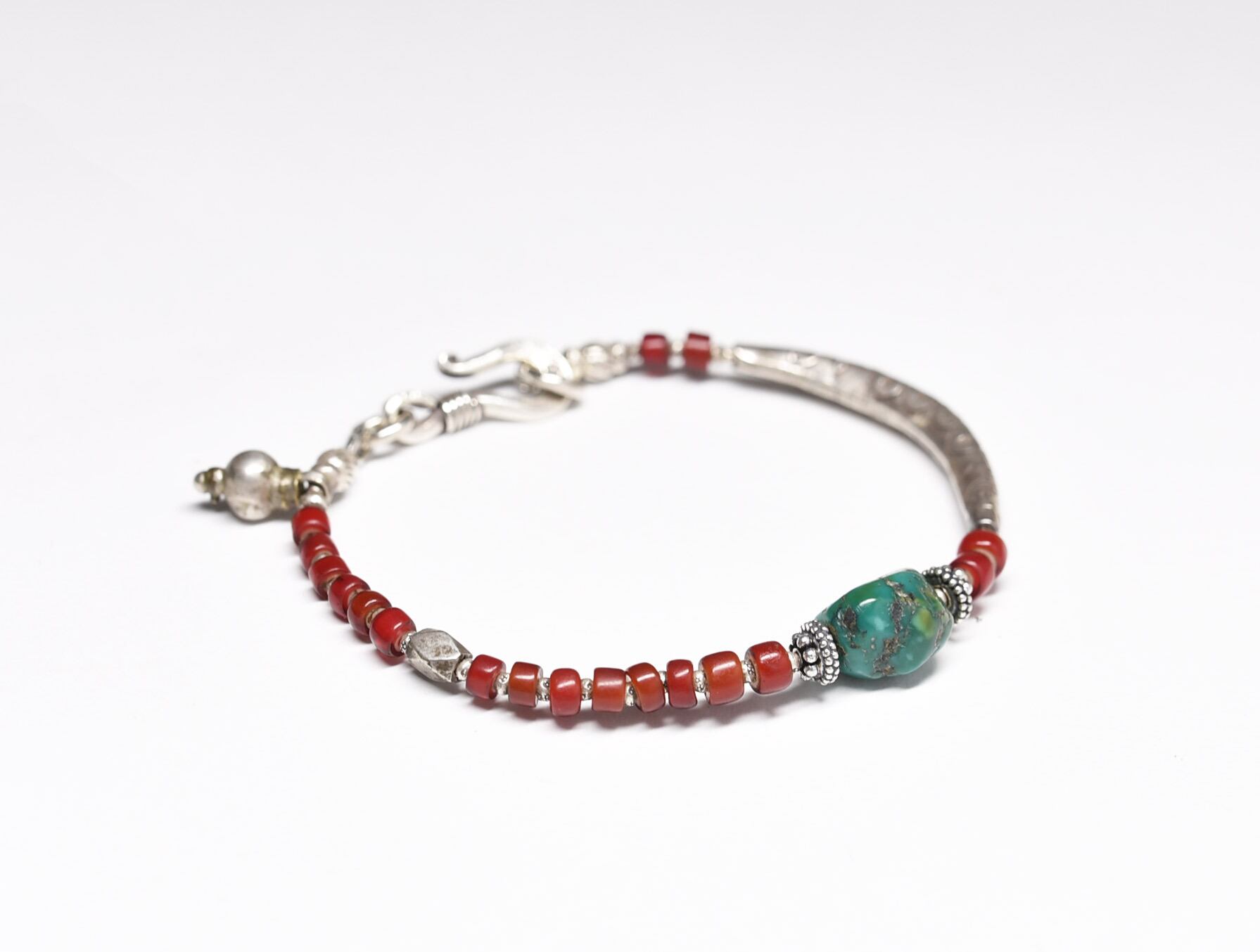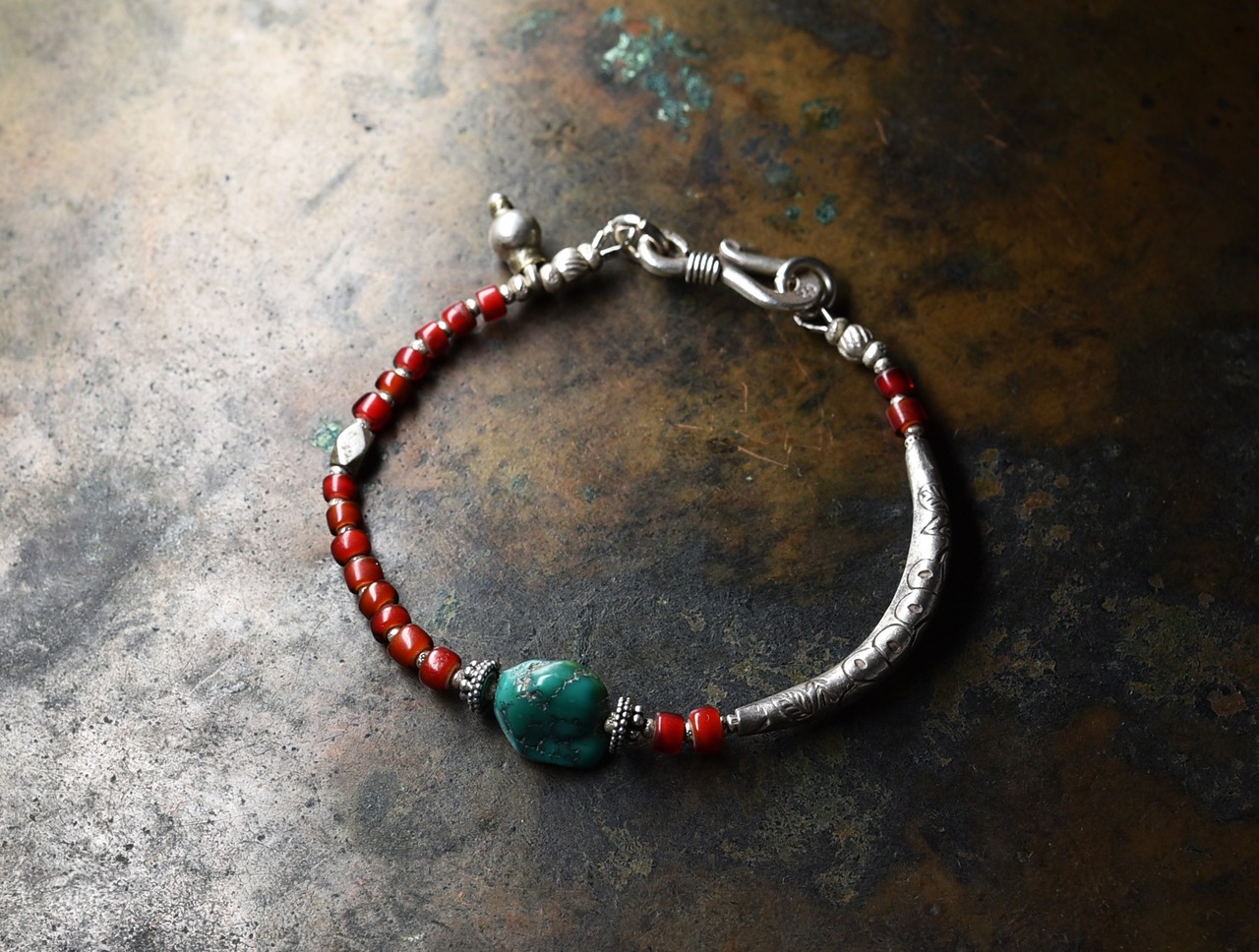 oldチベタンターコイズと濃赤ホワイトハーツ、oldチンシルバー、湾曲したカレンシルバーなどで繋いだブレスです。