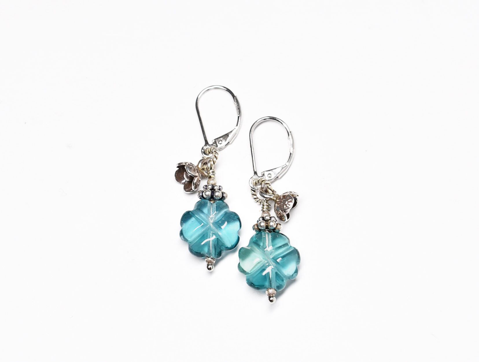 よつばのクローバ型ブルーグリーンフローライトと小さなカレンシルバーのお花を繋いだピアスです。