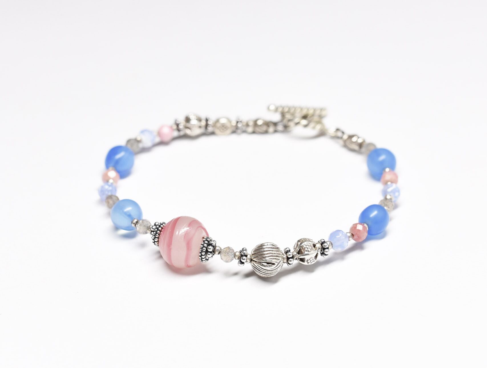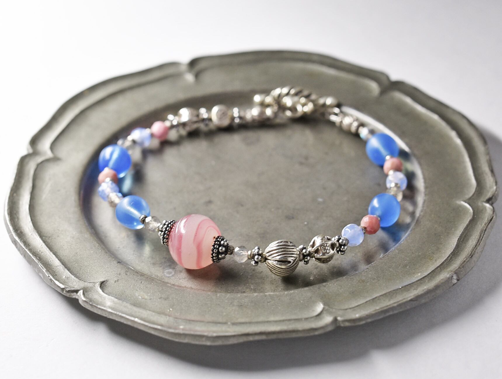 アンティーク金赤マーブルビーズと青藤色ビーズ、ロードナイト、ラブラドライト、ブルー瑪瑙、カレンシルバーのブレス