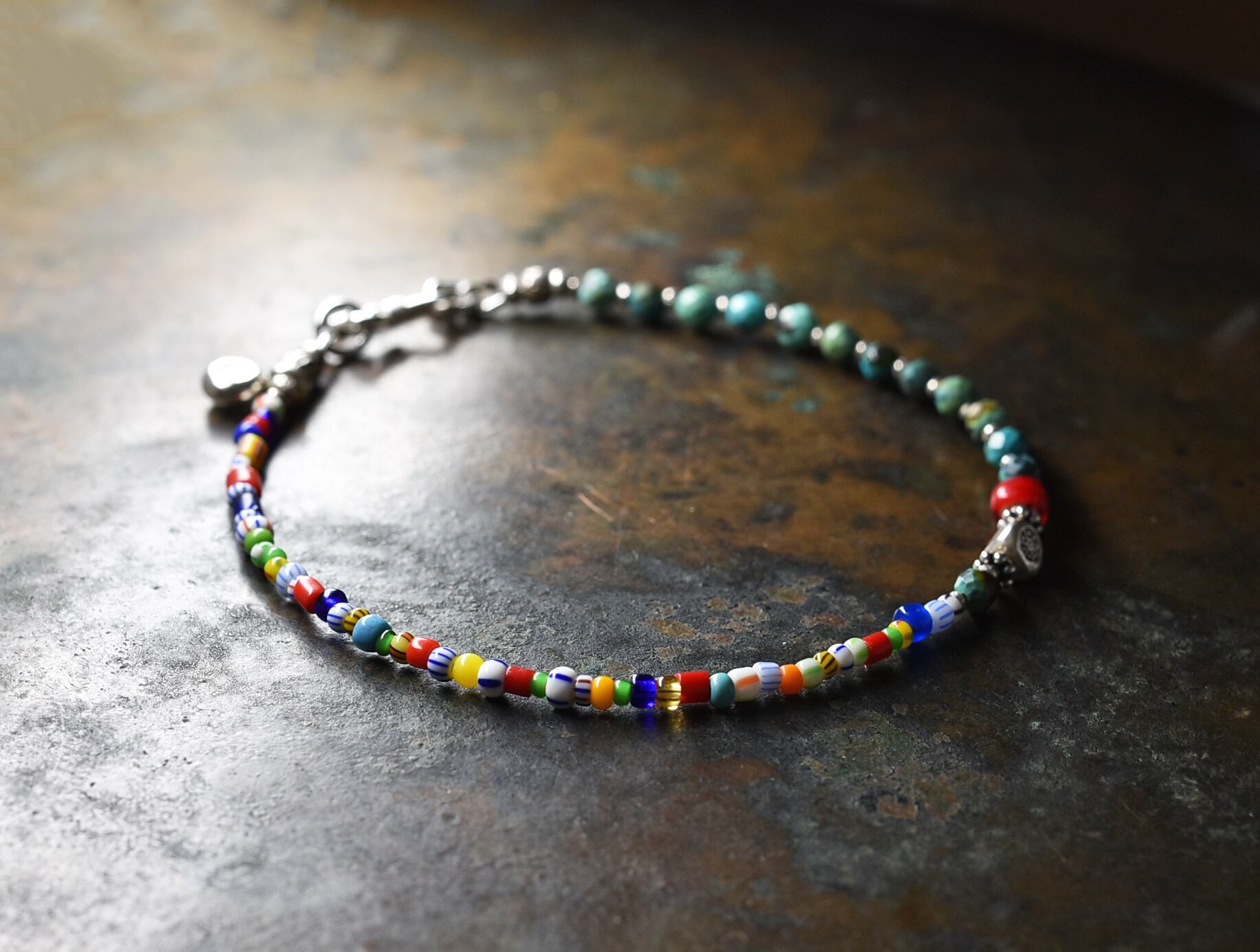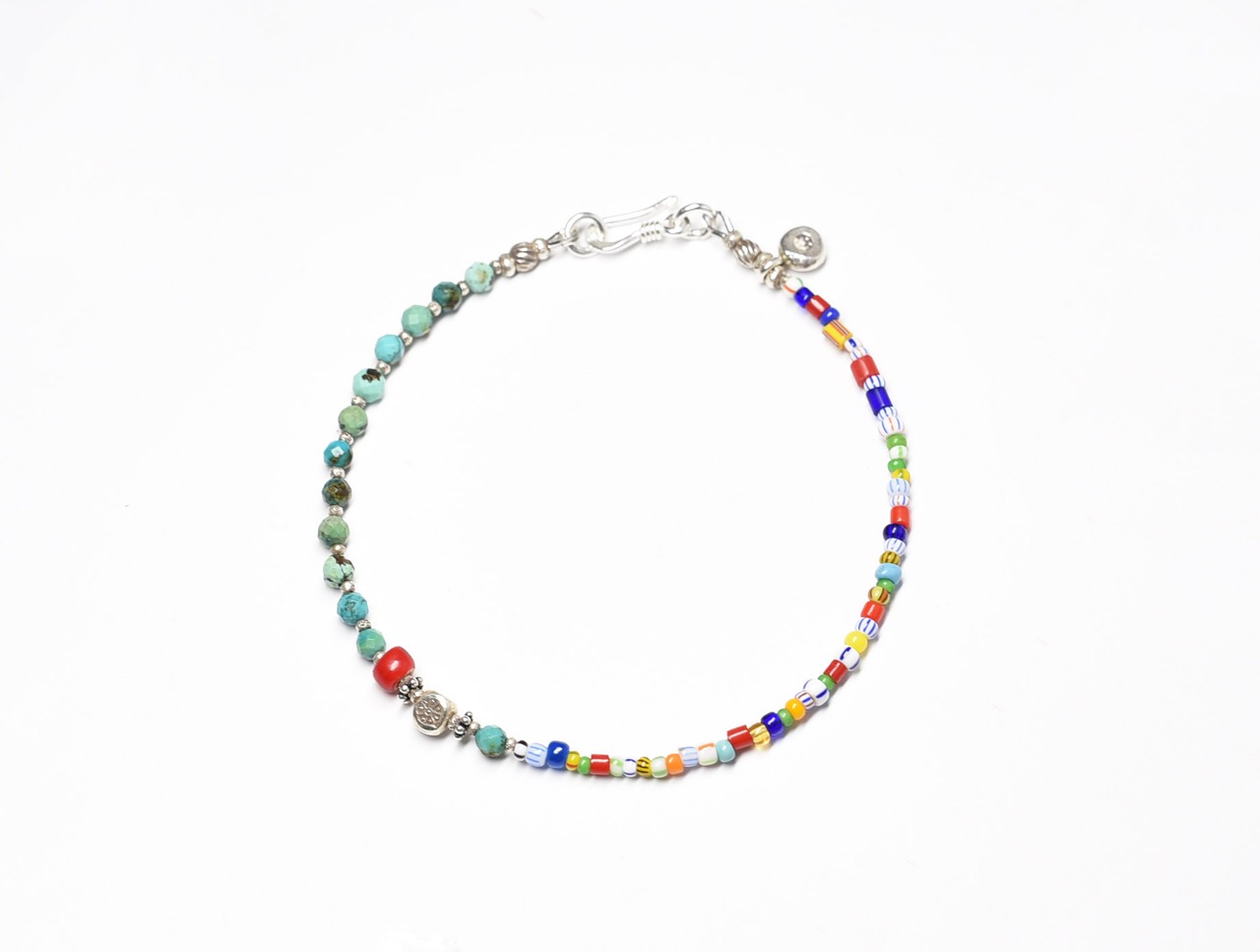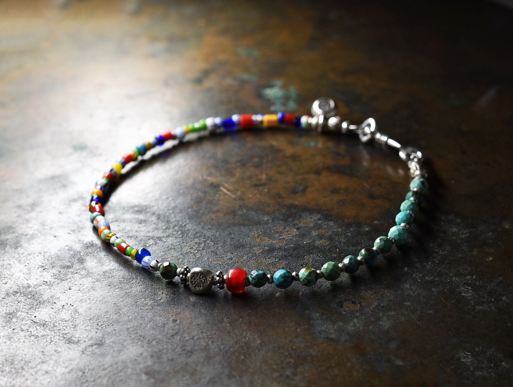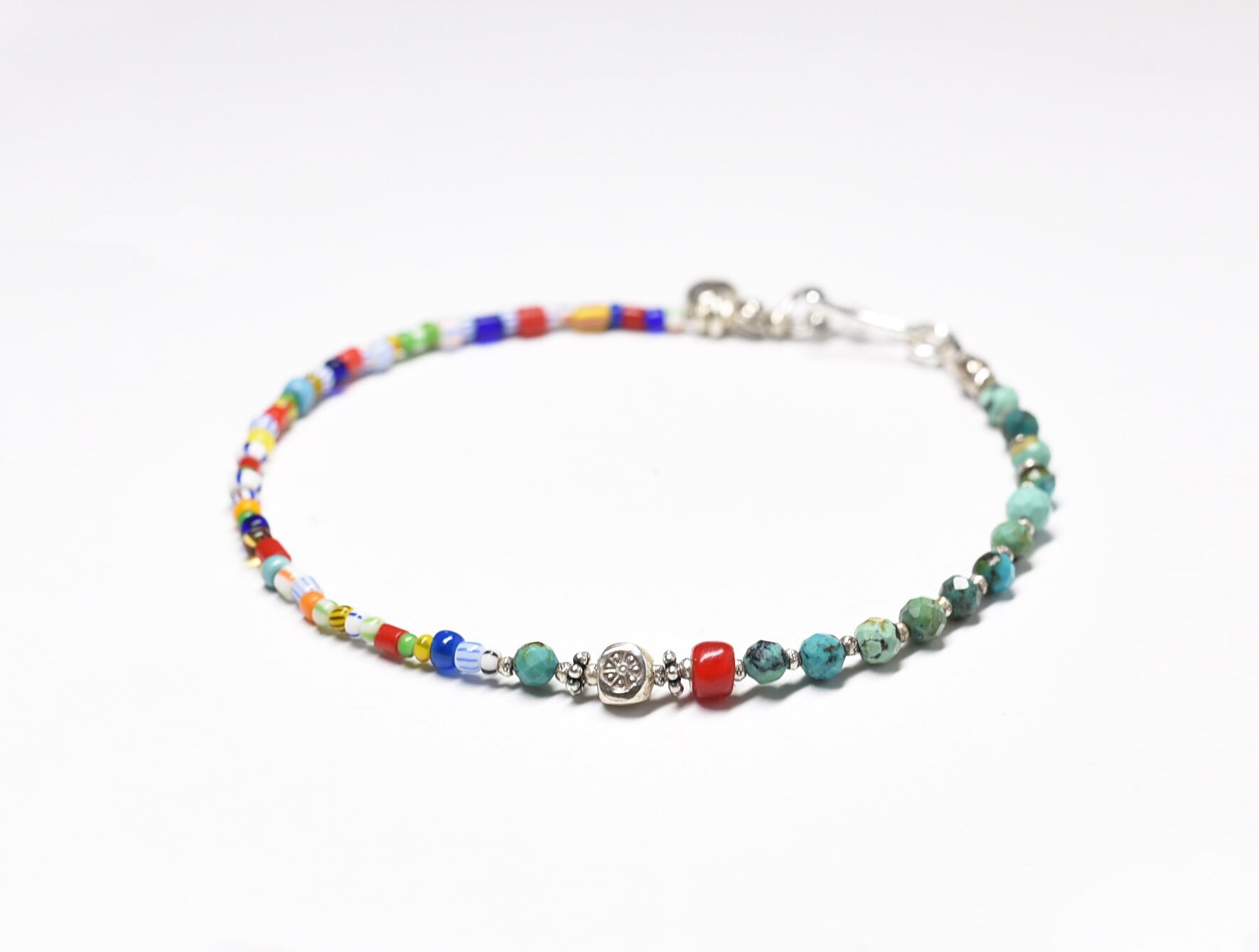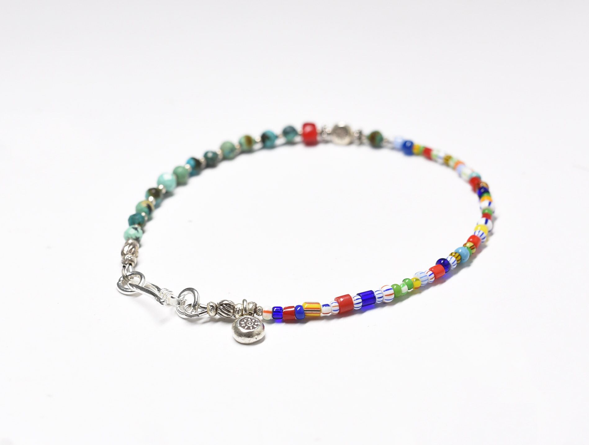 クリスマスビーズとターコイズ、カレンシルバーを繋いだカラフルなアンクレットです。