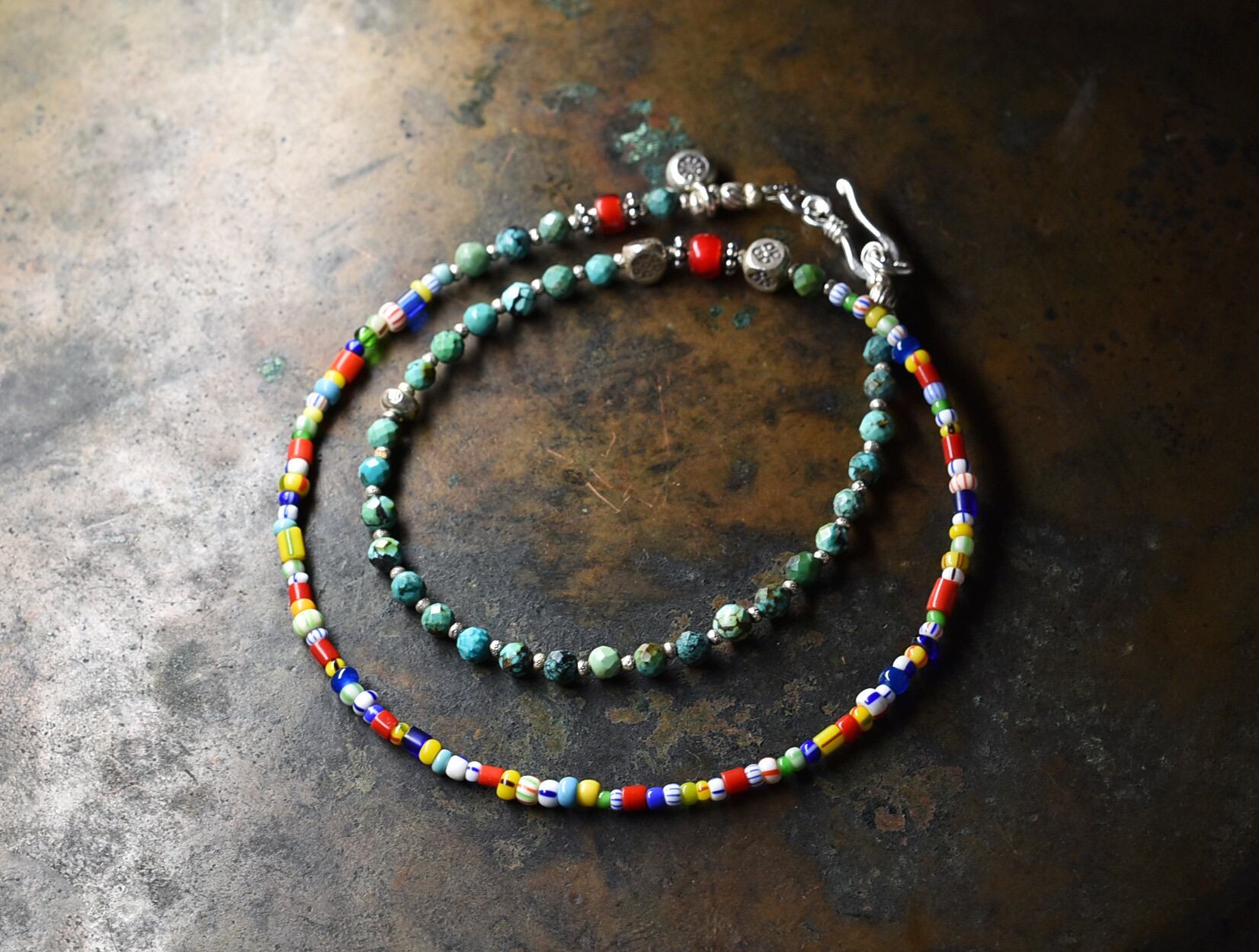 クリスマスビーズとターコイズ、カレンシルバーを繋いだカラフルなネックレスです。