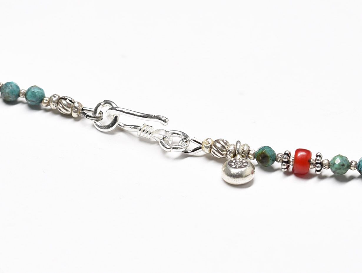 太陽のような模様が施されたチャーム、三角形のビーズ、ターコイズの間のビーズ、留め金部分はカレンシルバーです。