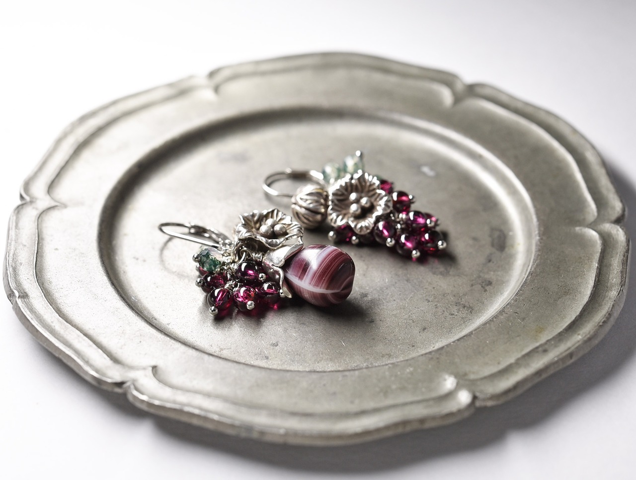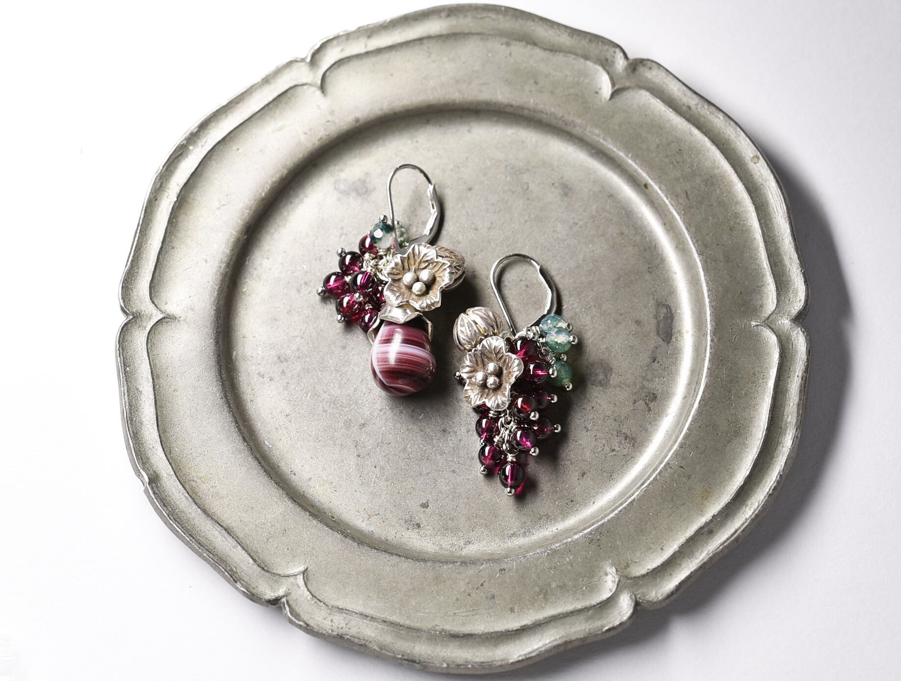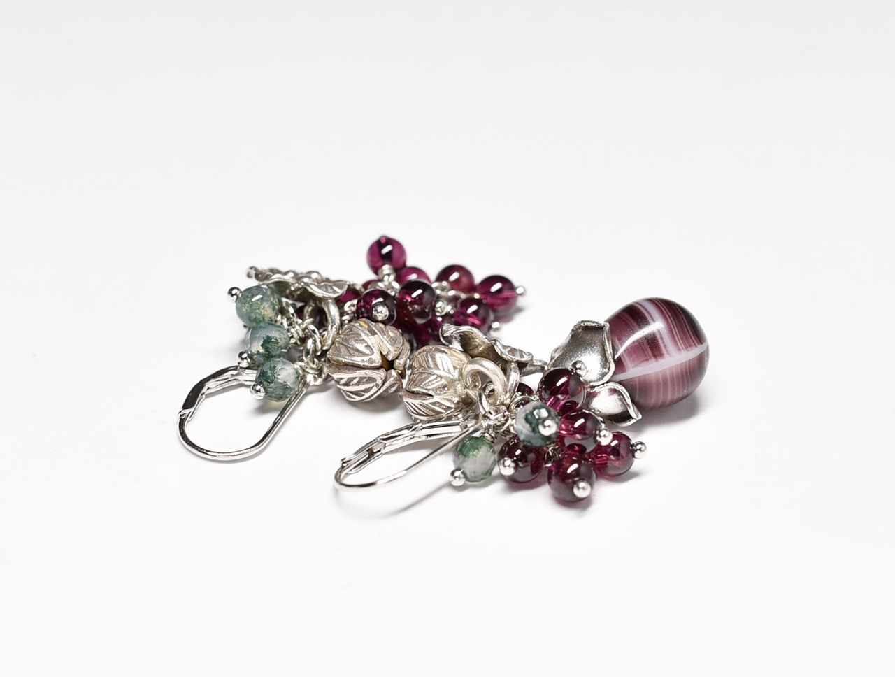 丸いガーネットとカットが施されたモスアゲートをたわわに実らせました。