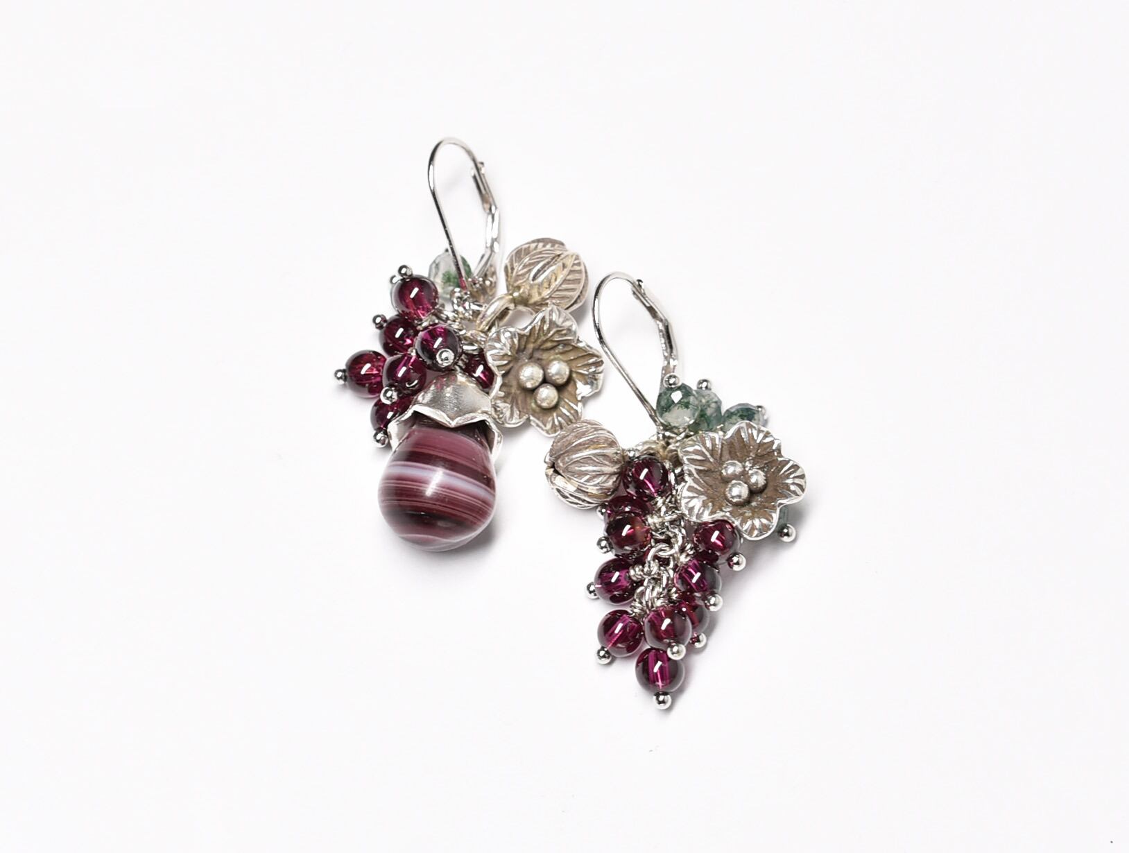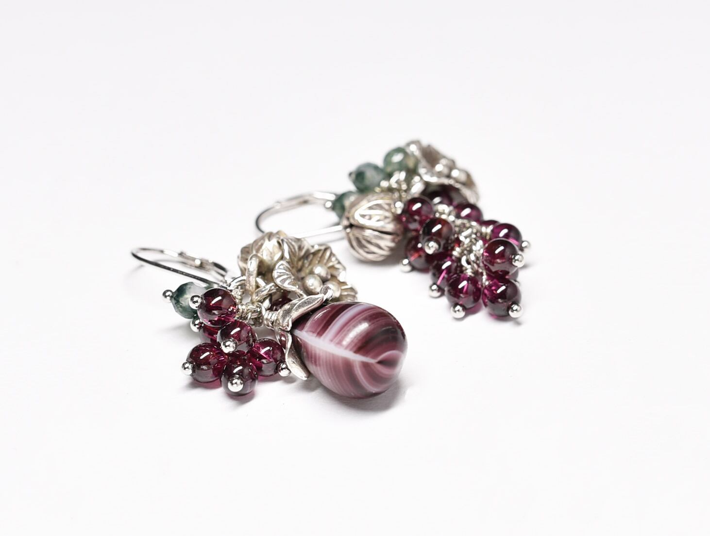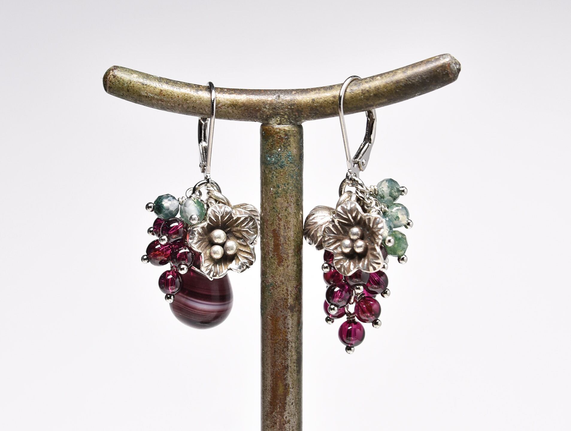 丸いガーネットとカットが施されたモスアゲートをたわわに実らせました。