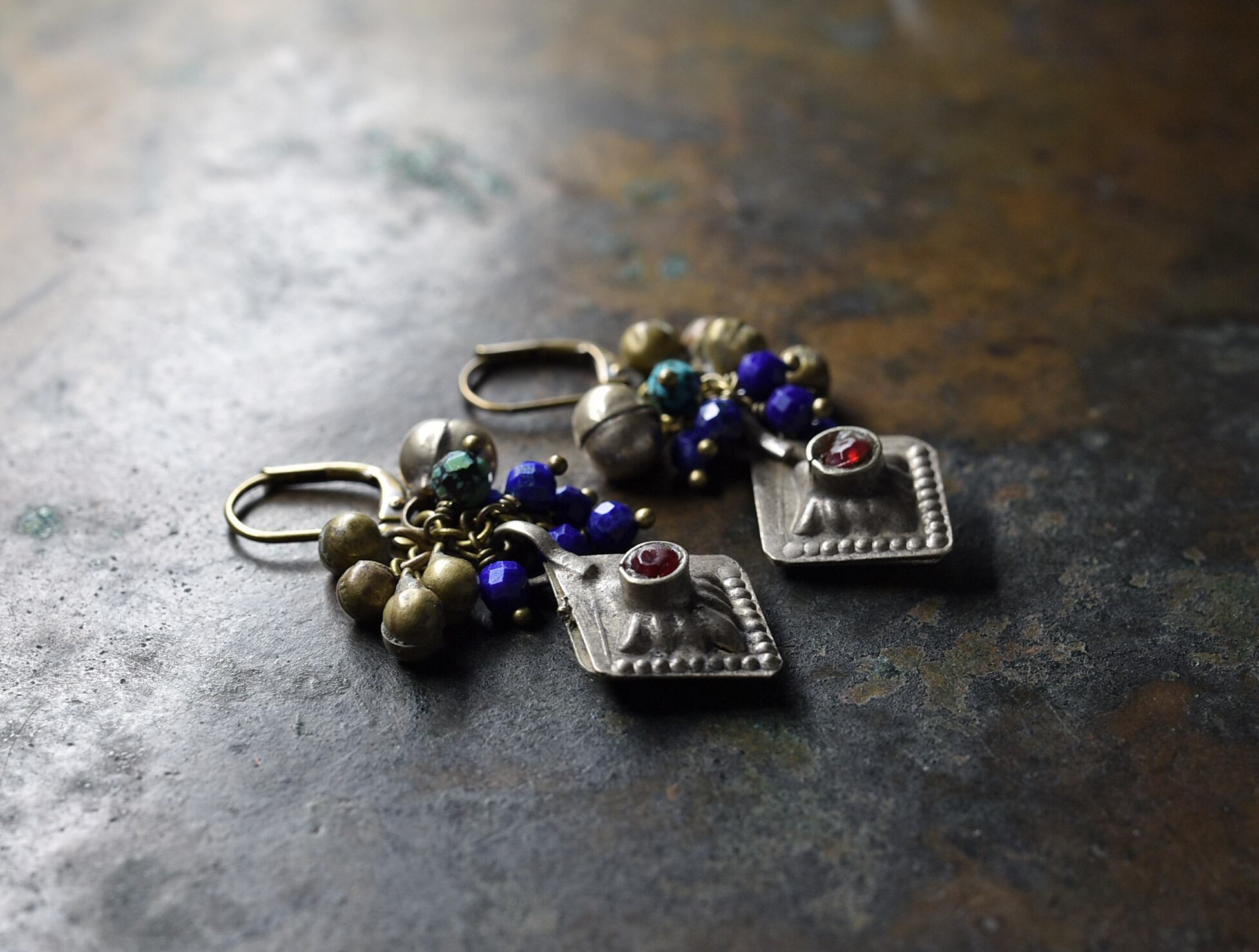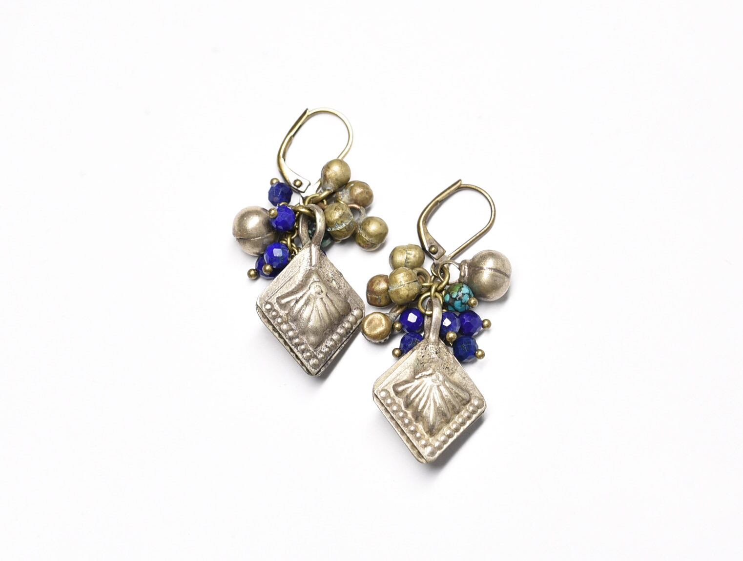 クチ族メタルパーツとたわわなラピス、ターコイズ、民族鈴を繋いだピアスです。