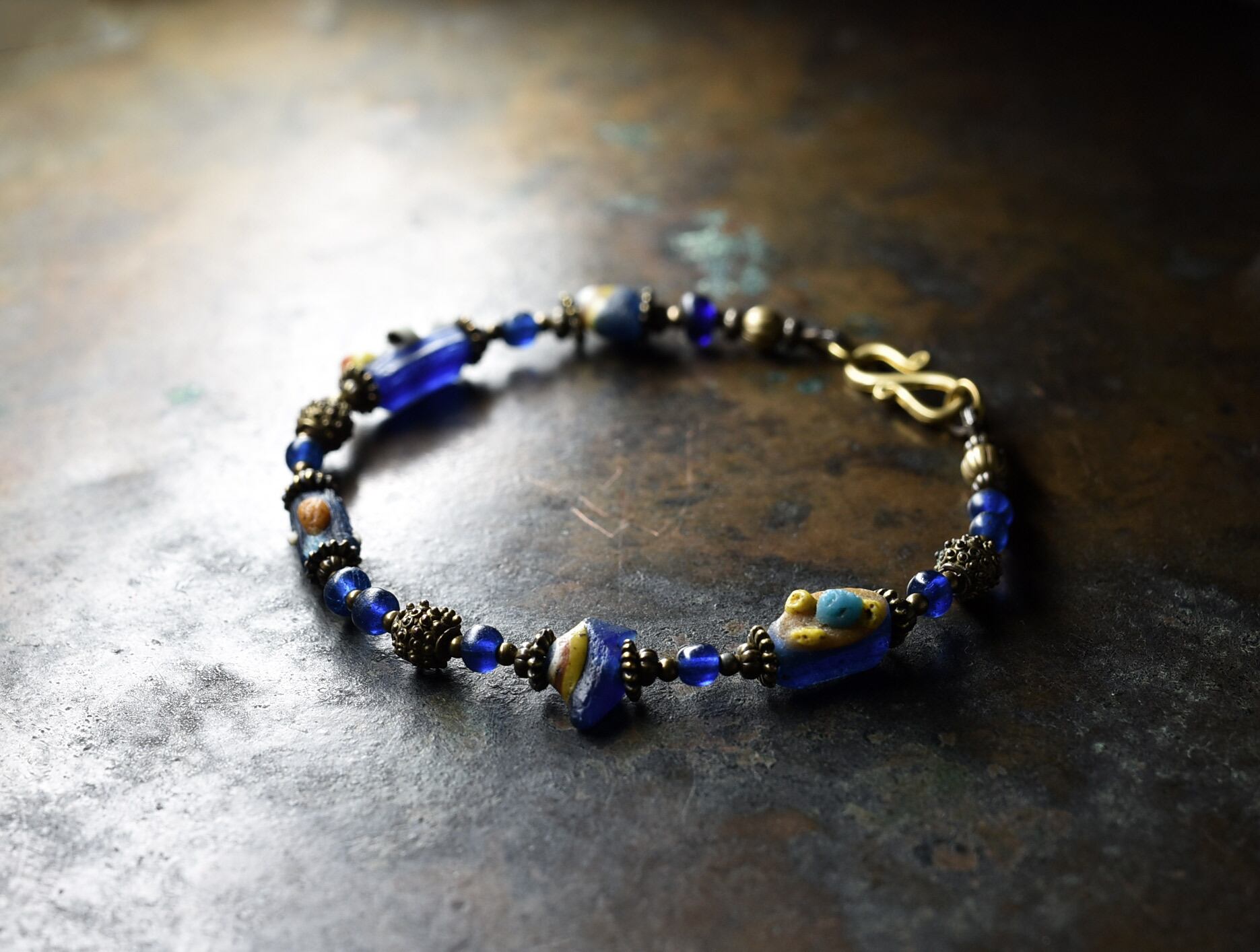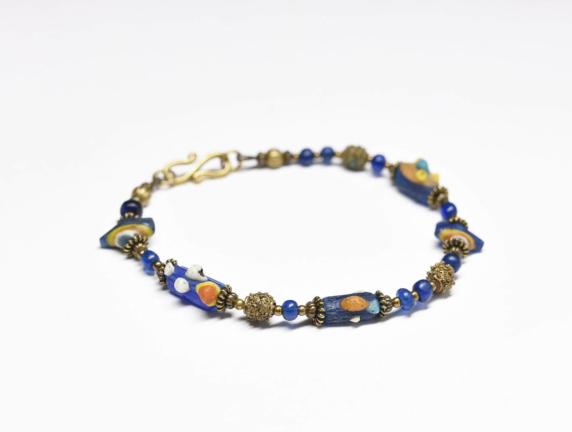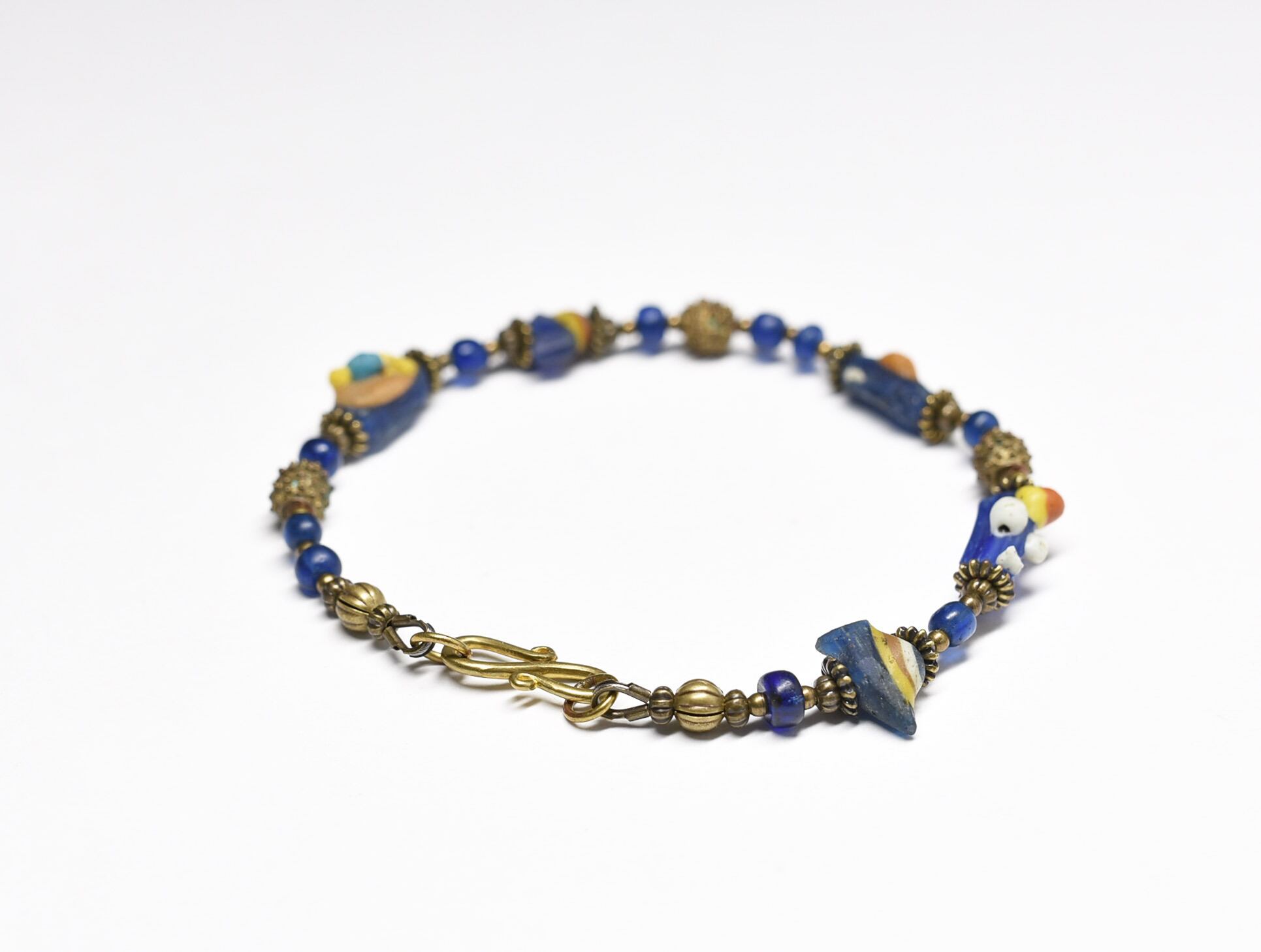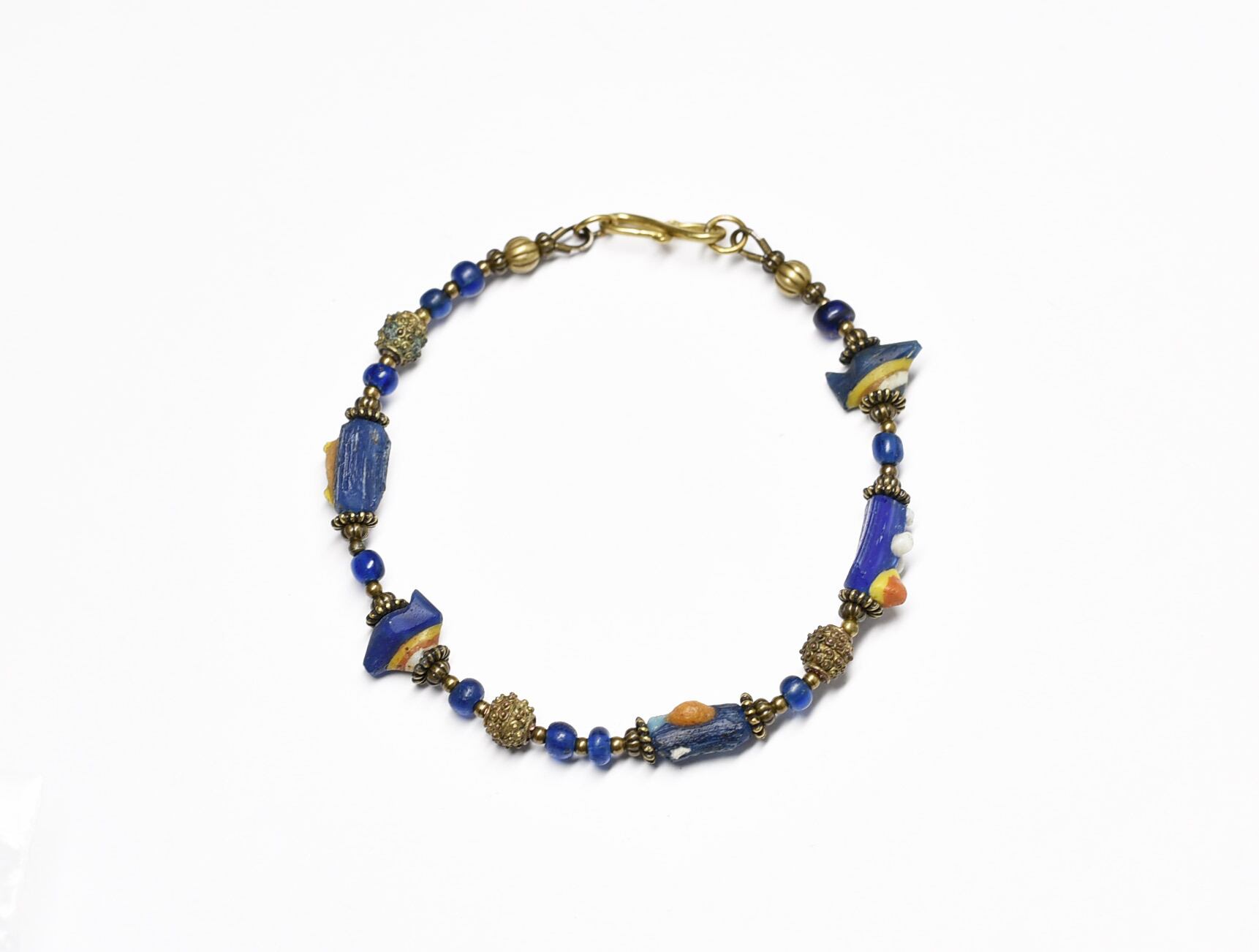 小鳥とモザイク模様ローマングラスとベニン族ツブツブブラス、ブルービーズのブレス