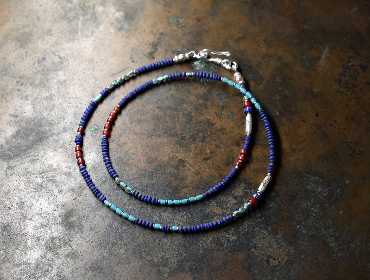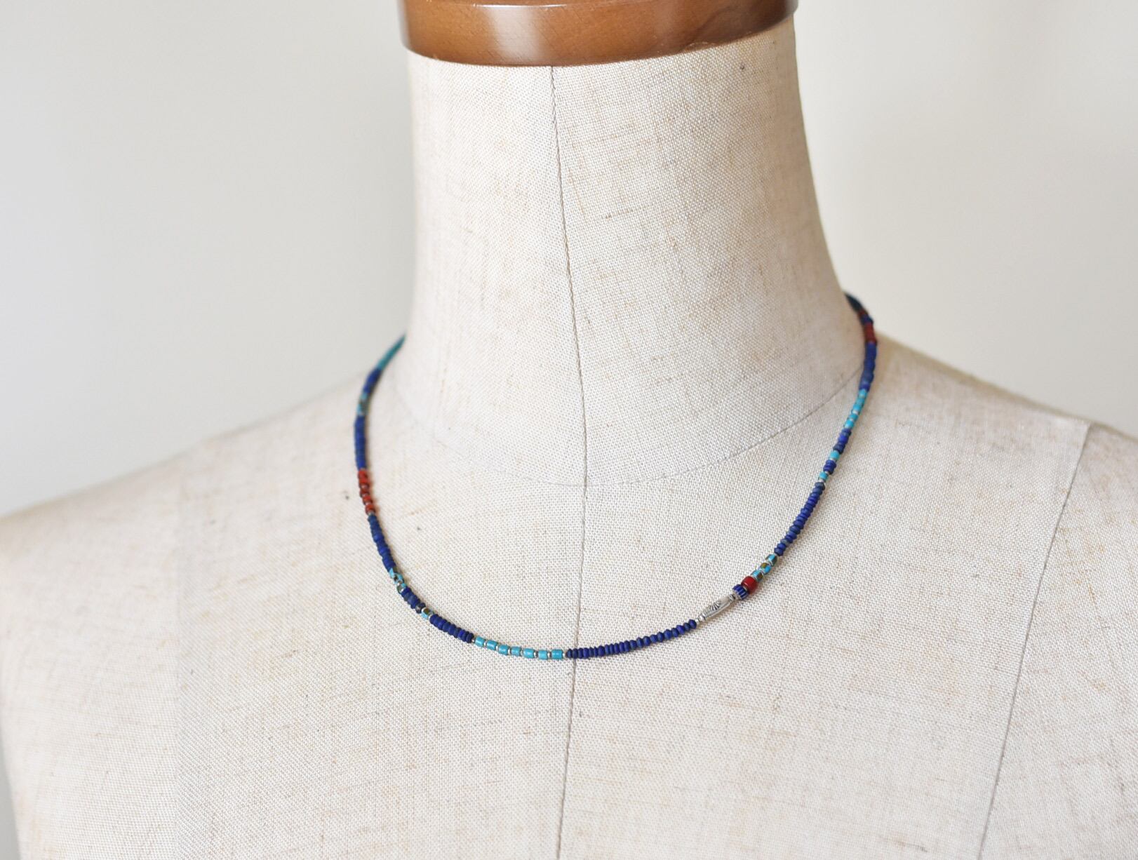 ラピス、3種類のホワイトハーツ、シェブロンビーズ、カレンシルバーを繋いだ華奢なネックレスです。