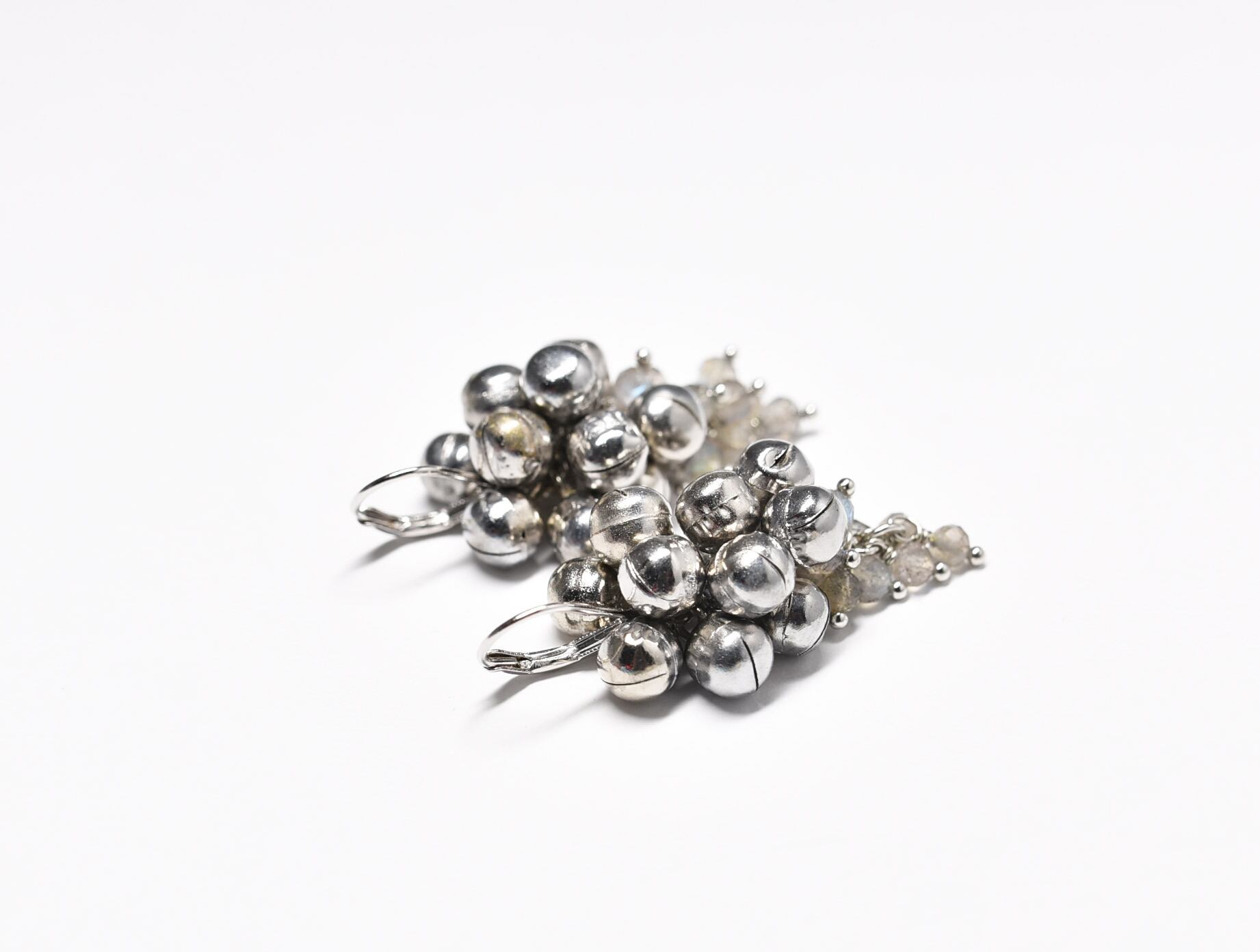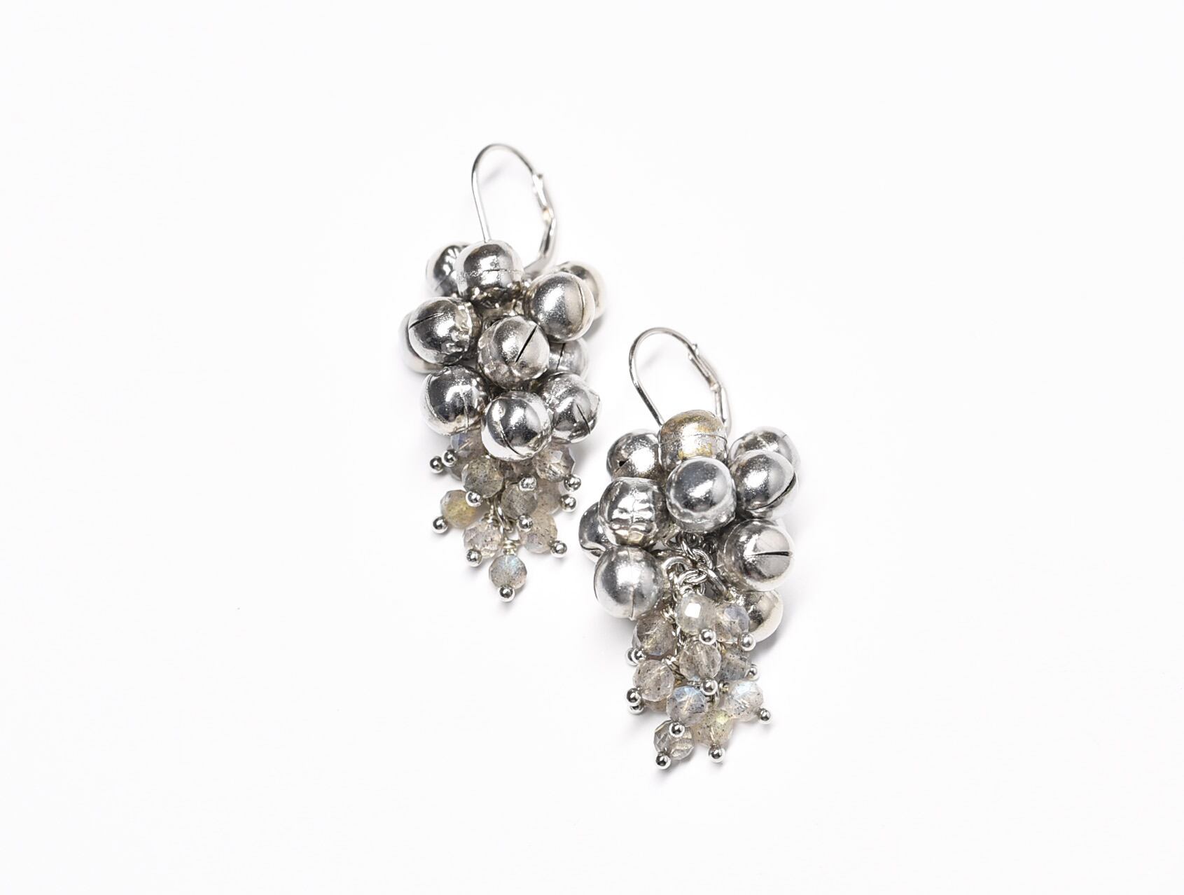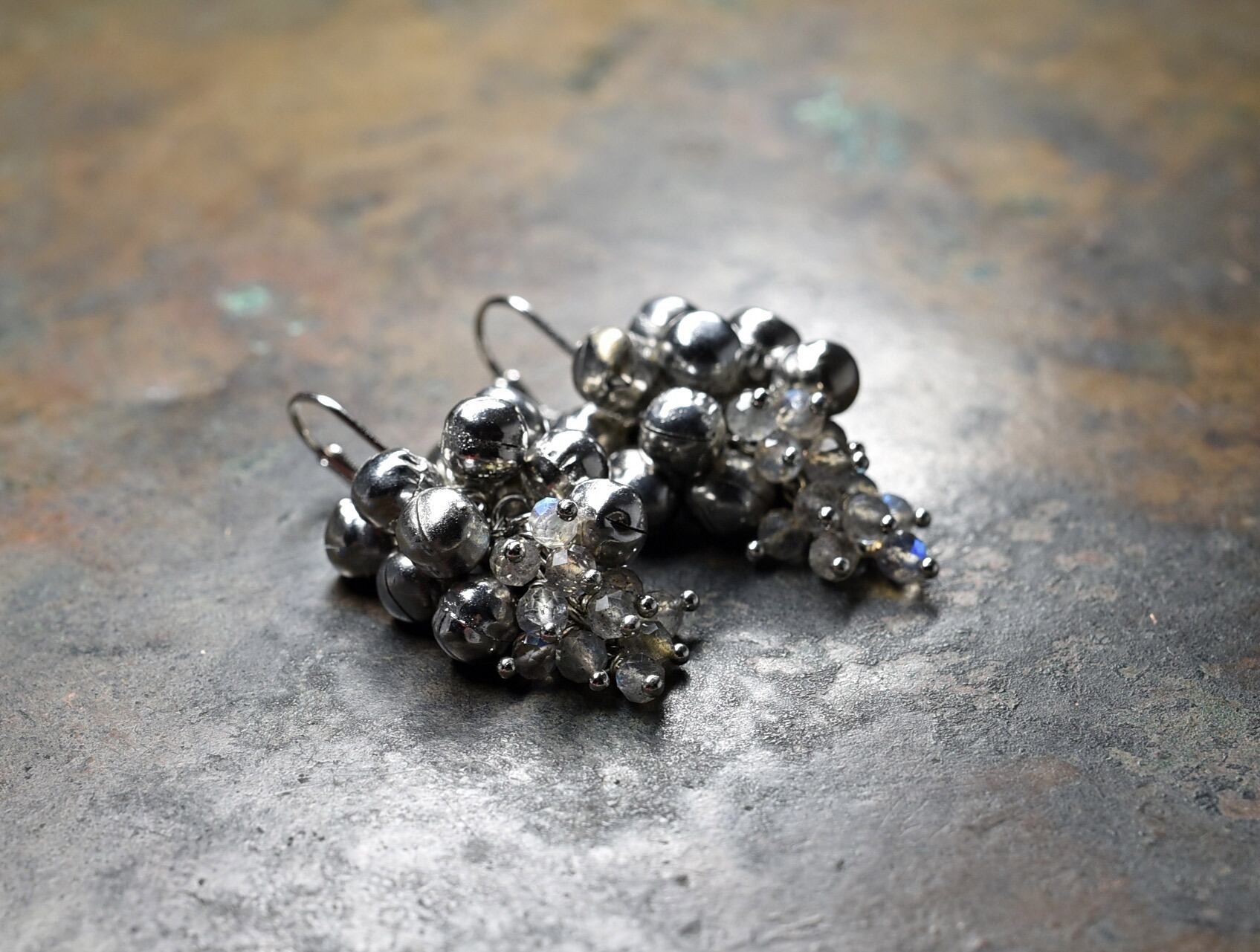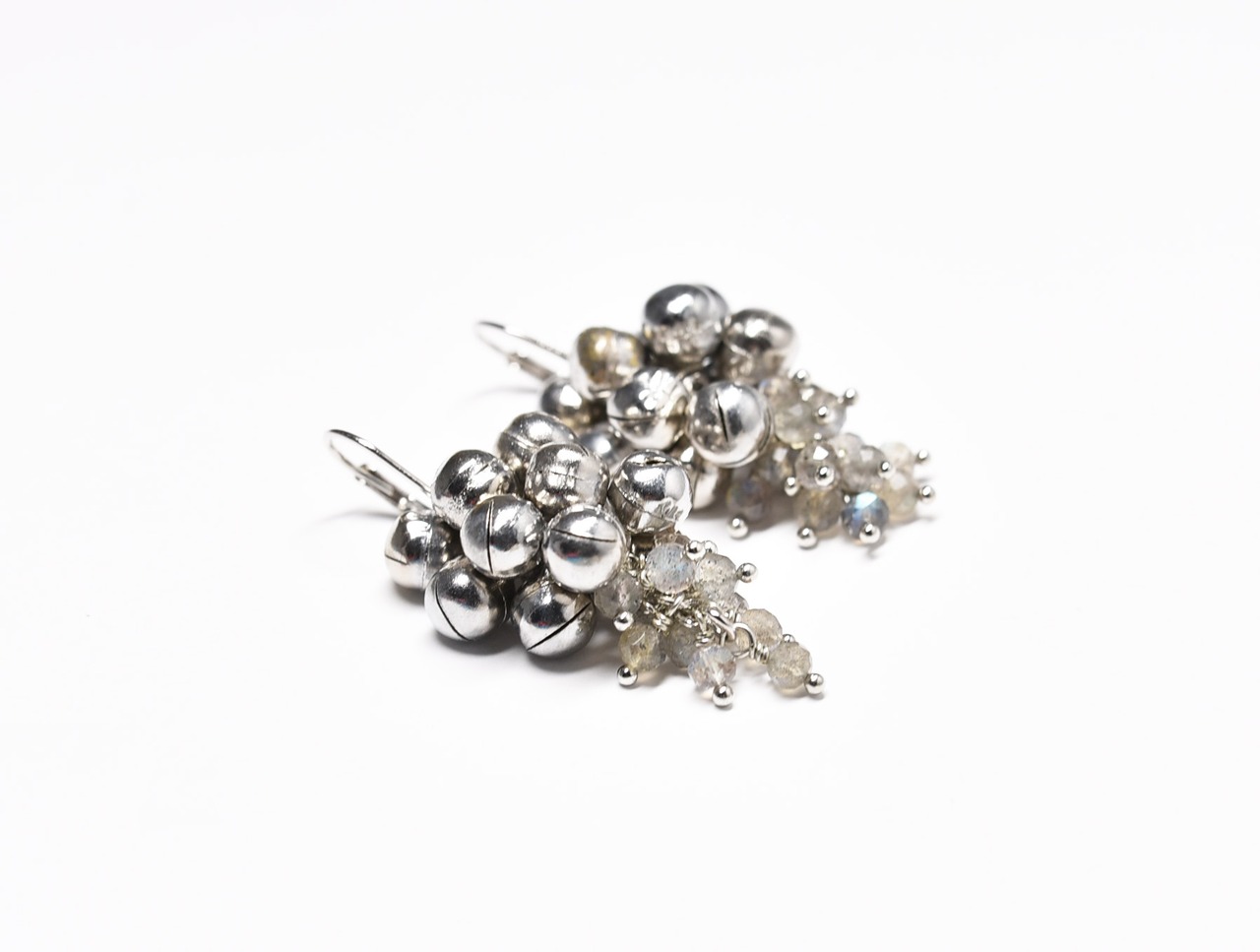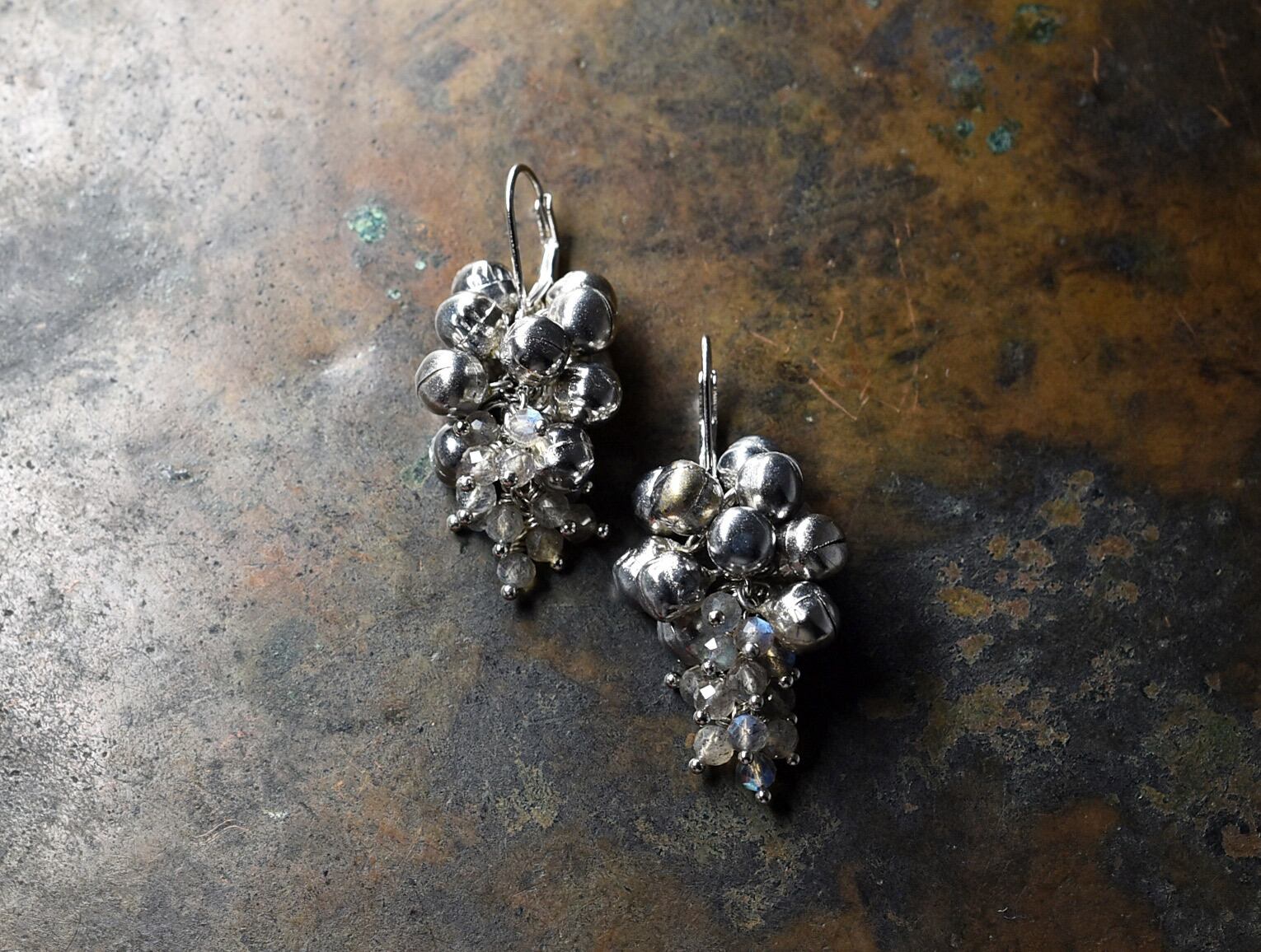 たわわな鈴とラブラドライトを繋いだ少しボリュームのあるピアスです。