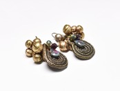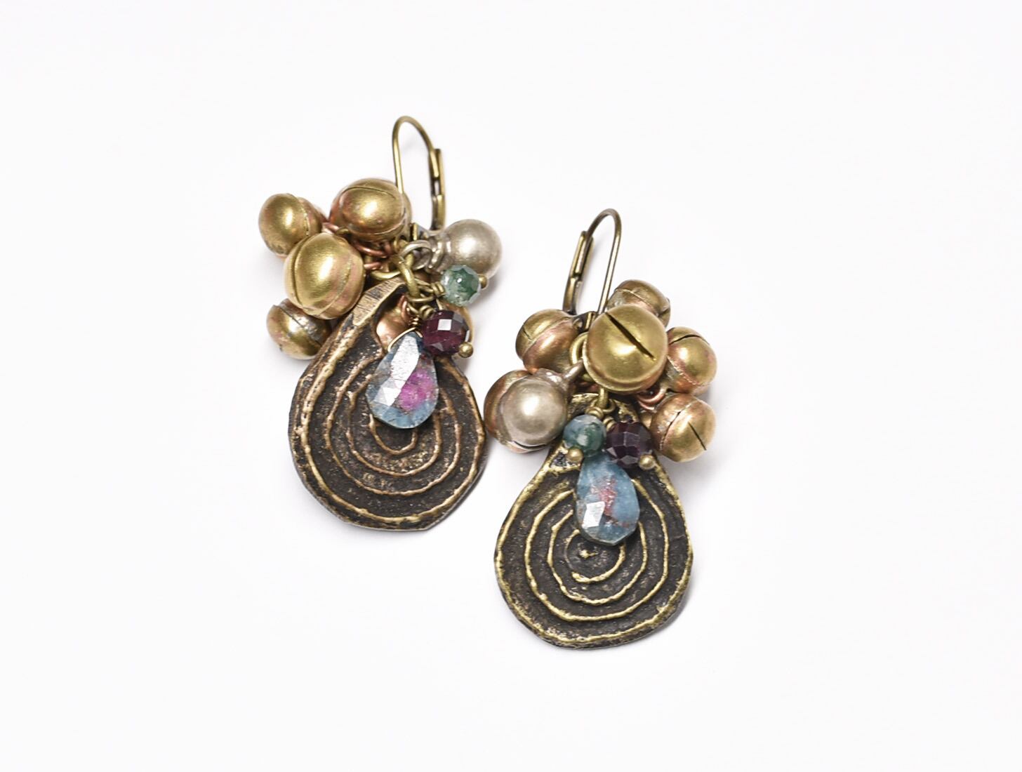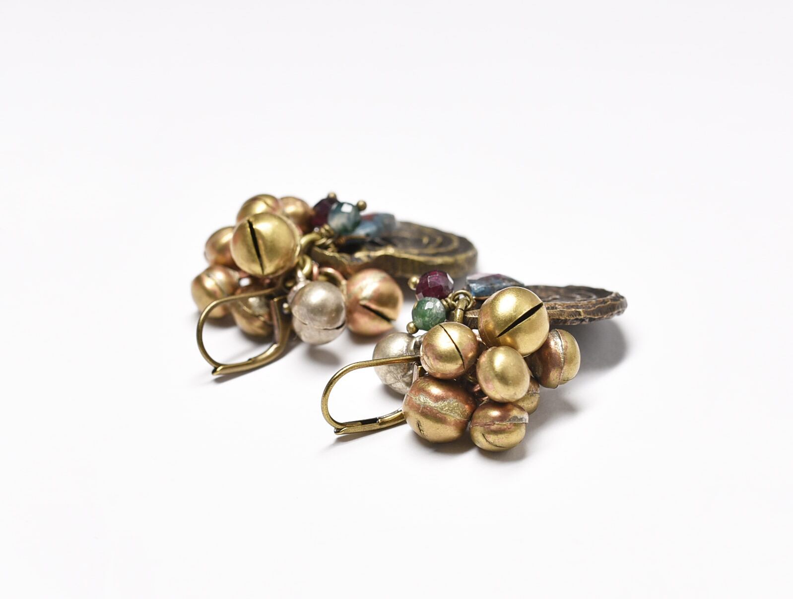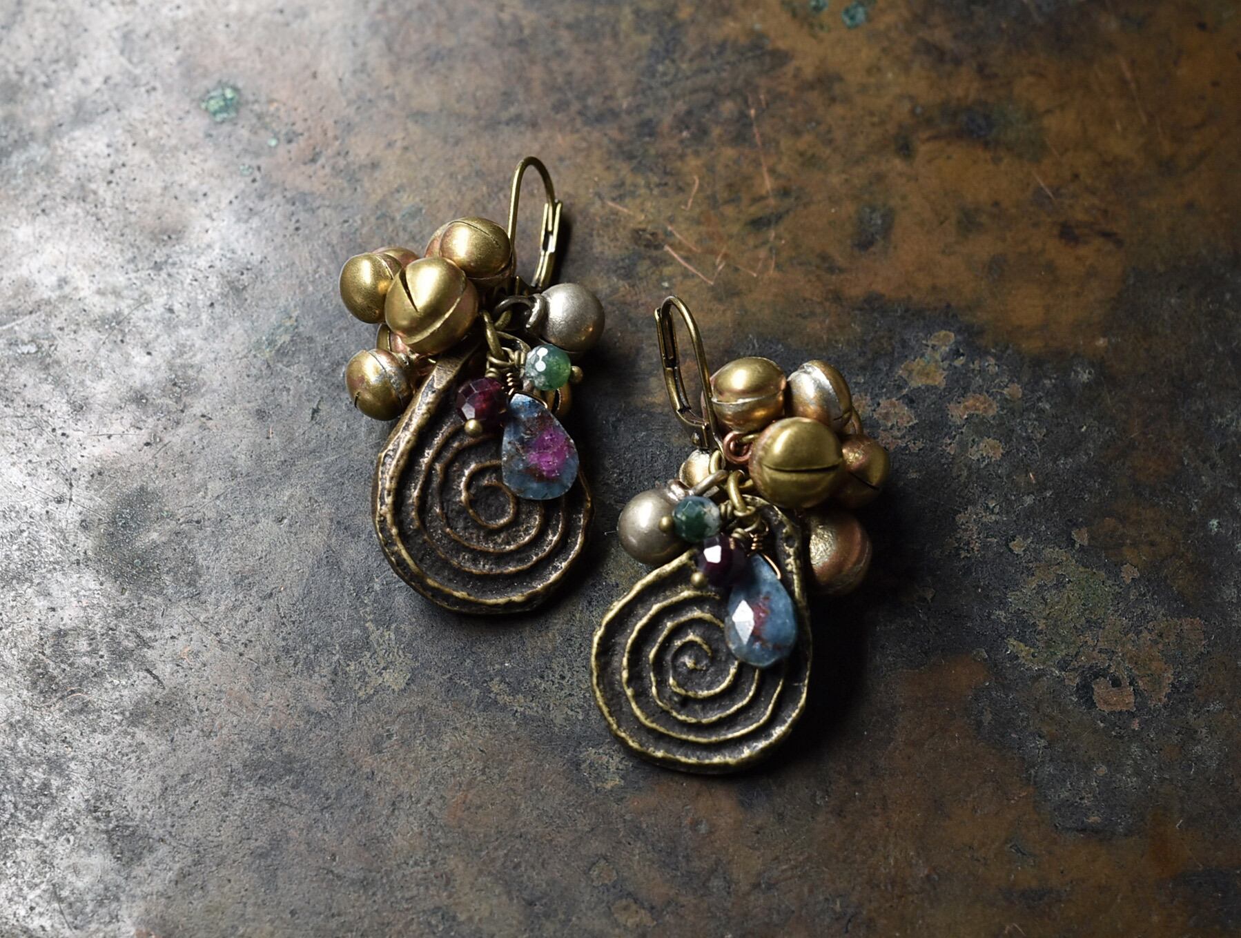 ナガ族渦巻きパーツとたわわな鈴、ルビーインゾイサイト、ガーネット、モスアゲートのピアス