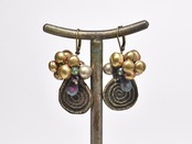 ナガ族渦巻きパーツとたわわな鈴、ルビーインゾイサイト、ガーネット。モスアゲートを繋いだピアスです。