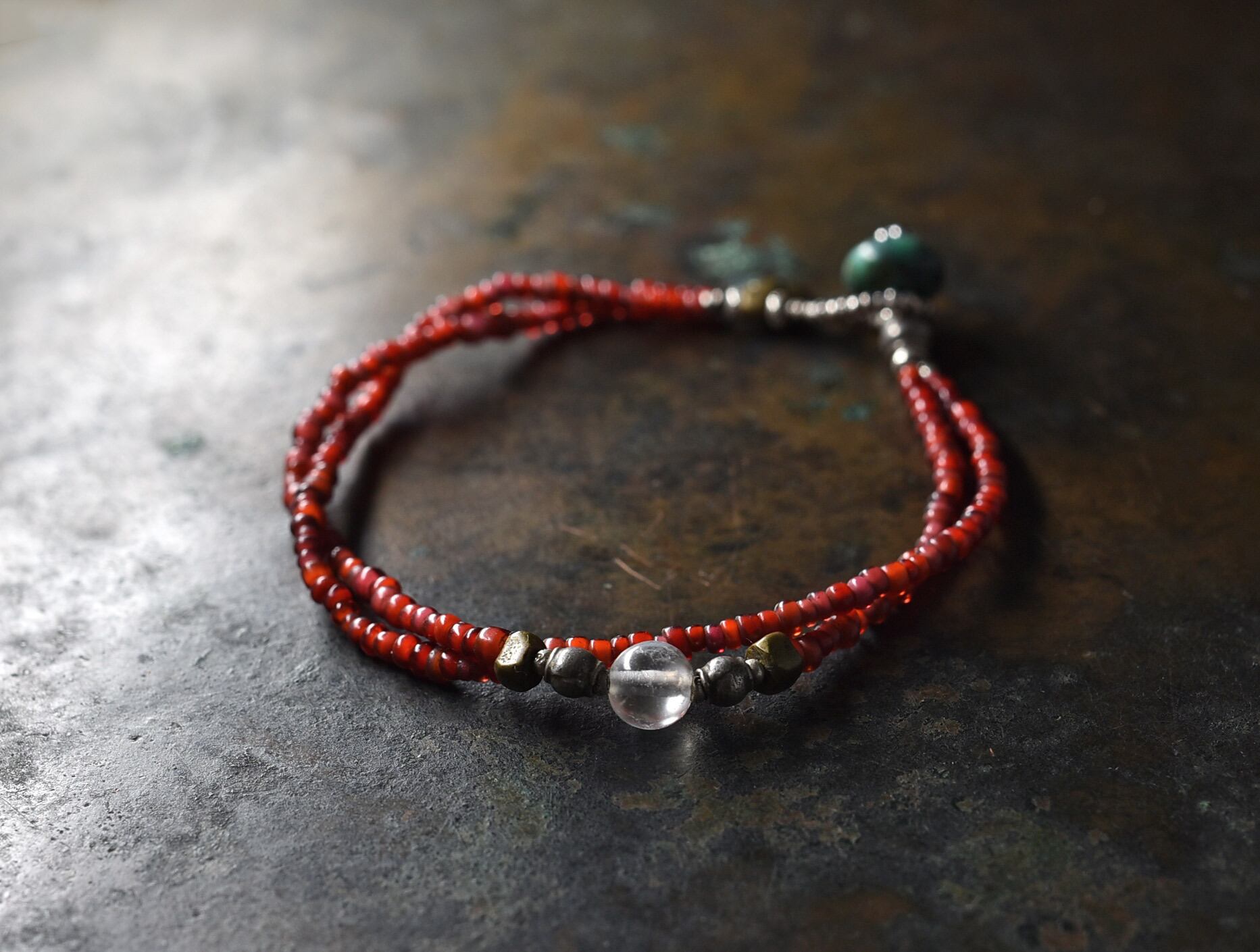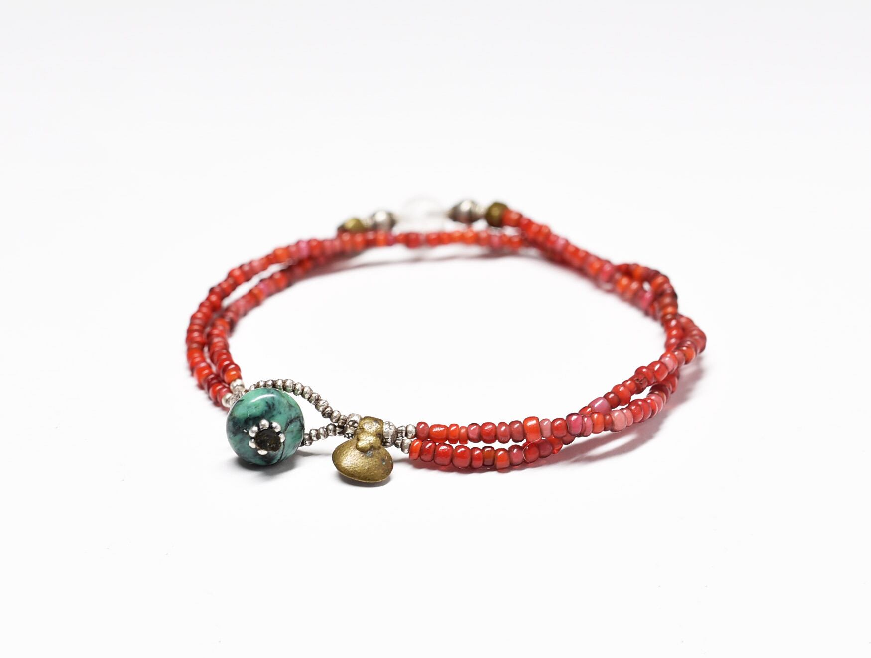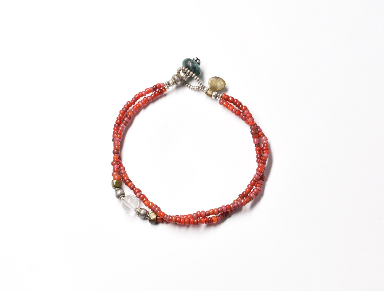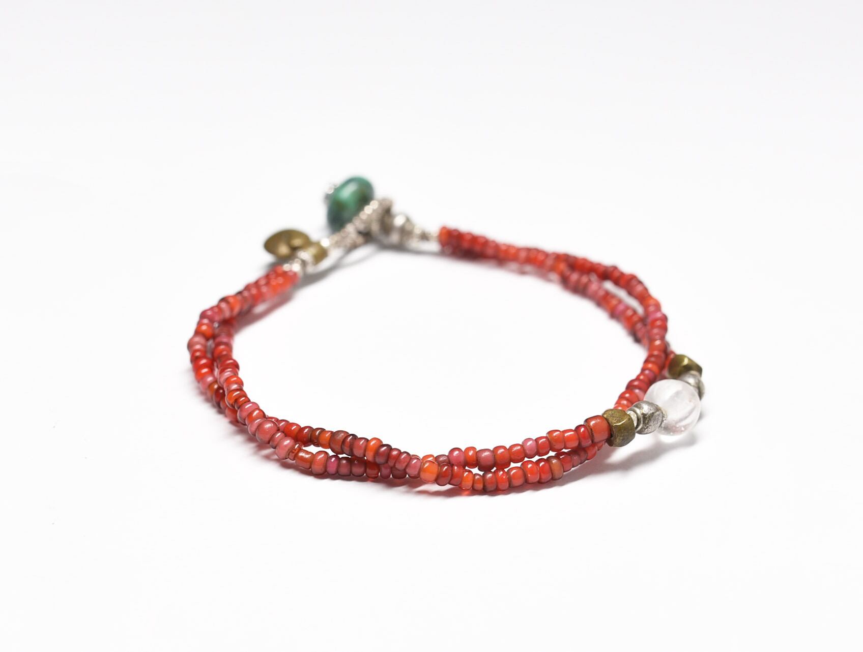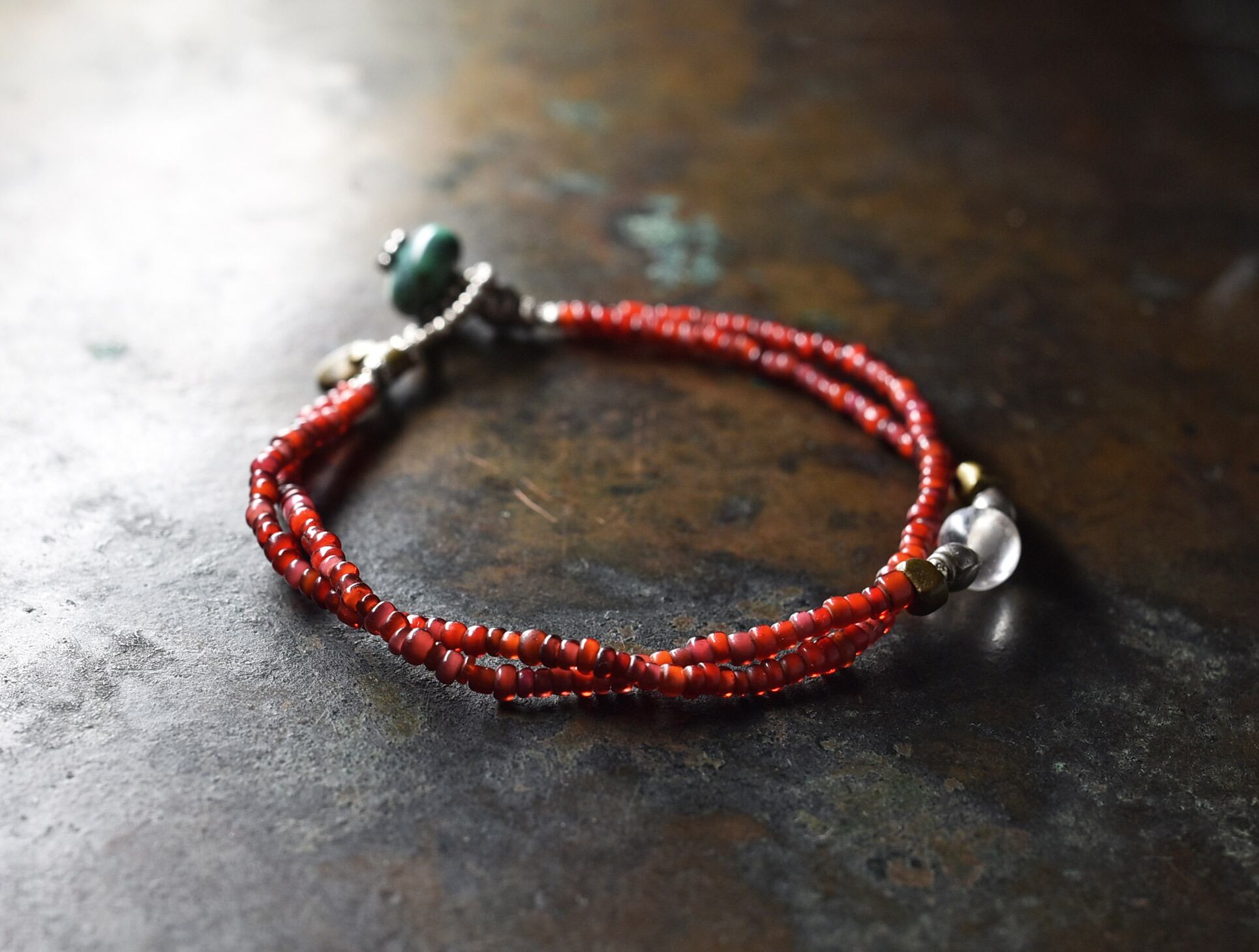 赤色のビーズはホワイトハーツと呼ばれるアンティークビーズです。芯(ハート)部分が白いことからこう呼ばれています。こちらは19~20世紀頃のベネチア産のビーズです。