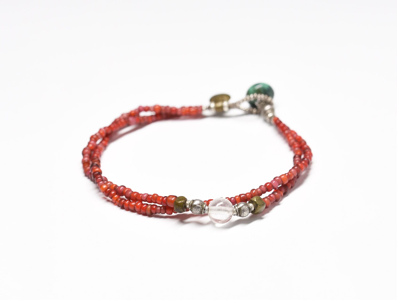 素材:古代水晶、oldチンシルバー、ガラス、真鍮、ターコイズ、ロウビキ紐