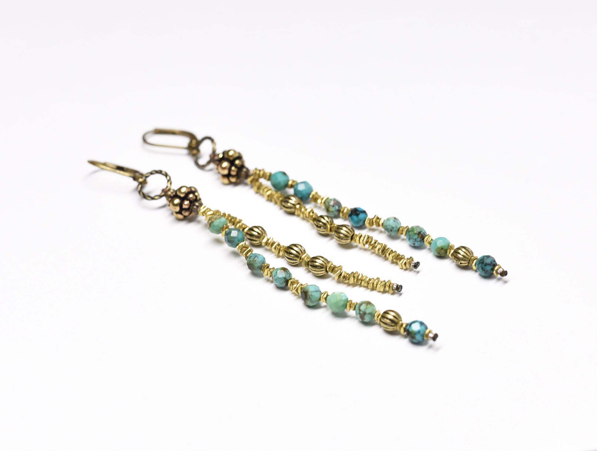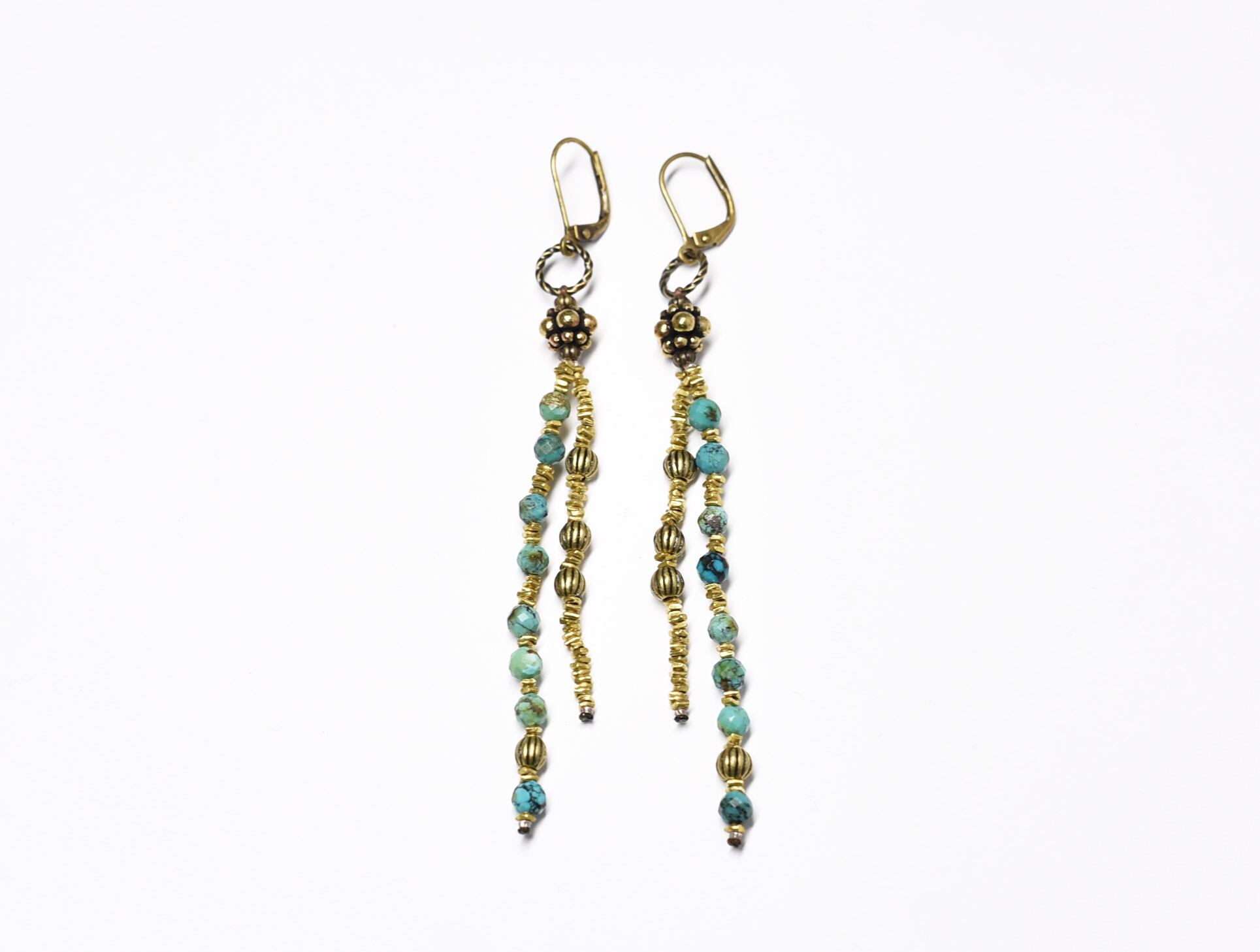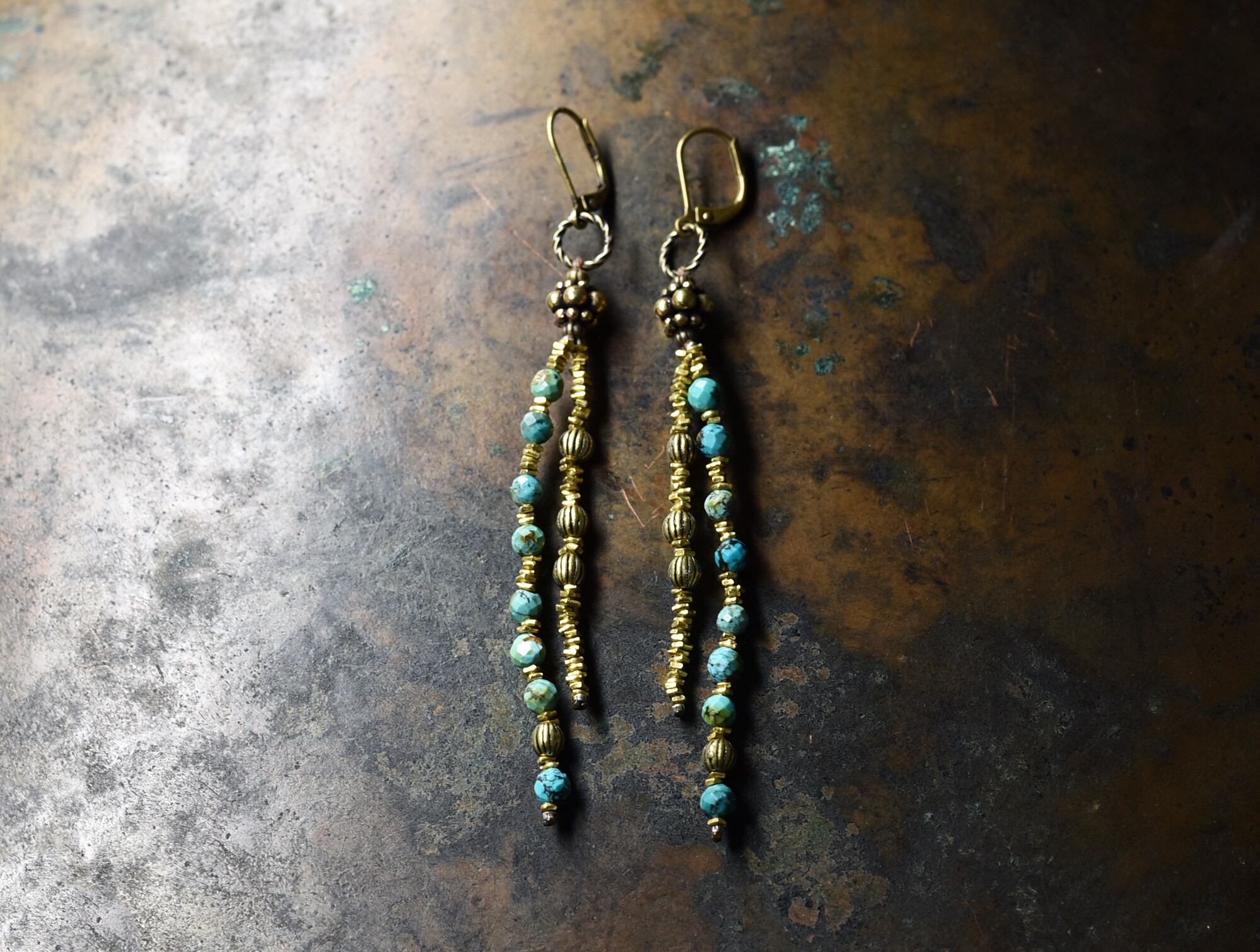 ブラスビーズとターコイズを繋いだロングピアスです。