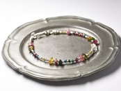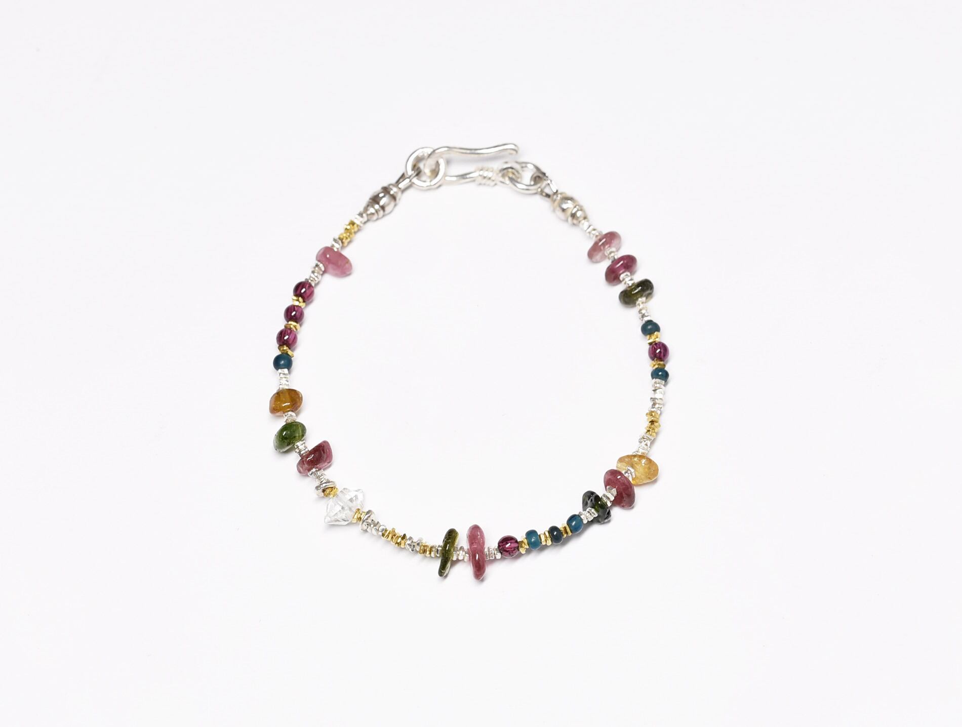 ハーキマーダイヤモンドとトルマリンとガーネット、インディゴブルーのアンティークビーズとカレンシルバーを繋いだ華奢なブレスです。
