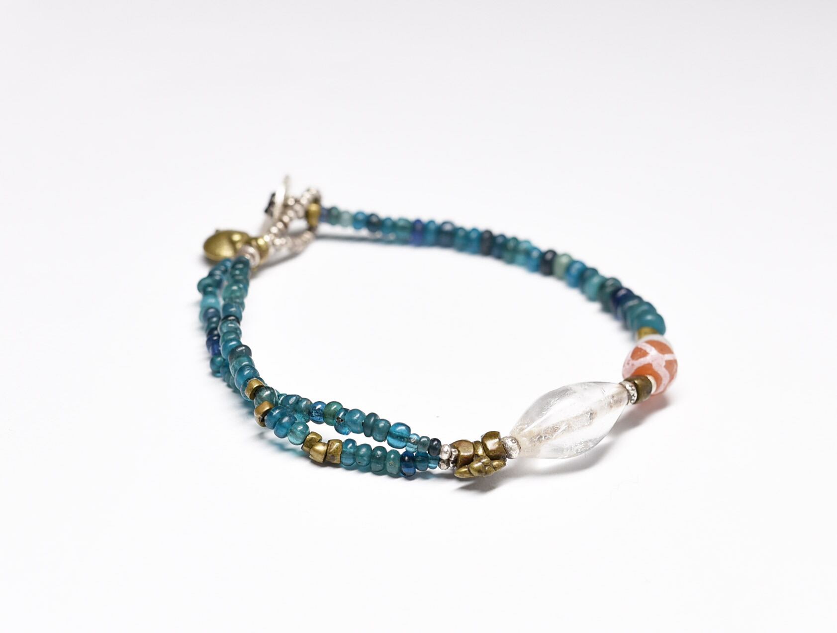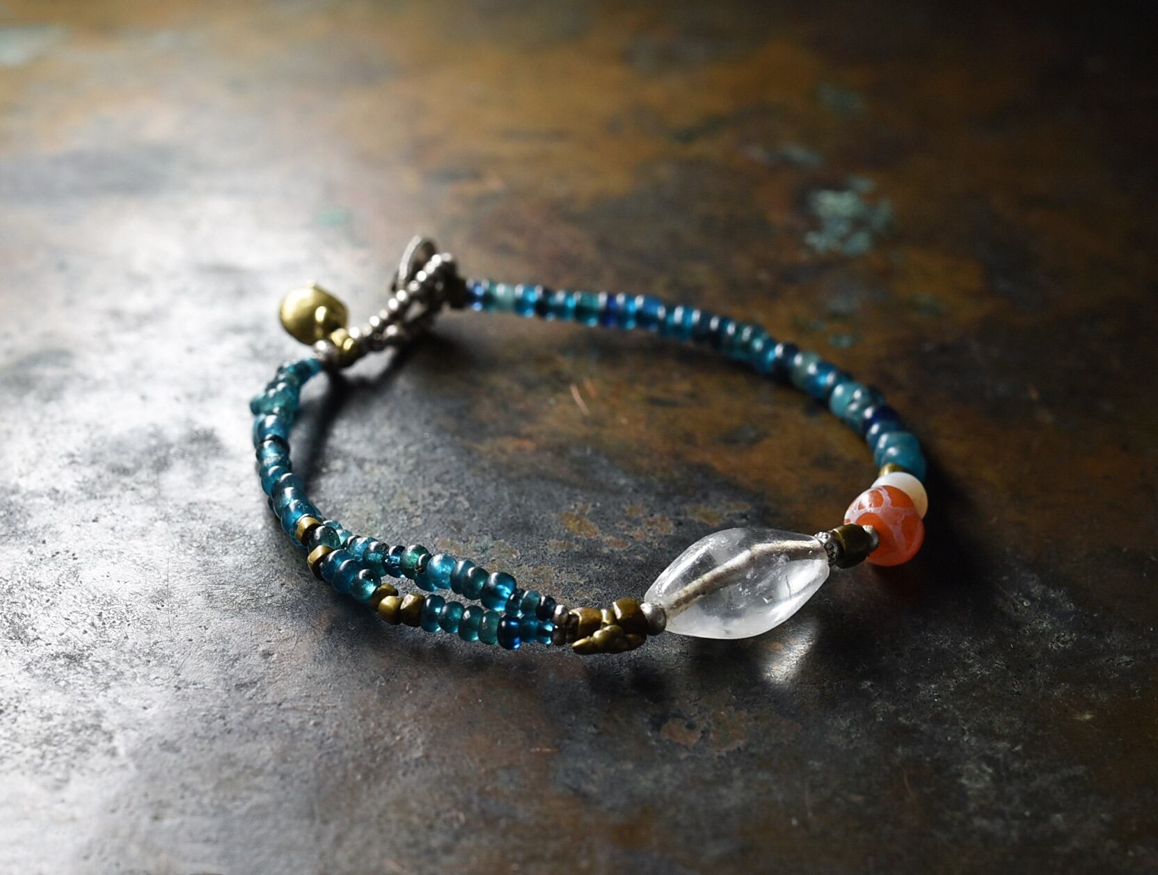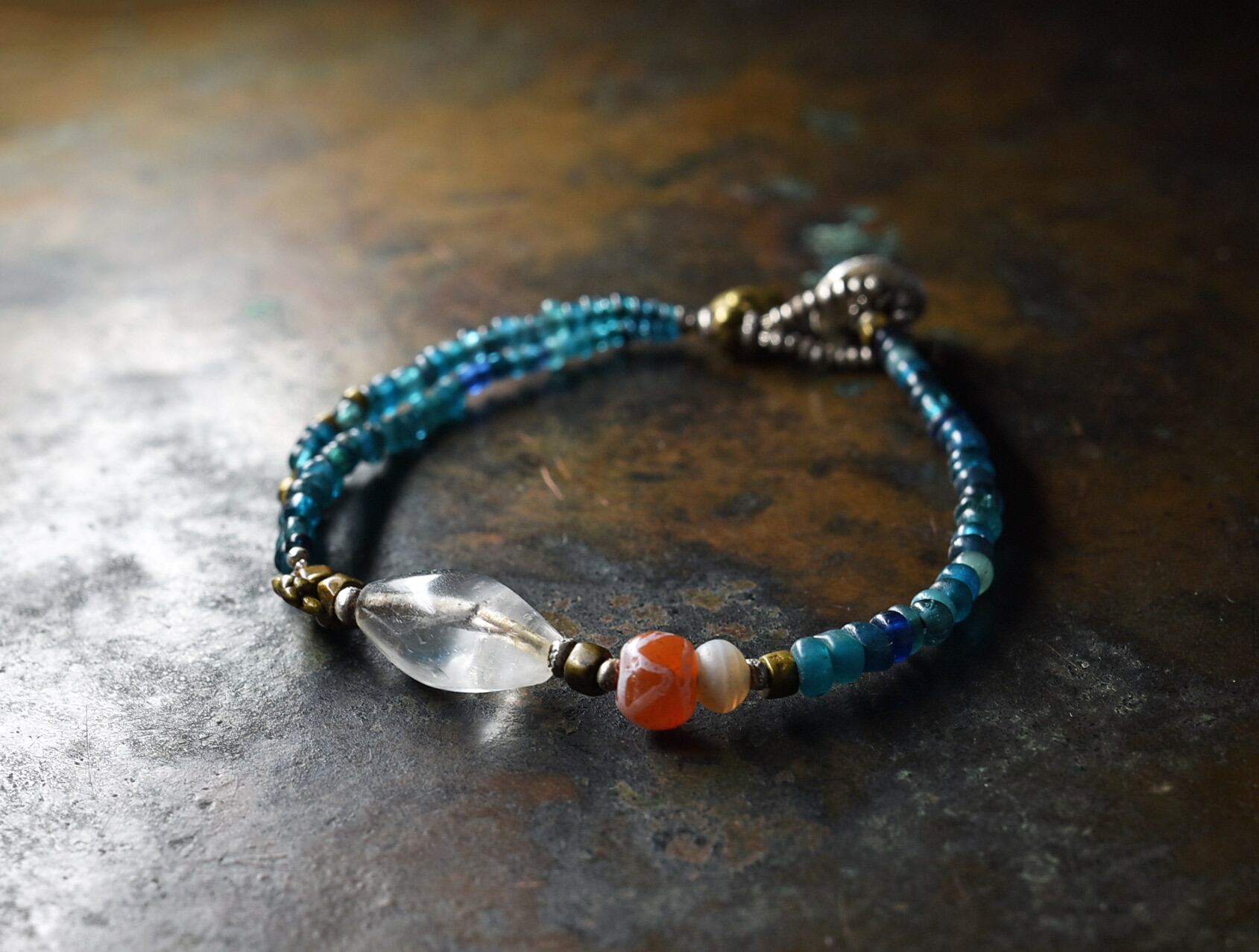 古代水晶とエッチドカーネリアン、古代瑪瑙、エメラルドブルーミックスアンティークビーズなどを繋いだブレスです。