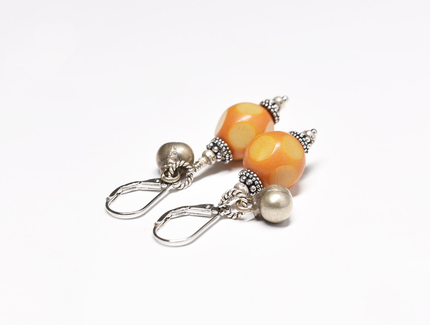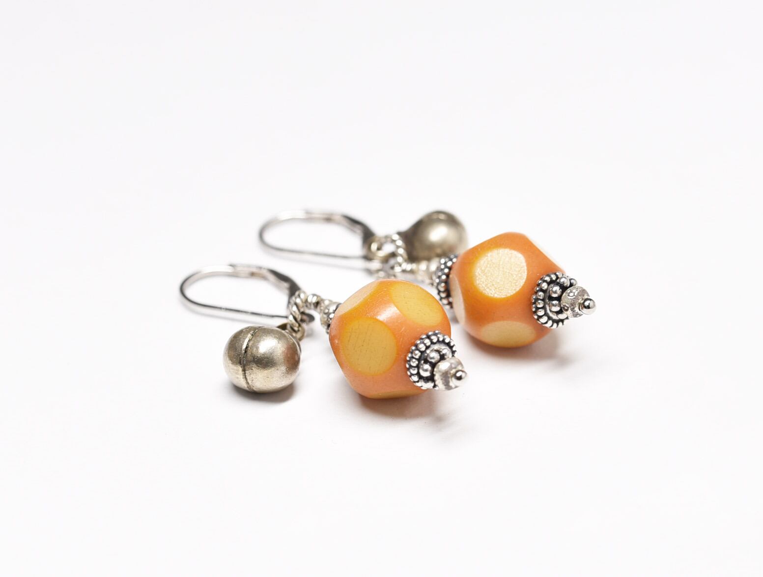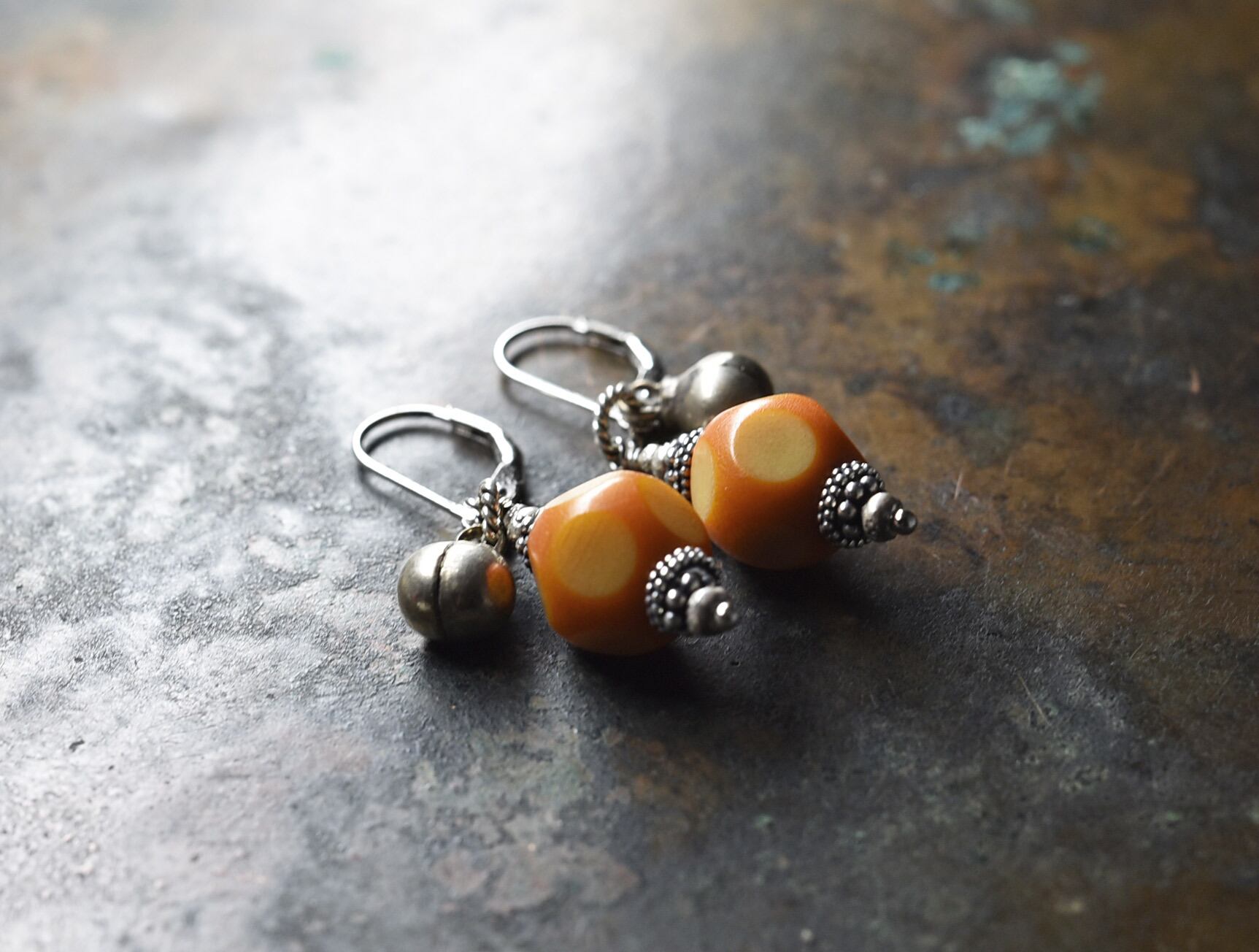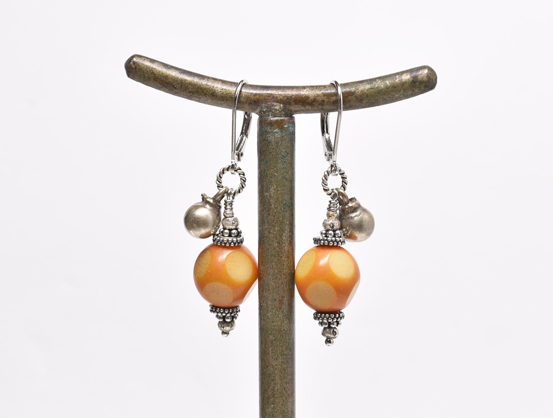 水玉模様アフリカンアンバーと民族鈴のシルバーピアス