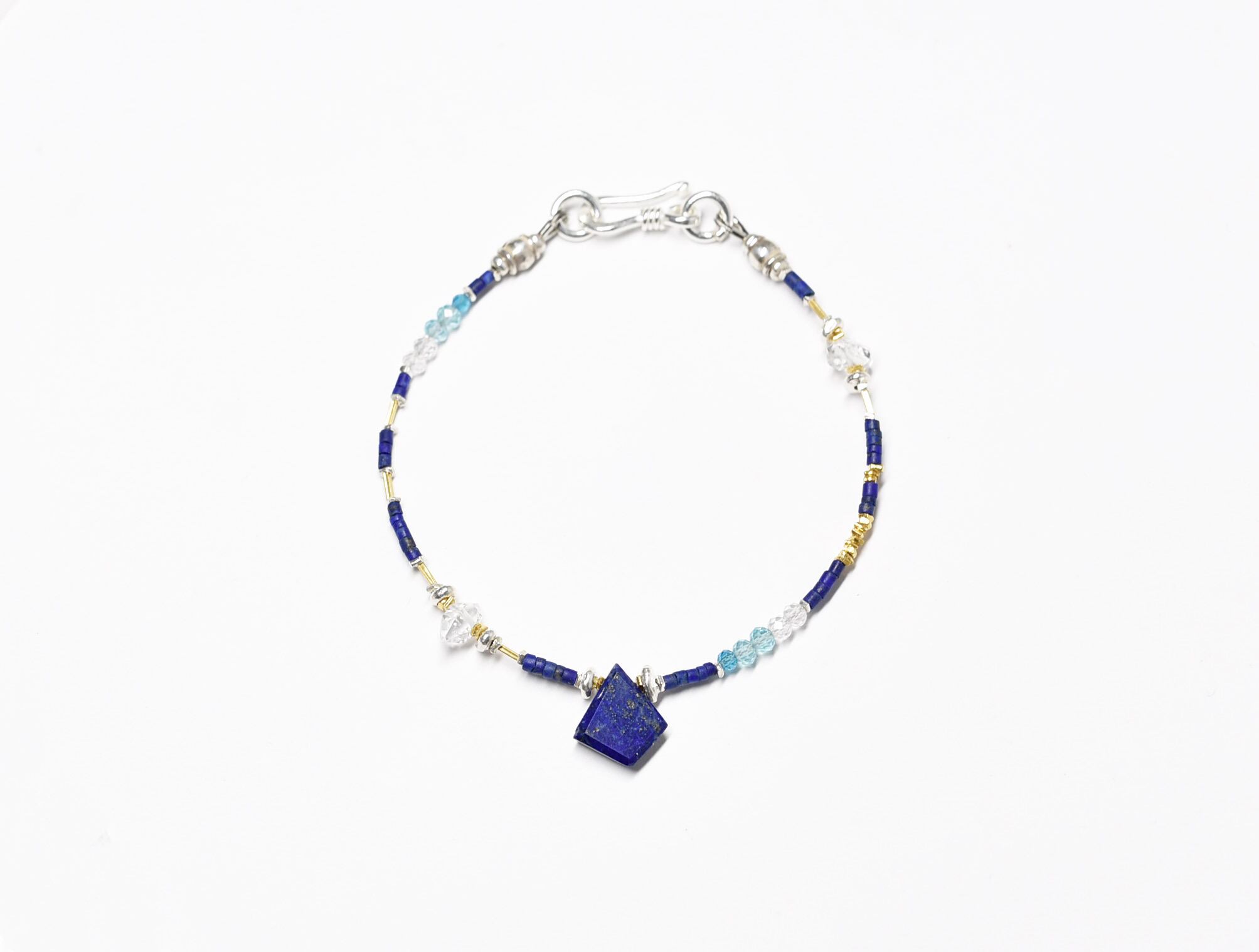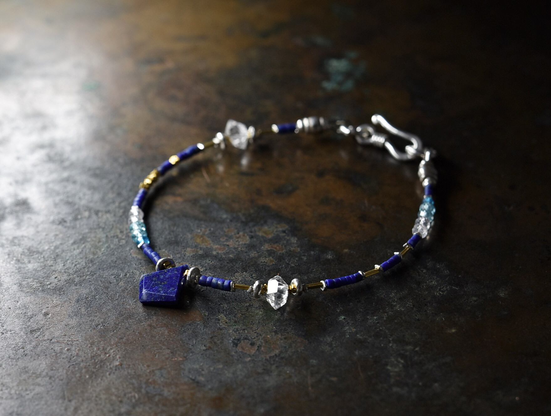ラピスと小さなストーンビーズ、ハーキマーダイヤモンド、カレンシルバーの華奢なブレス