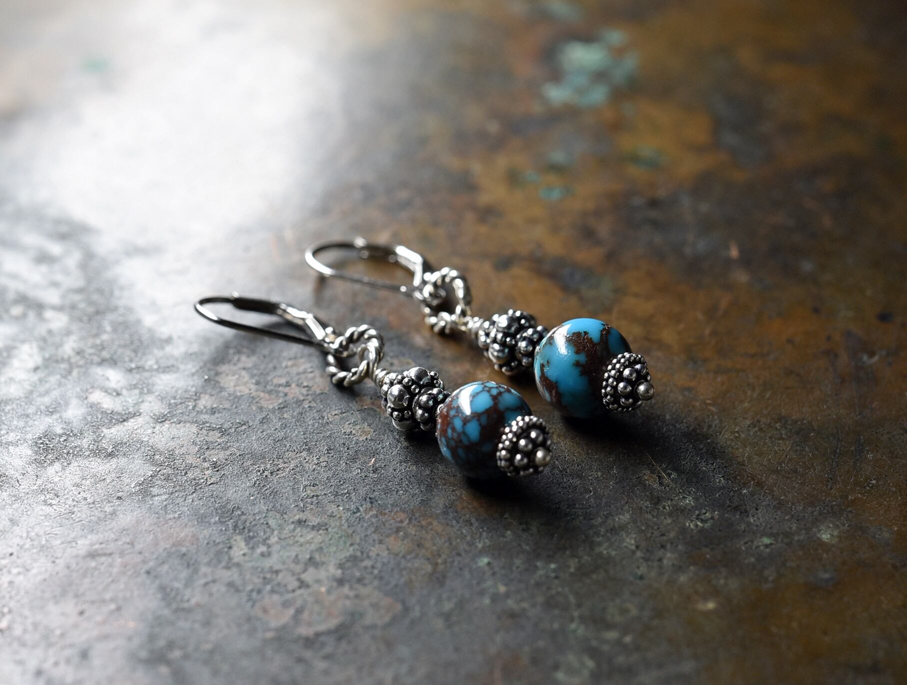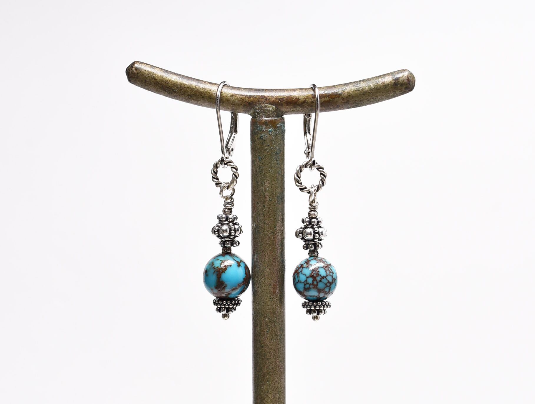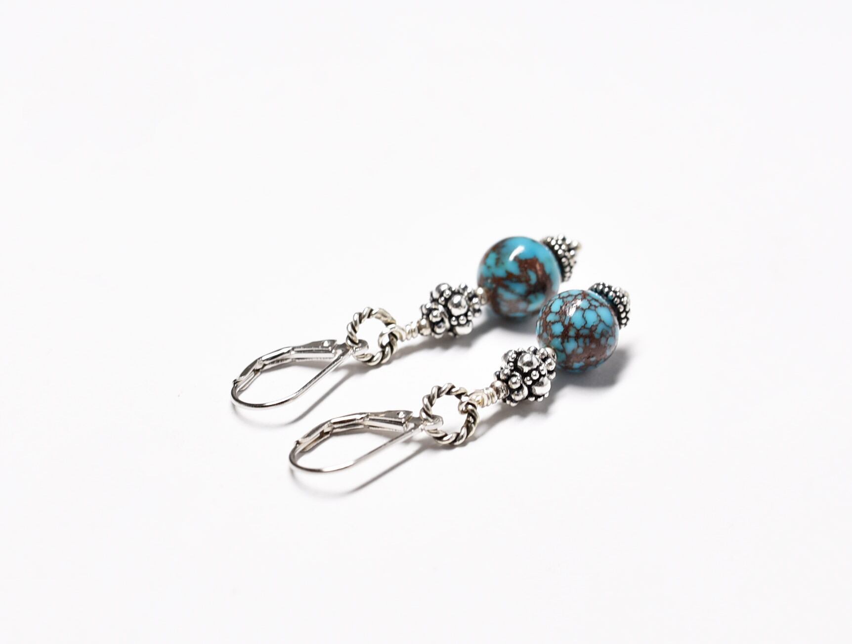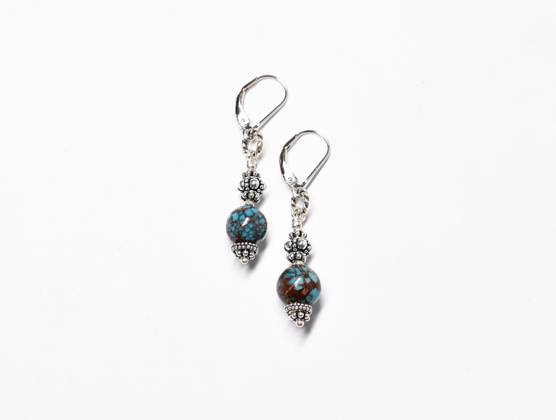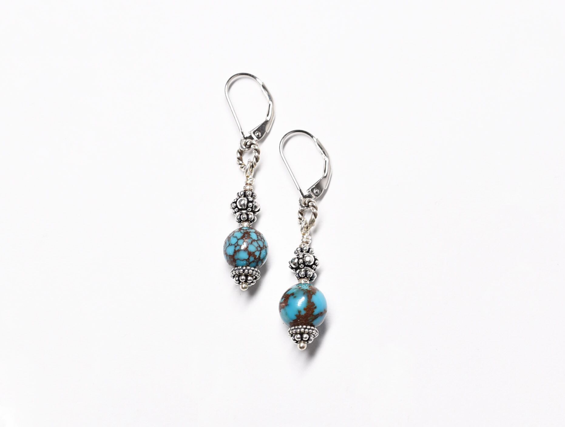 イラン産まん丸ターコイズと様々なシルバーを繋いピアスです。