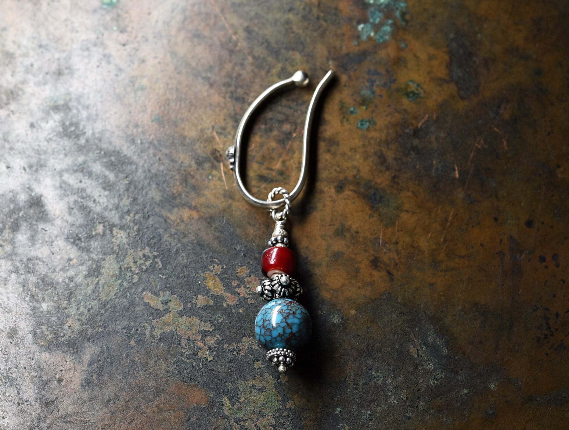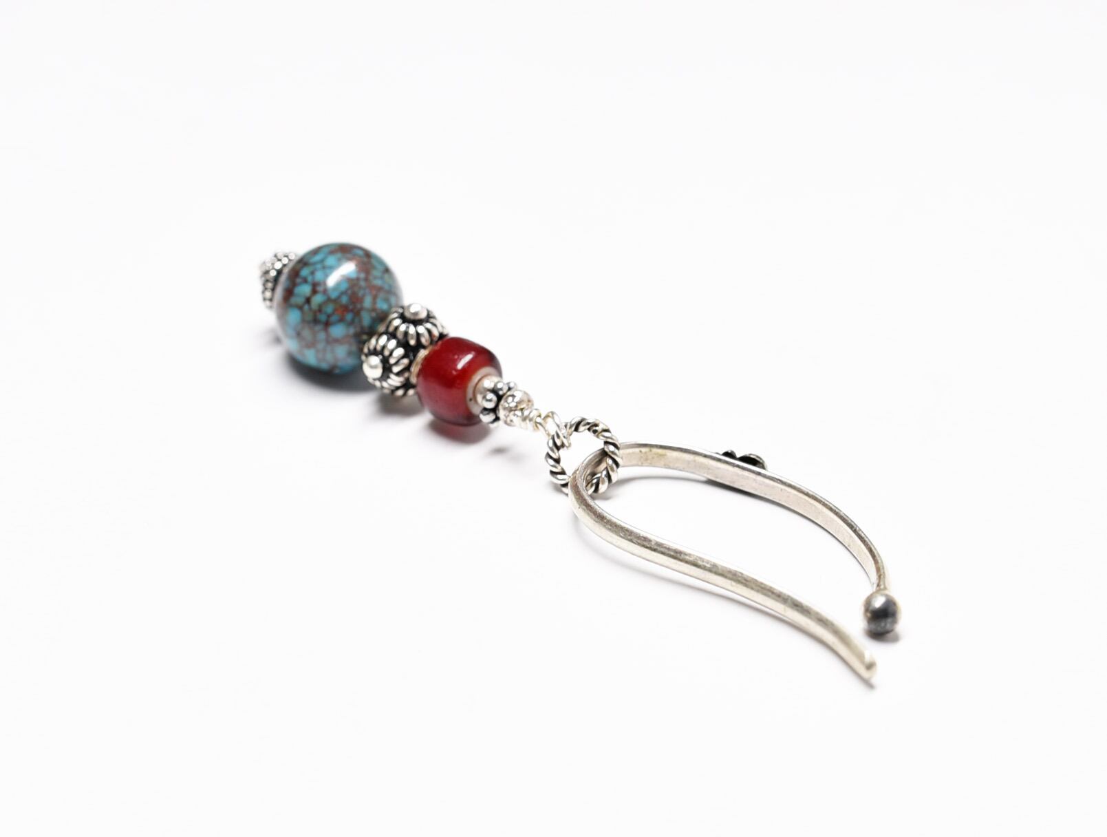 ターコイズの鮮やかな色合いに血赤色のホワイトハーツ、シルバーのコントラストがカッコ良く、目を惹くイヤーカフです。