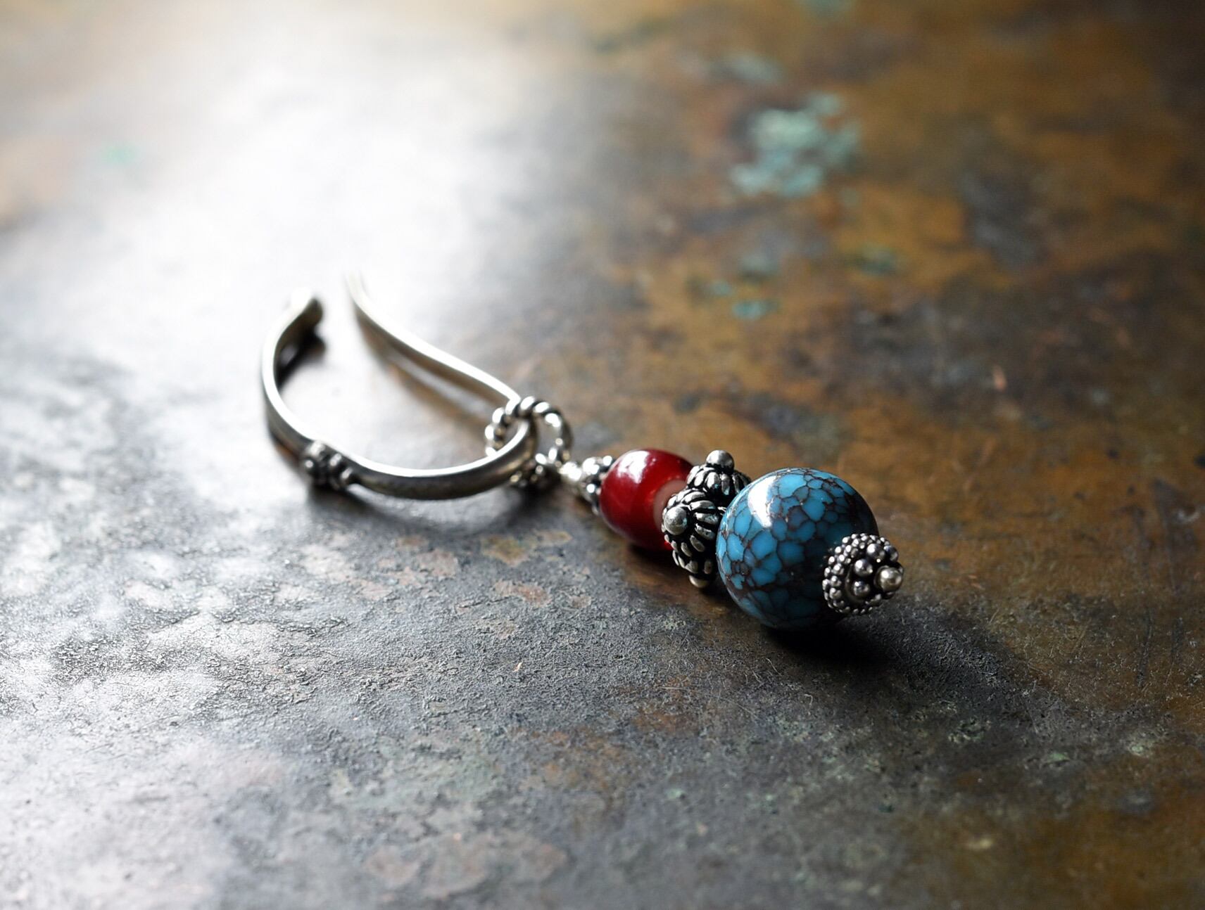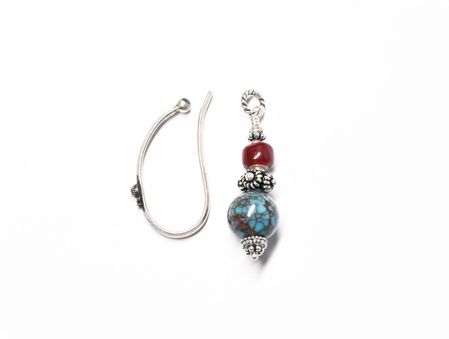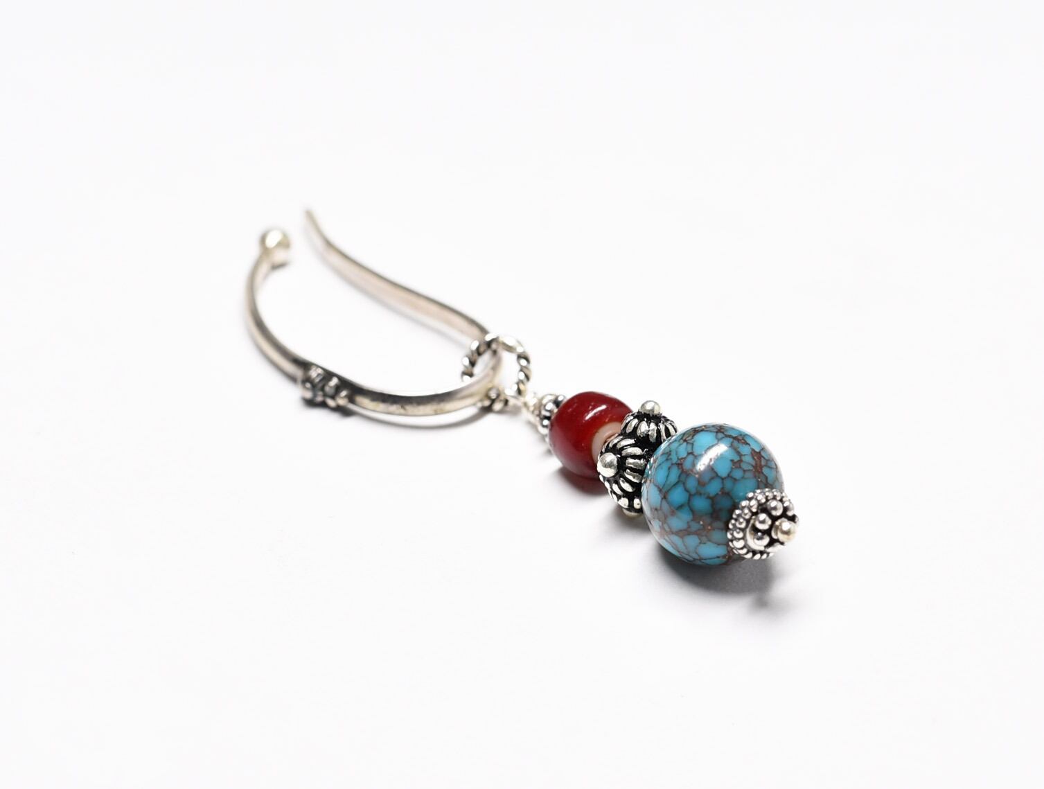 イラン産まん丸ターコイズと血赤色のホワイトハーツ、様々なシルバーを繋いイヤーカフです。