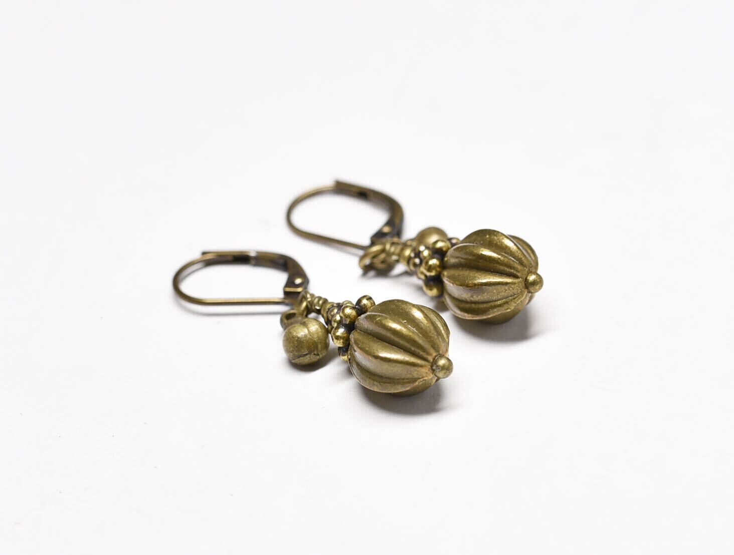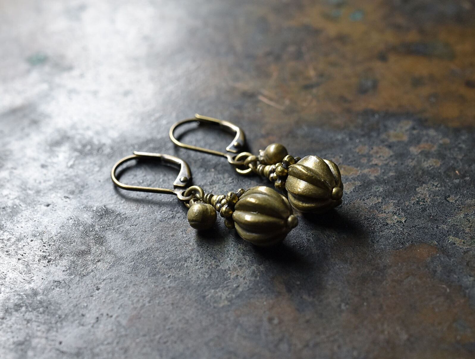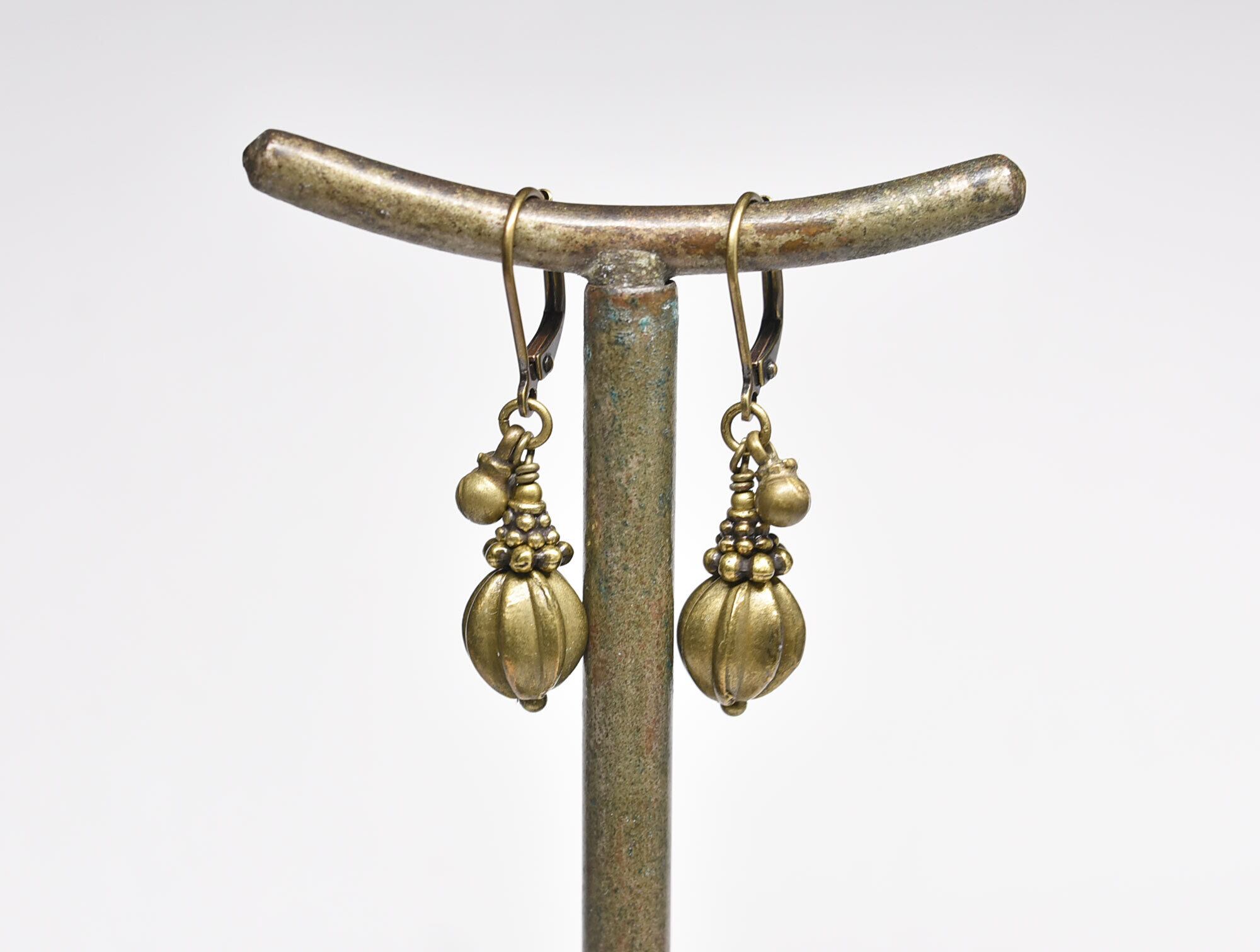 古いブラスビーズと、民族鈴を繋いだピアスです。