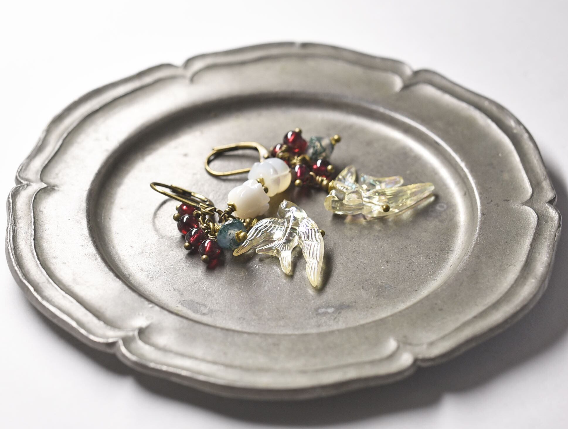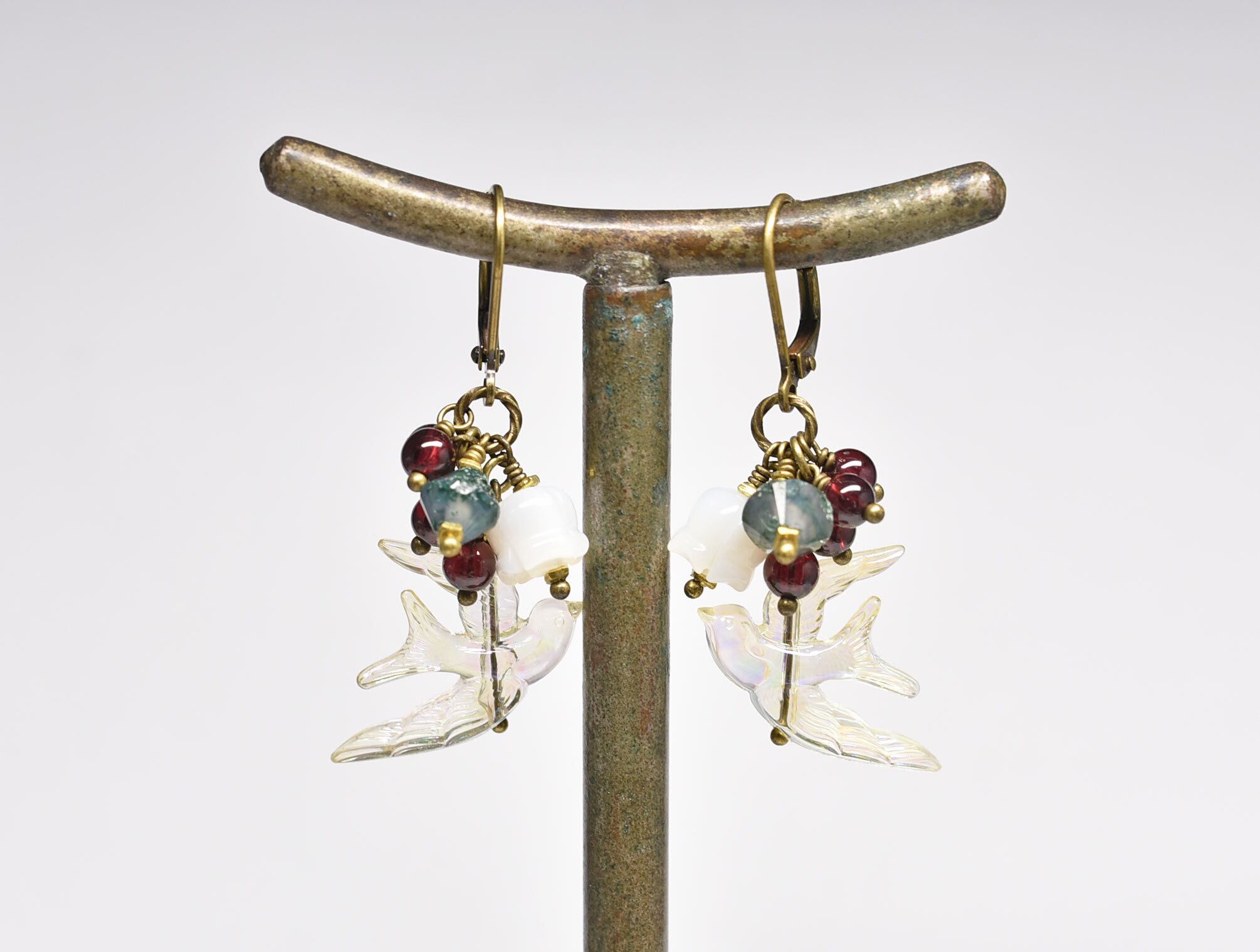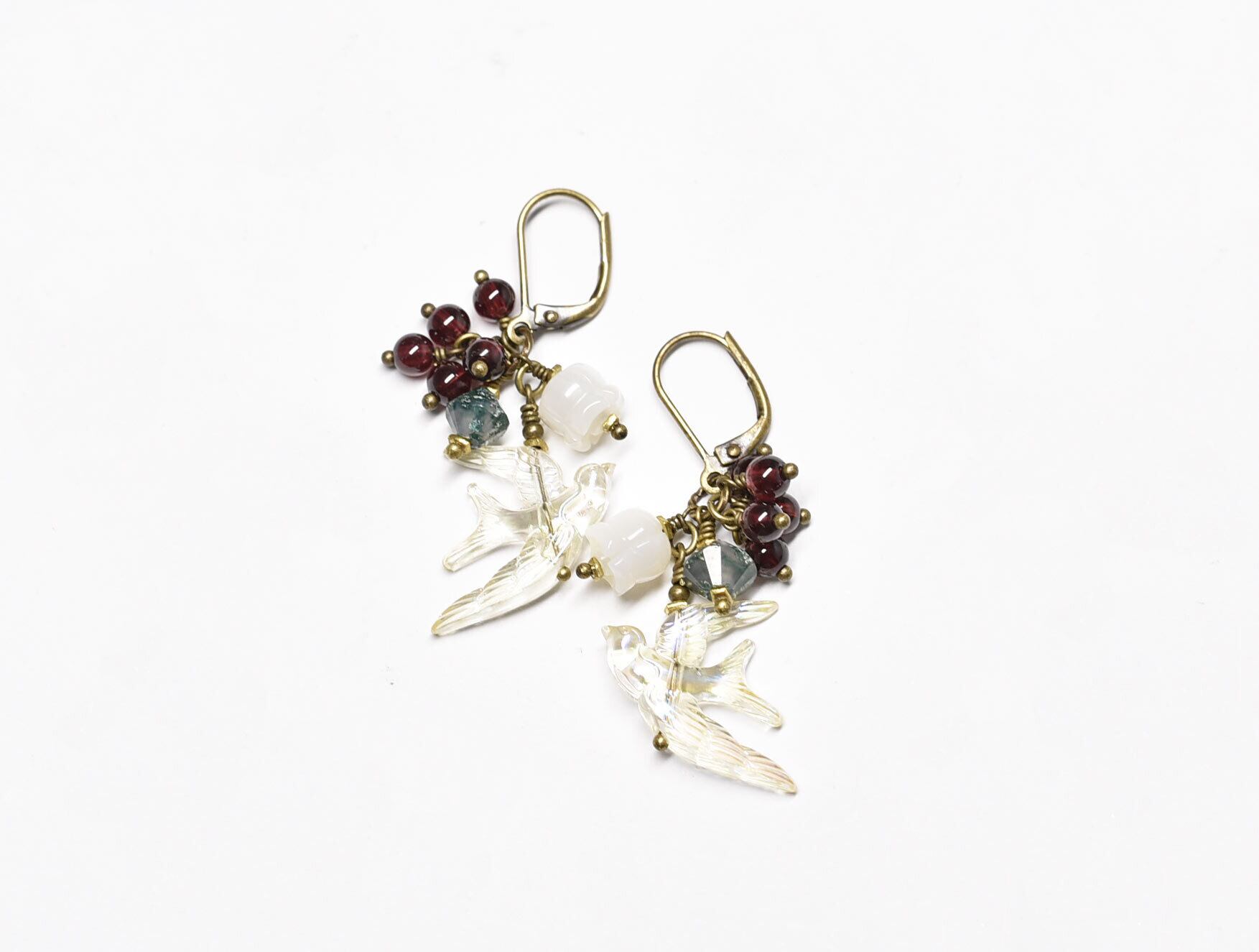 ドイツヴィンテージのツバメとたわわなガーネット、白蝶貝のすずらん、モスアゲートを繋いだピアスです。