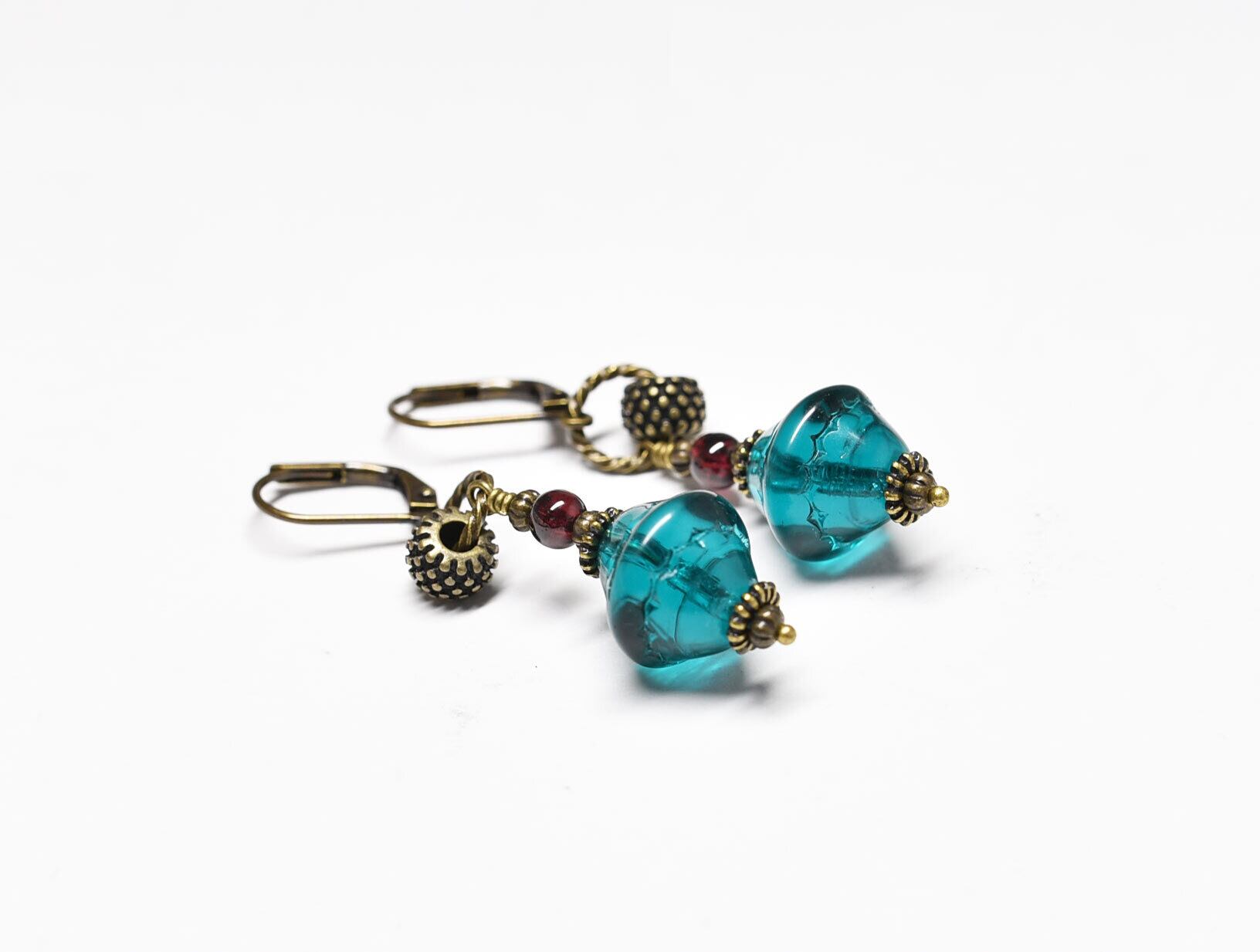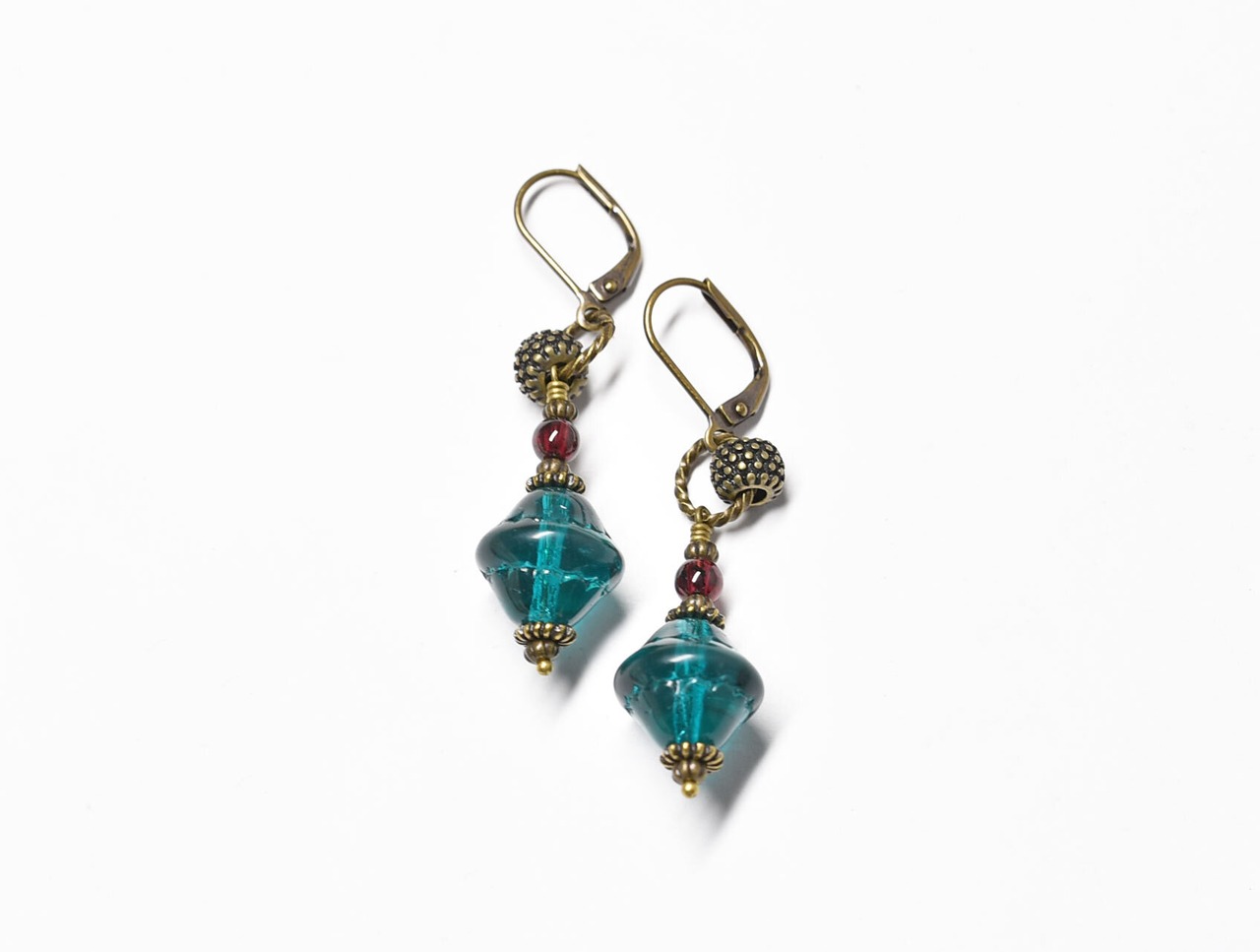 ブルーグリーンドイツヴィンテージビーズとガーネットのピアス