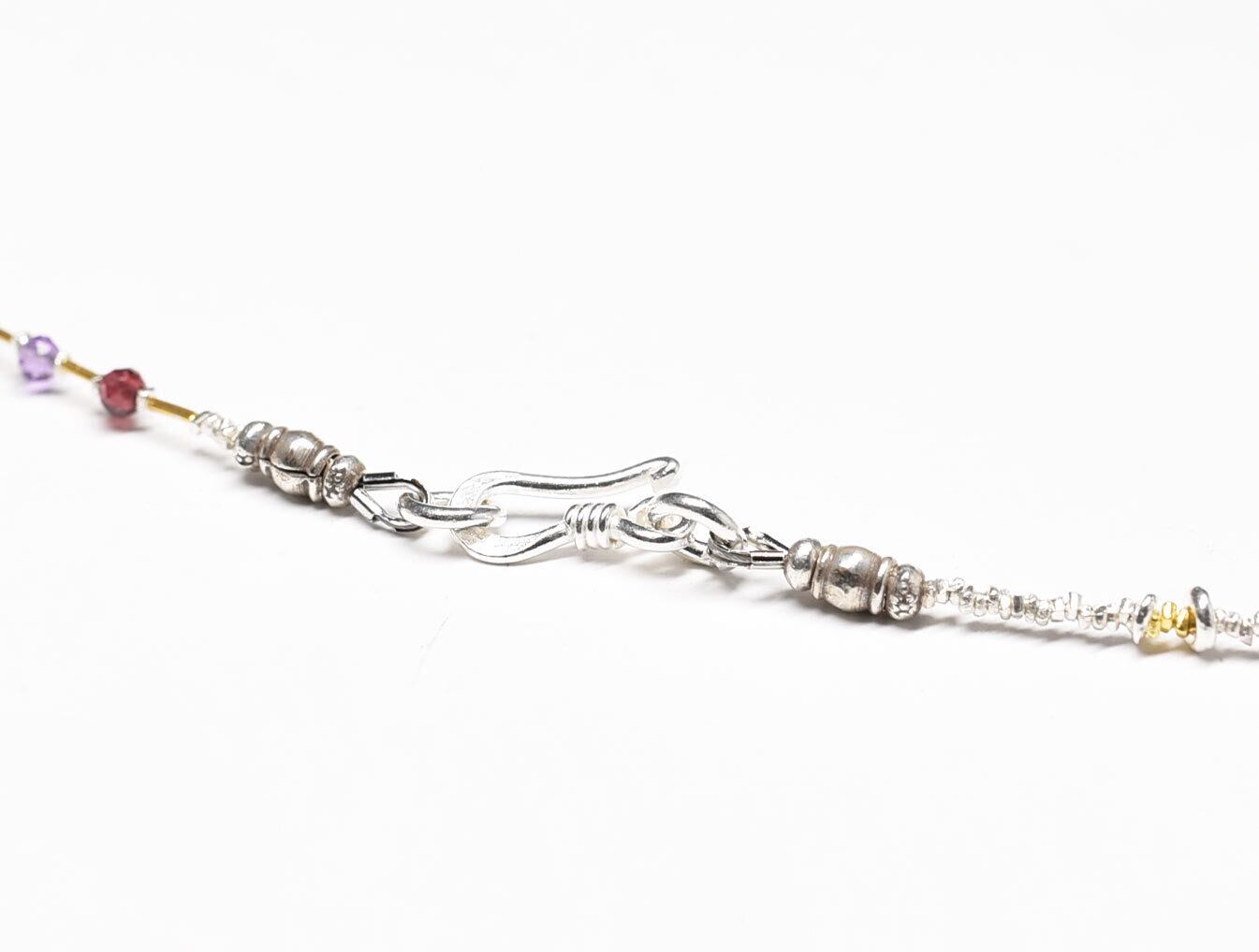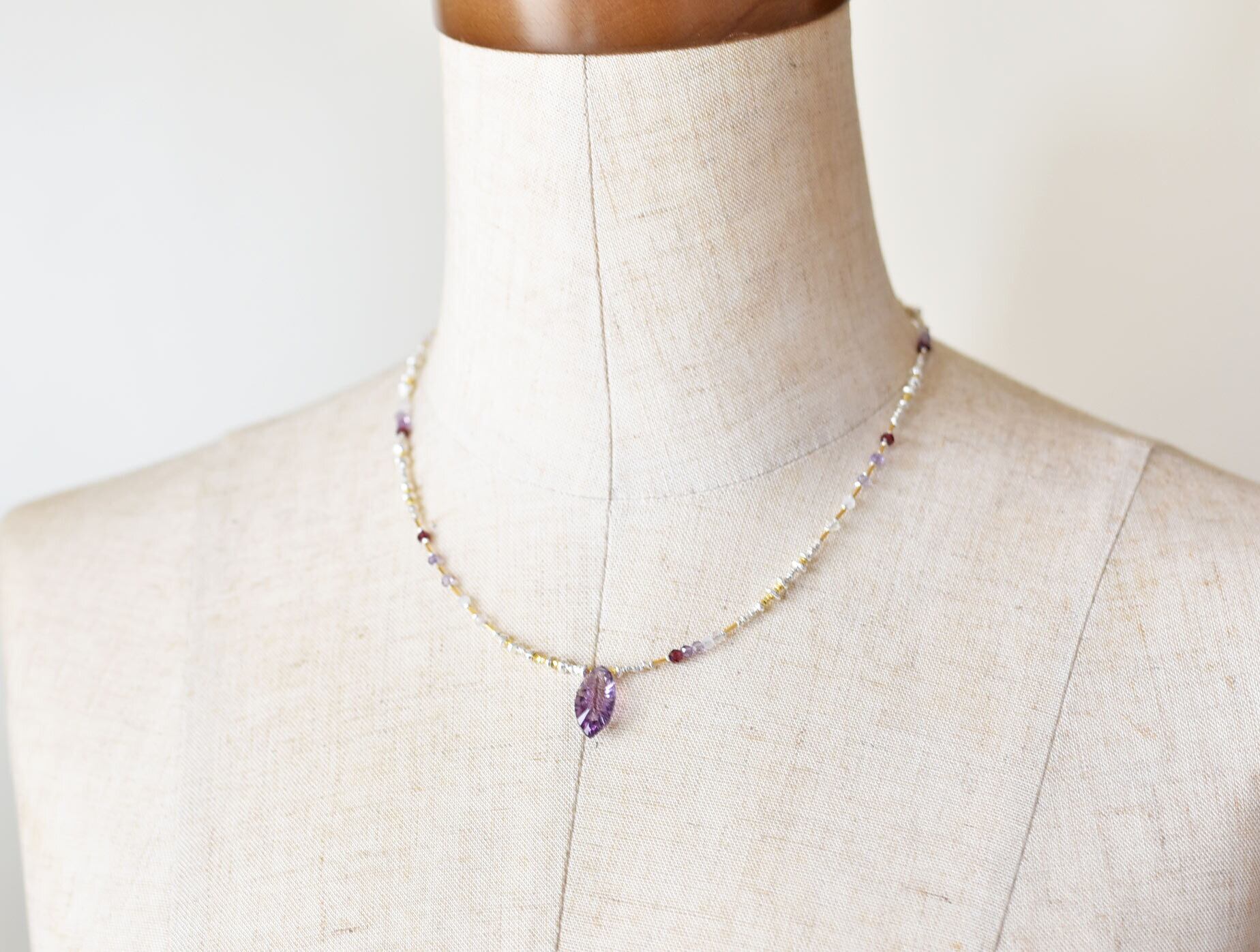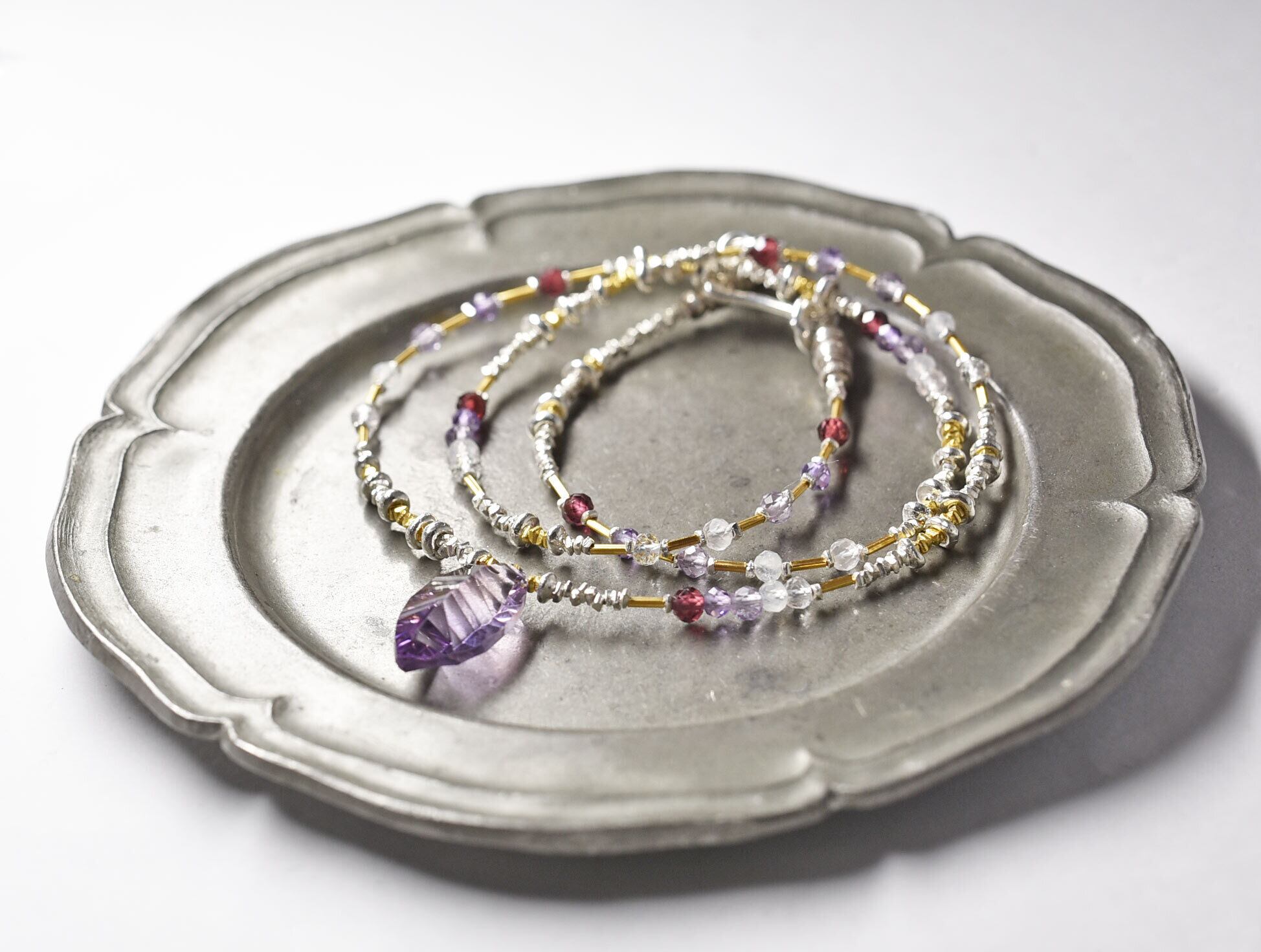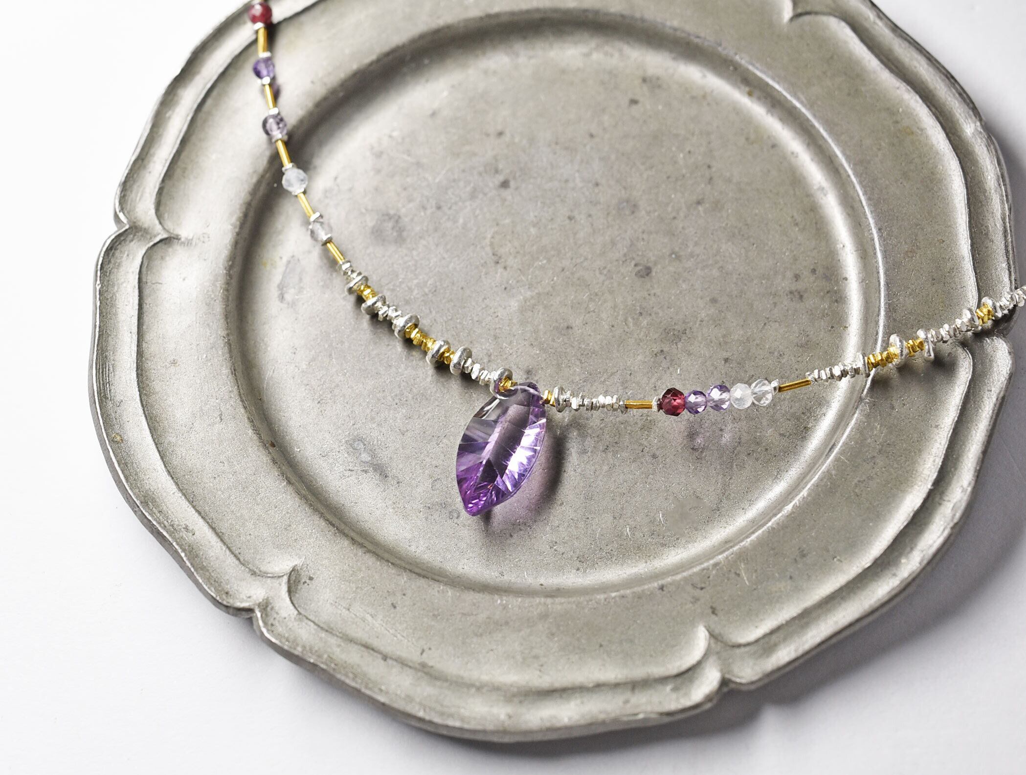 アメジストと小さなストーンビーズ、煌めくカレンシルバービーズを繋いだ華奢なネックレスです。