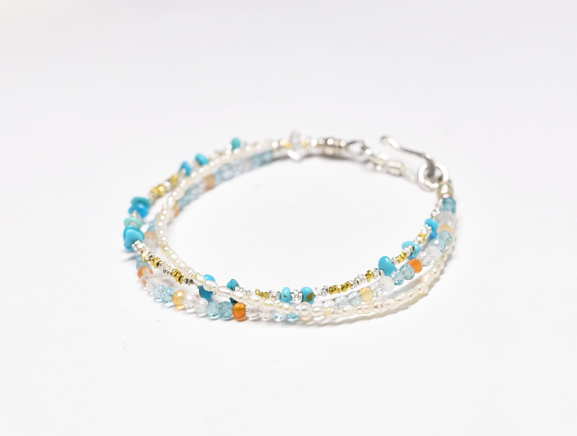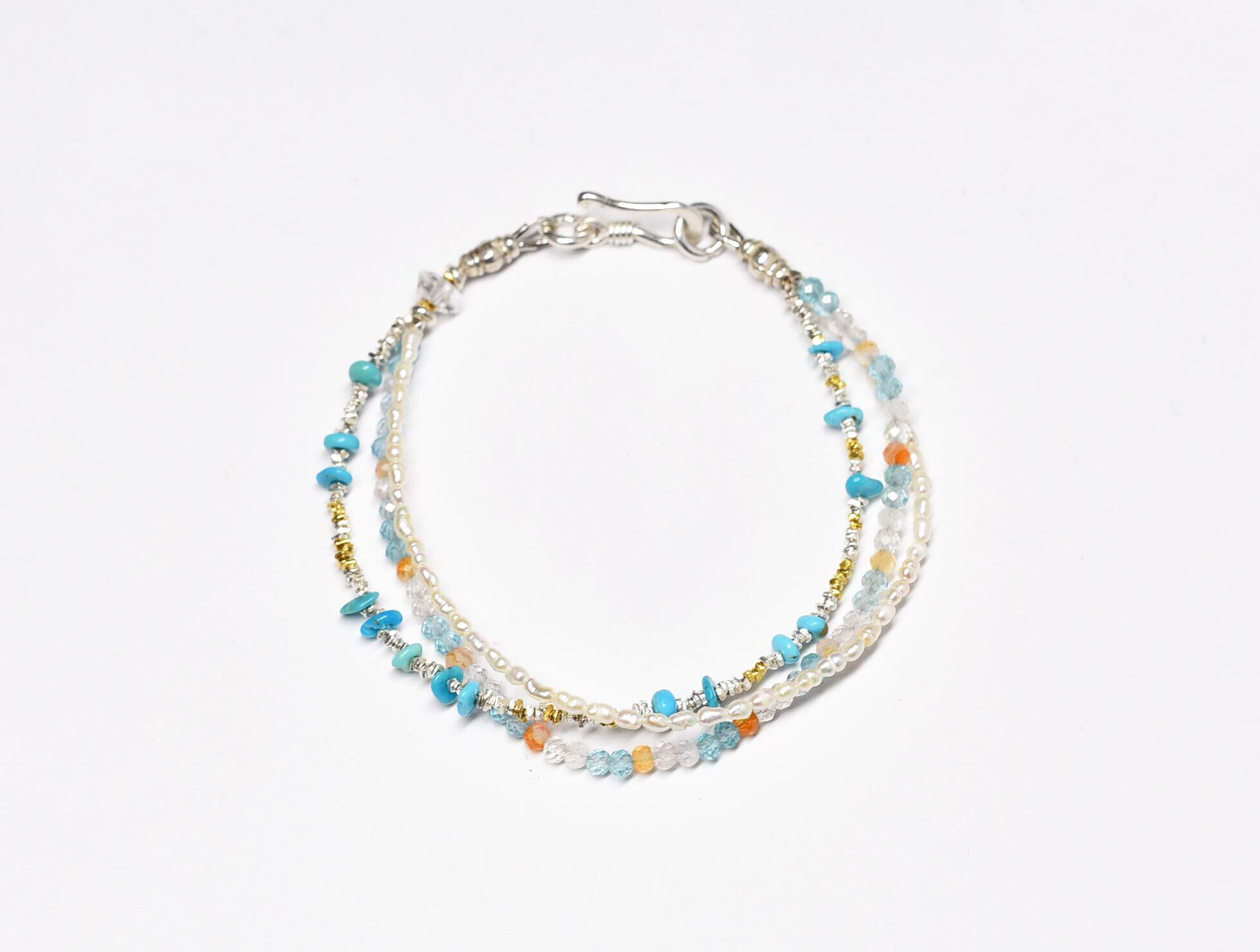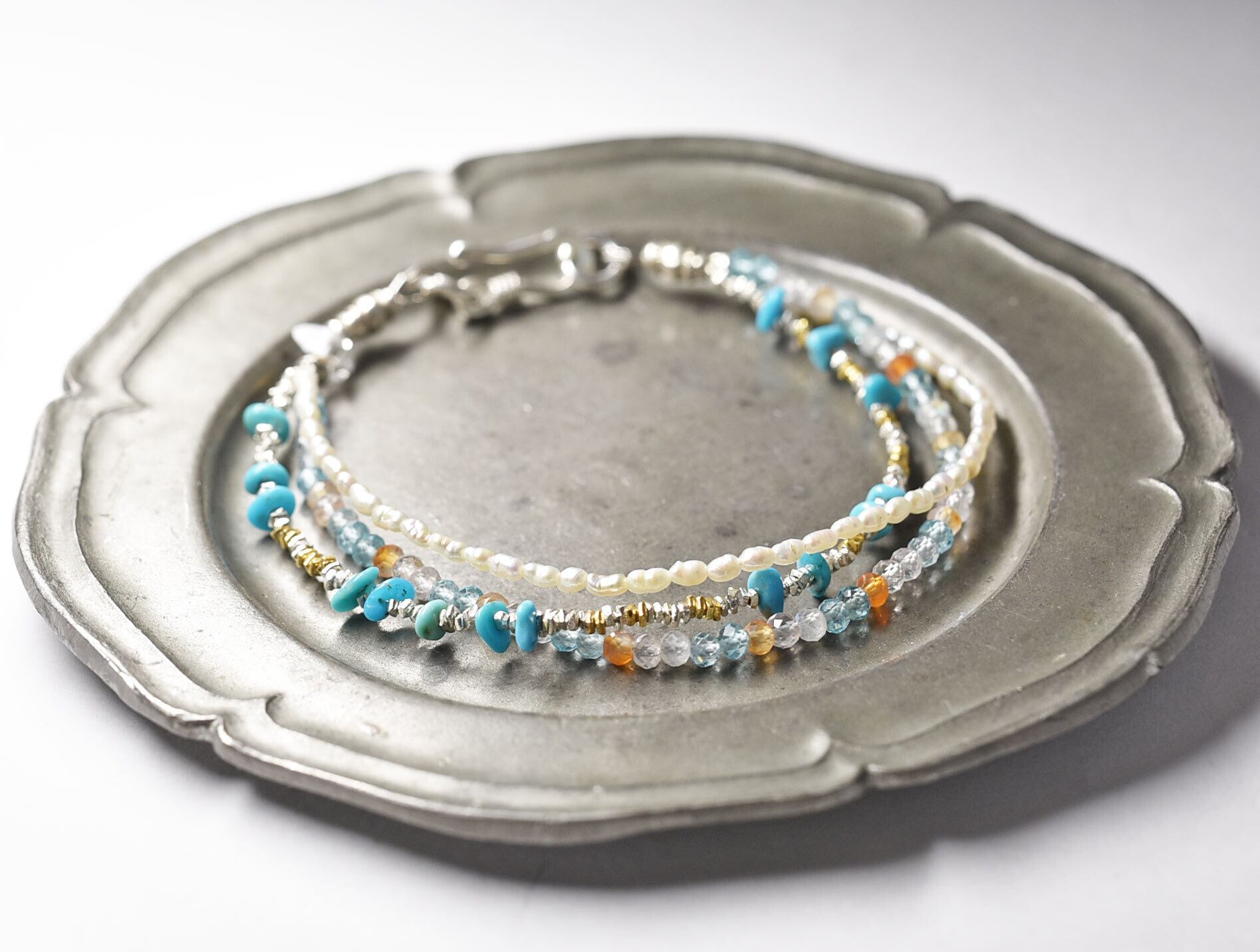 キャッスルドームターコイズと煌めくカレンシルバー、淡水パール、小さなストーンビーズの3連ブレス