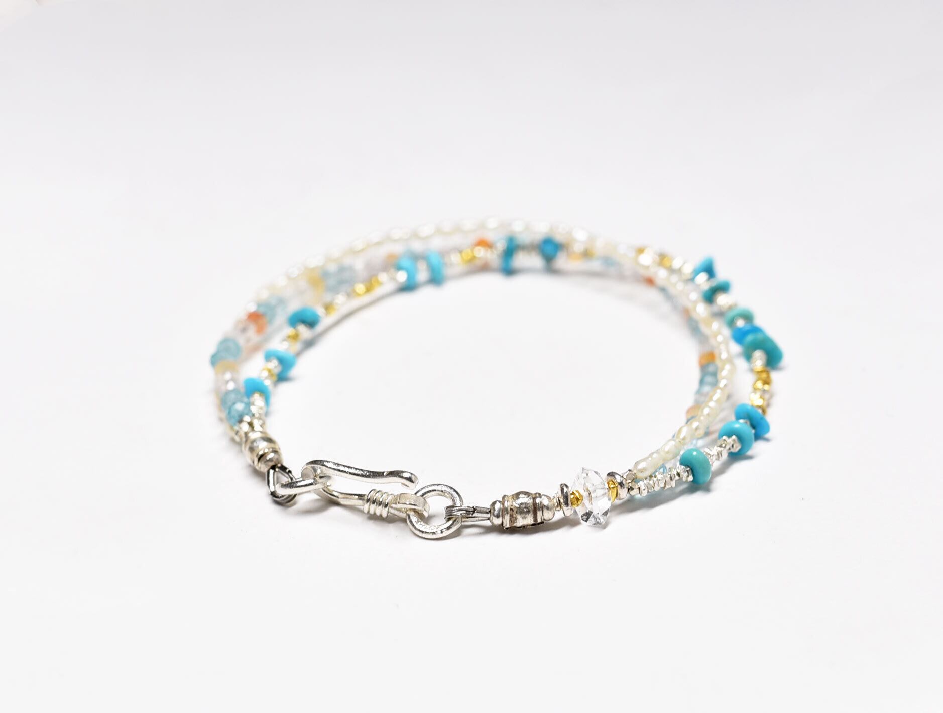 素材:カレンシルバー、淡水パール、キャッスルドームターコイズ、ハーキマーダイヤモンド、アパタイト、カーネリアン、クォーツ、レインビームーンストーン、ワイヤー