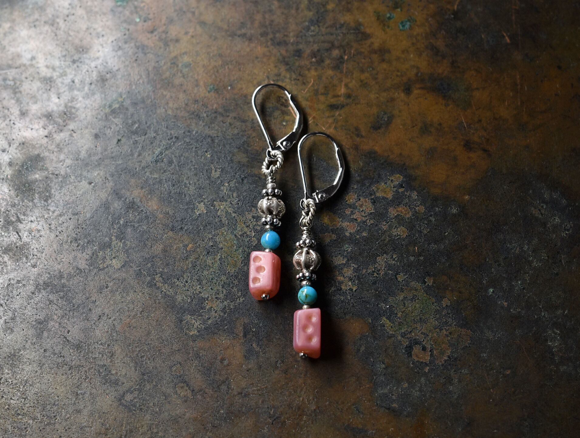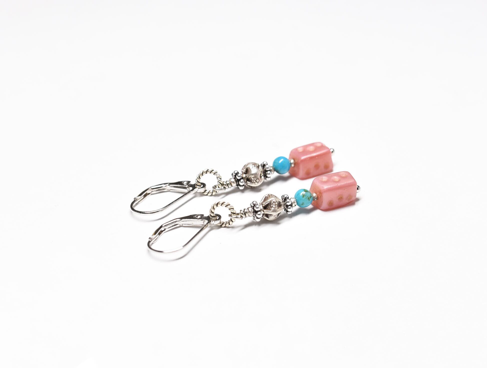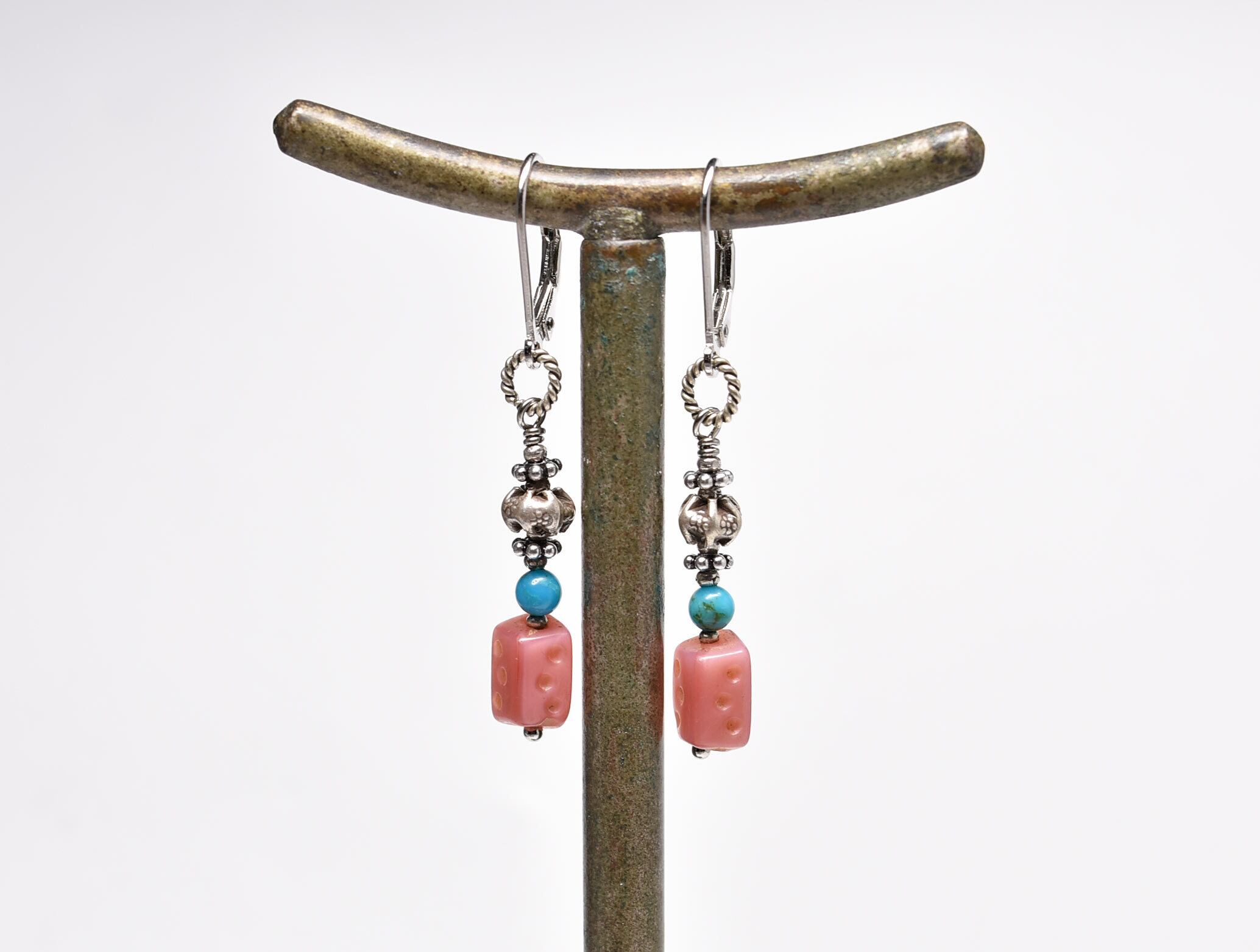 桃色ダイスビーズとターコイズ、カレンシルバーのピアス