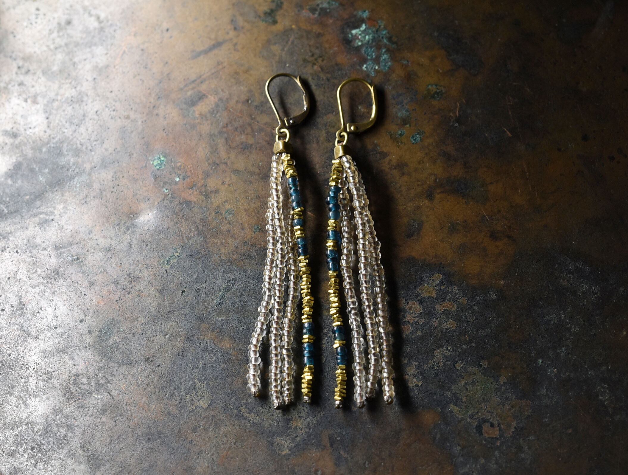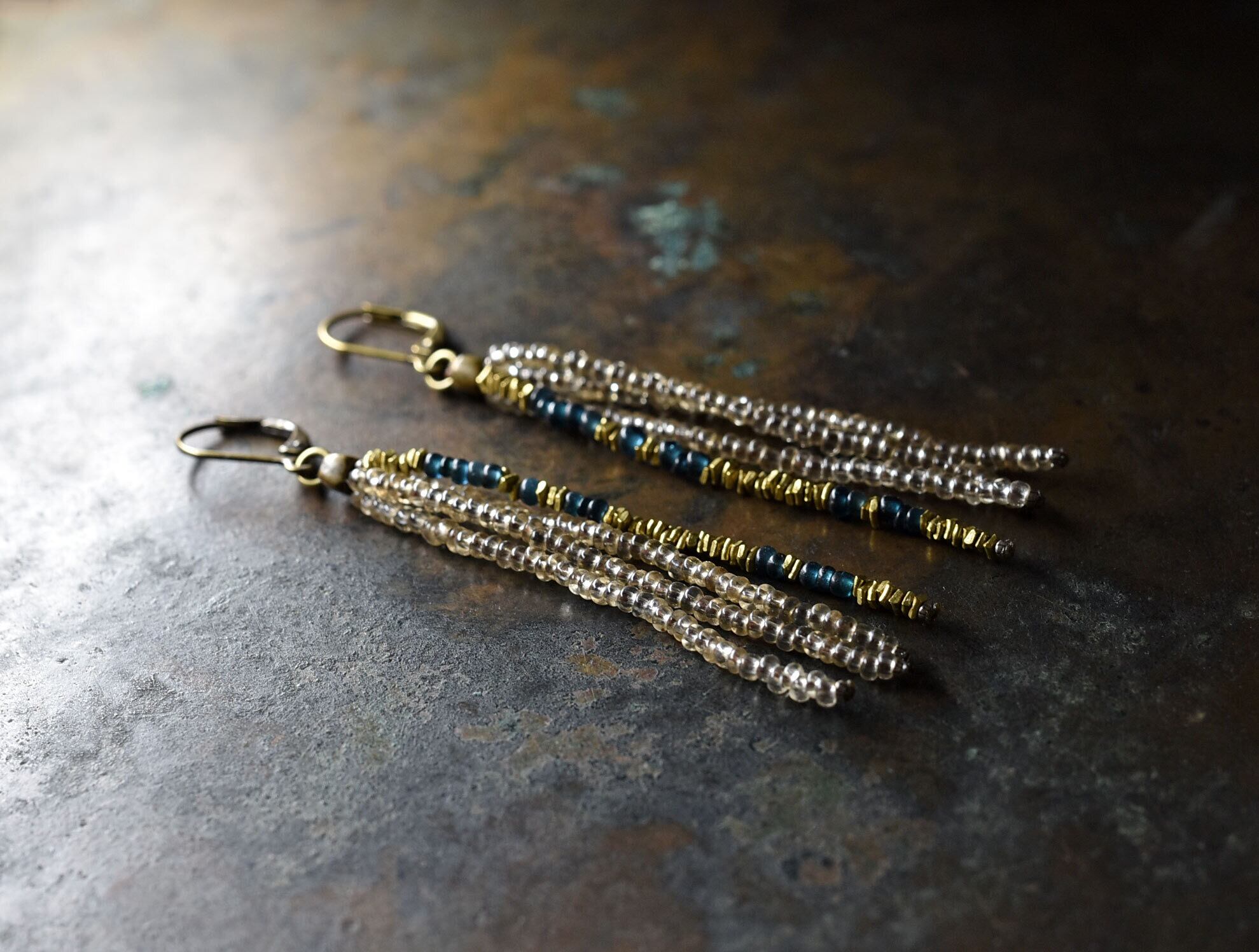 ブラスビーズとクリア&インディゴブルーシードビーズの4連ピアス