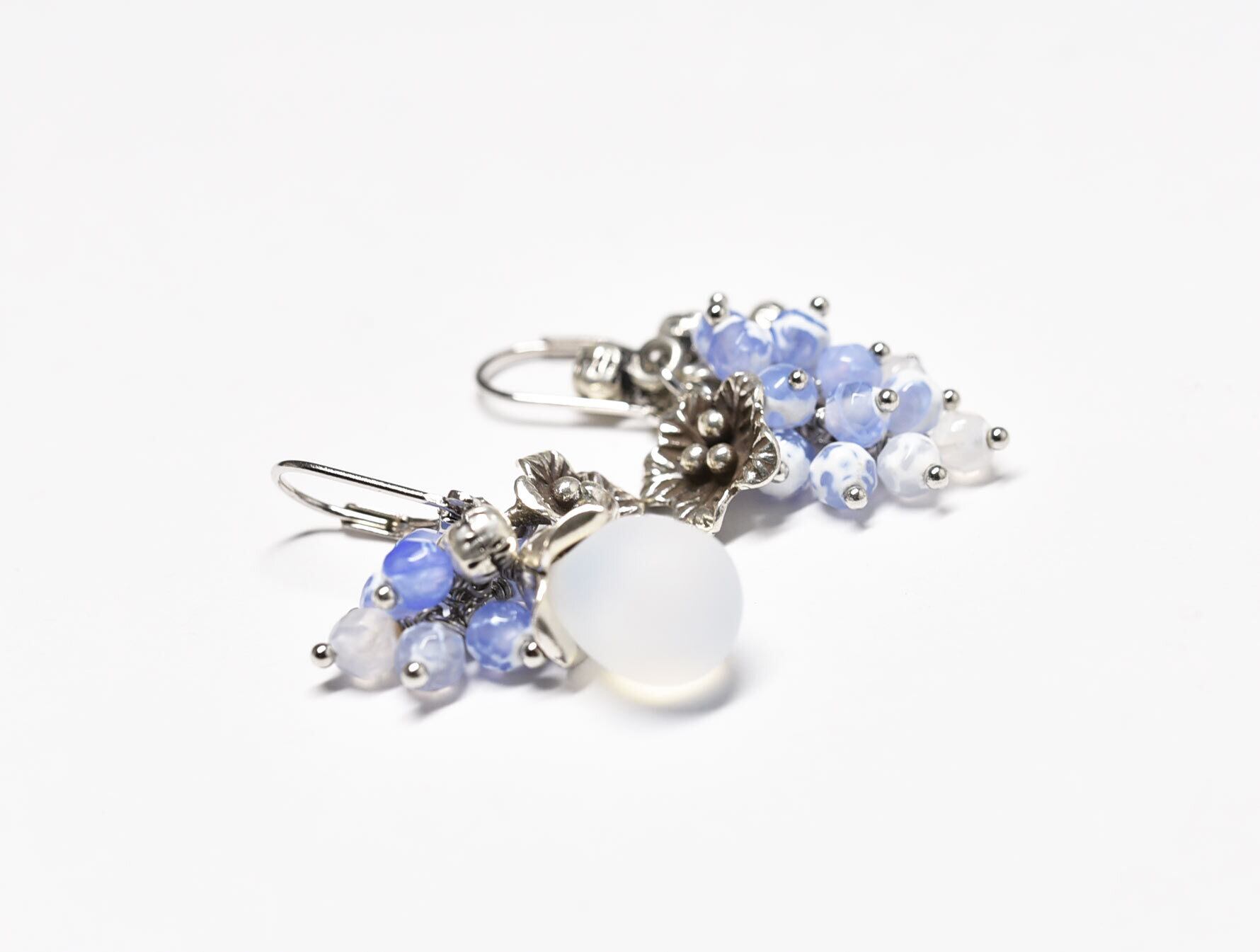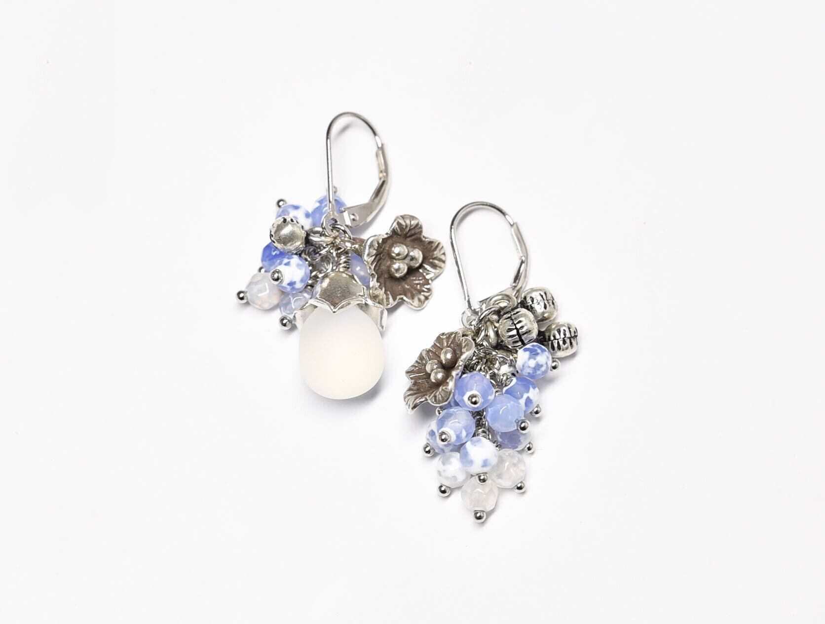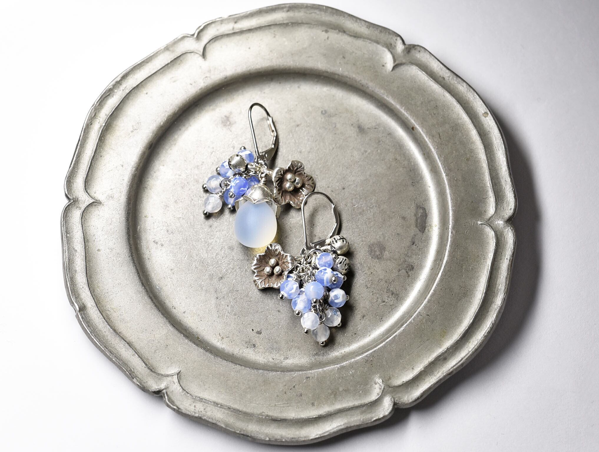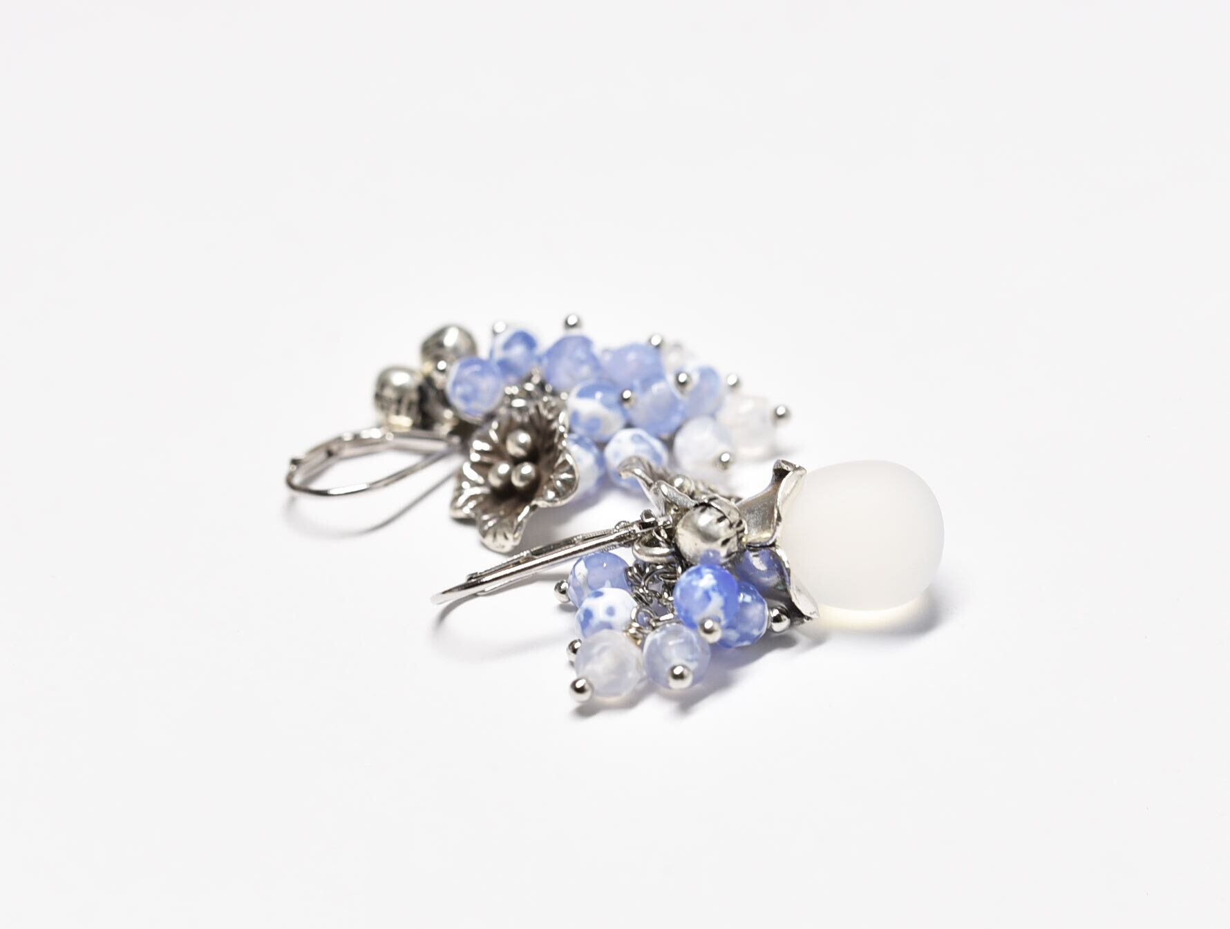 ウエディングビーズとたわわなブルー瑪瑙、お花のカレンシルバー小さな鈴を繋いだピアスです。