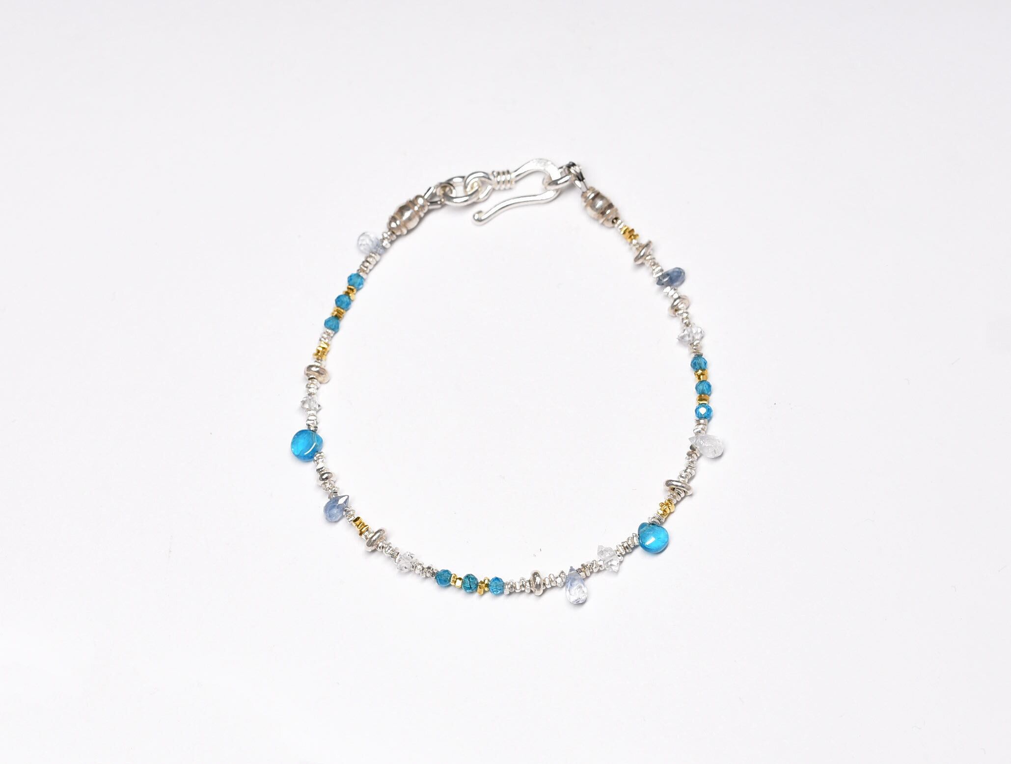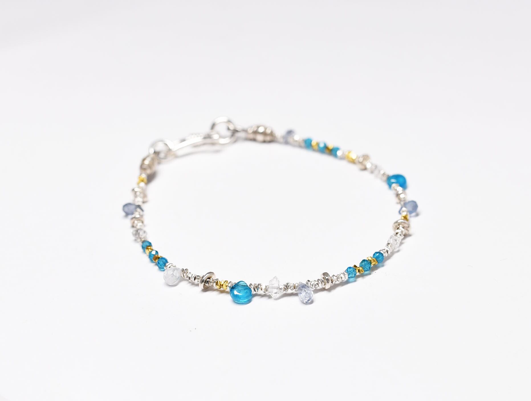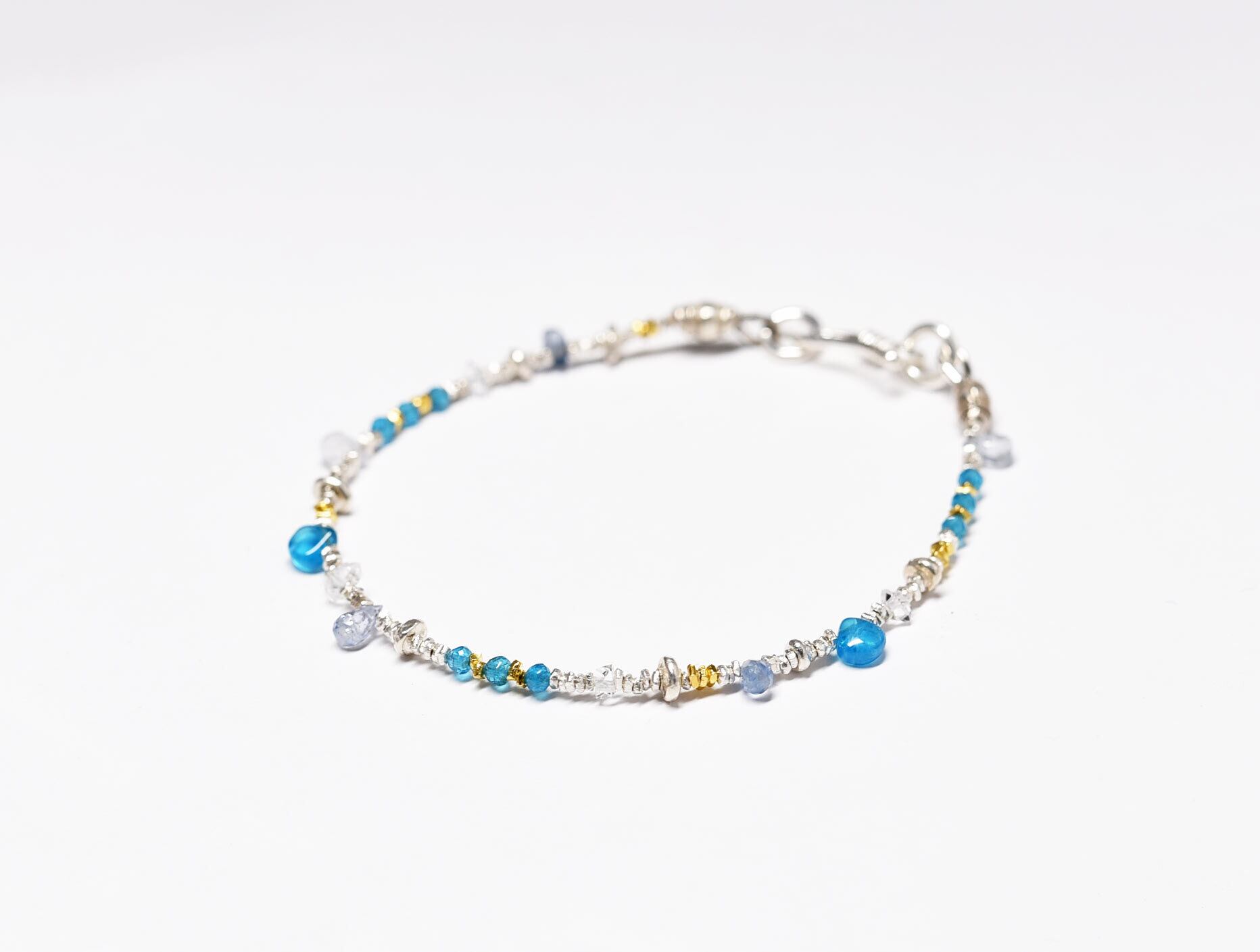 アパタイト、サファイア、ハーキマーダイヤモンド、煌めくカレンシルバーを繋いだ華奢なブレスです。