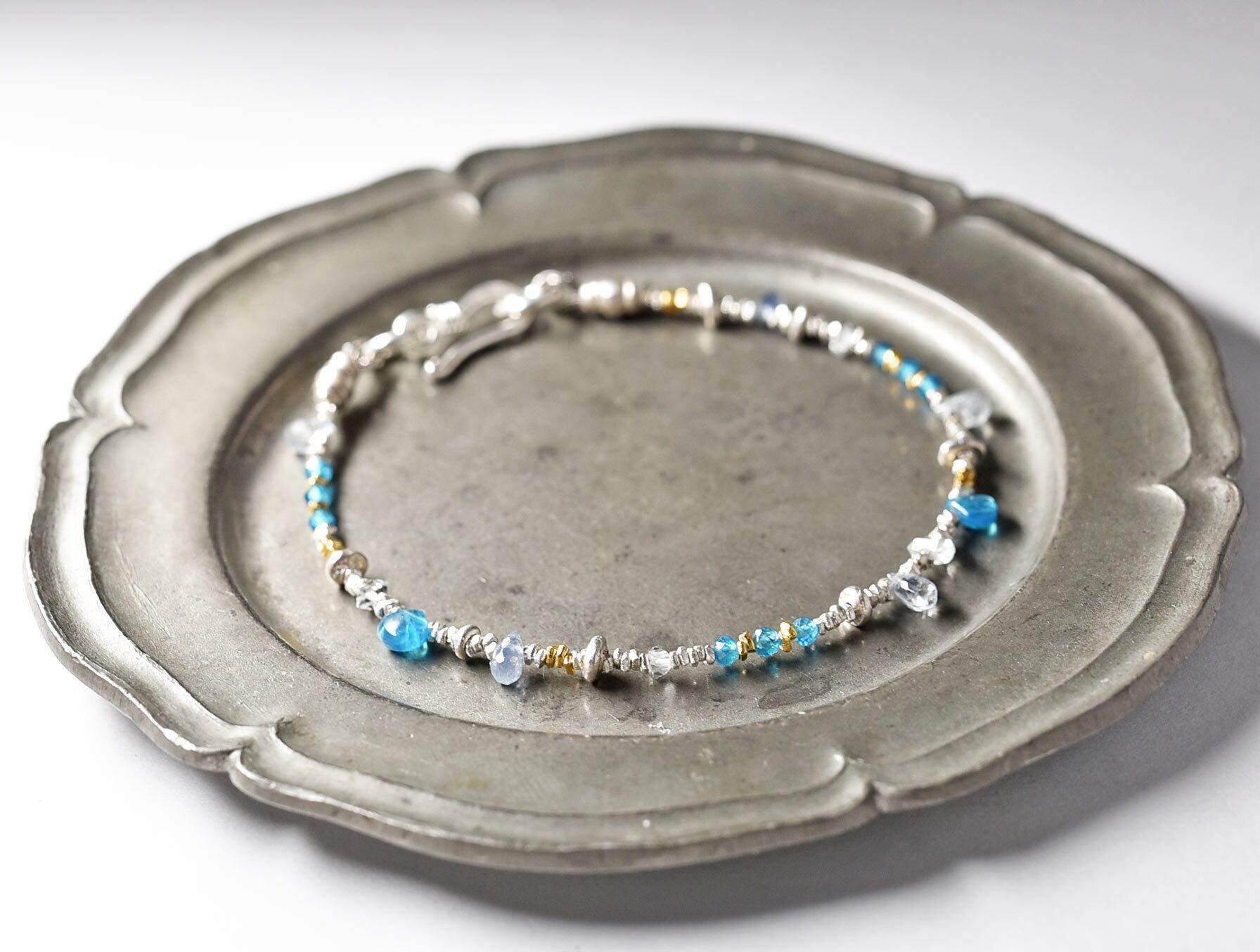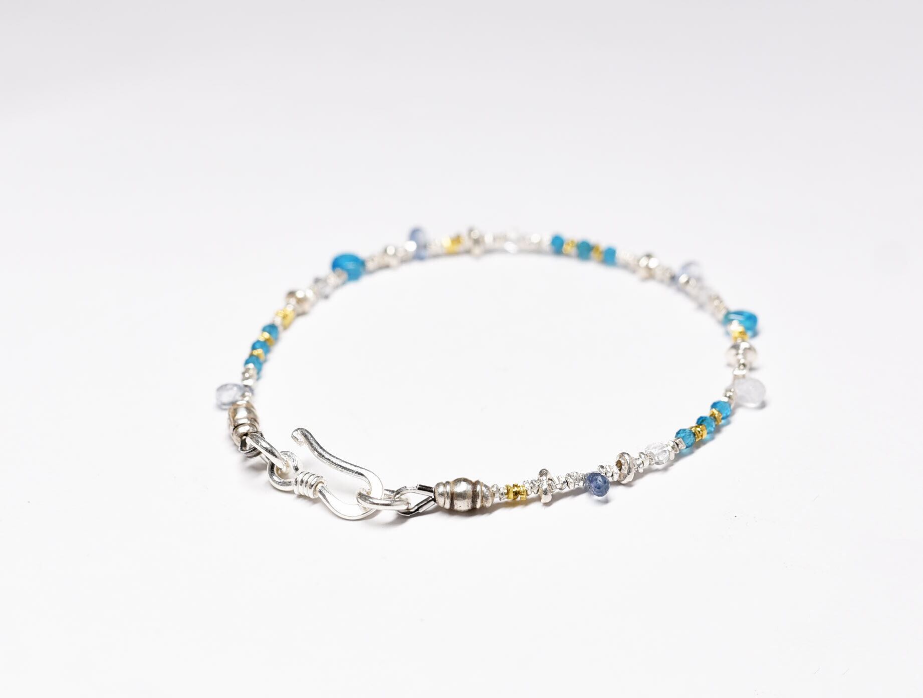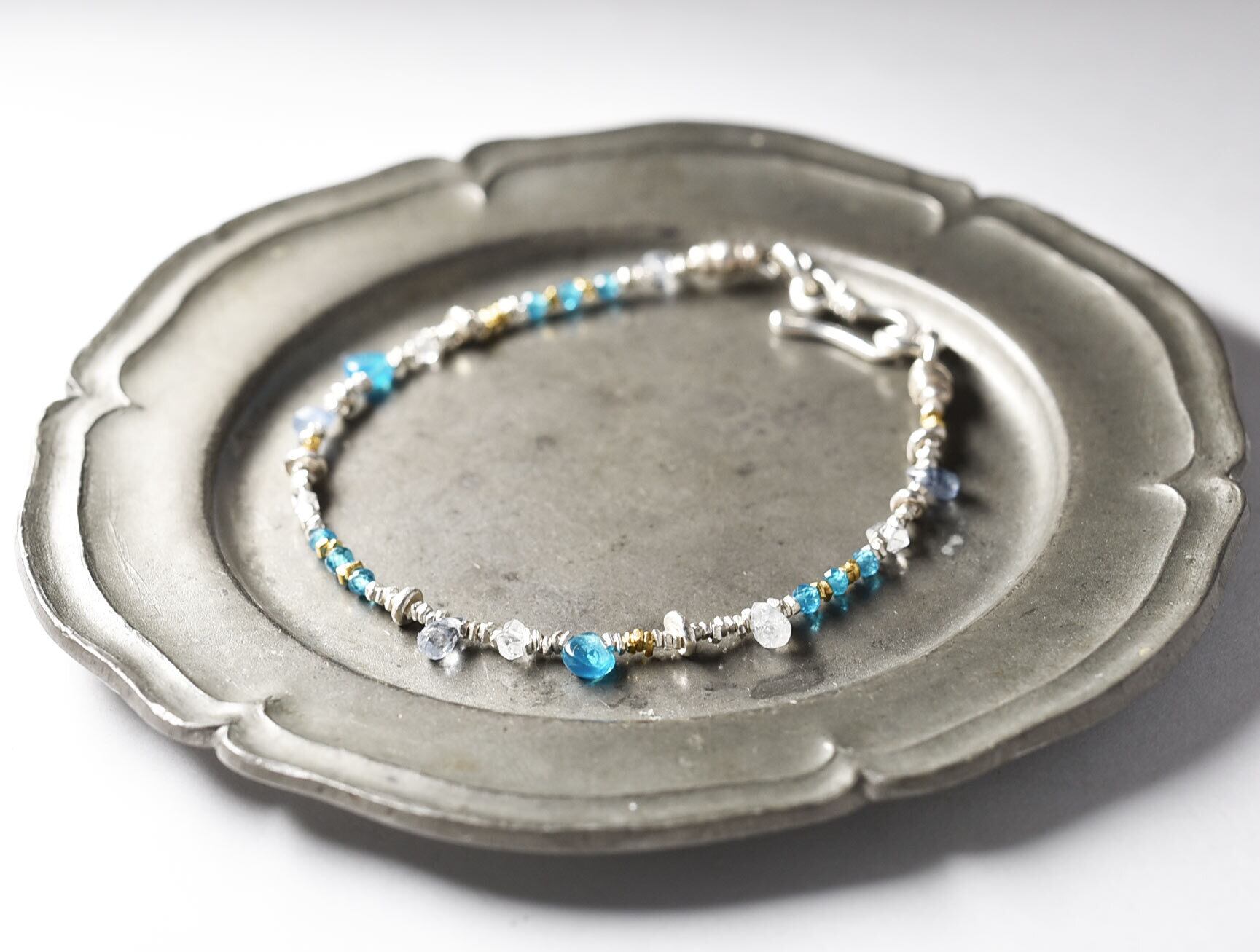 アパタイト、サファイア、ハーキマーダイヤモンド、煌めくカレンシルバーを繋いだ華奢なブレスです。