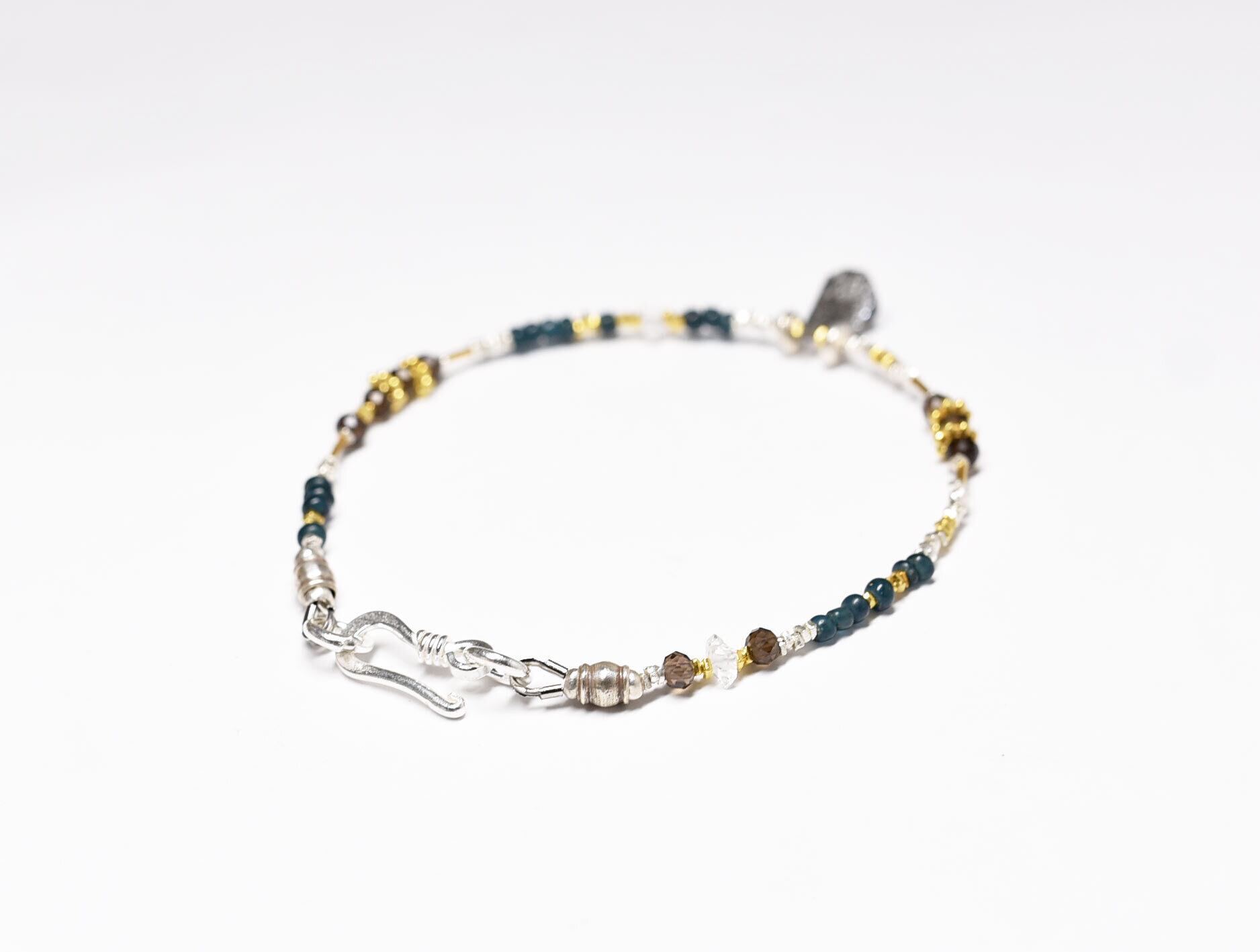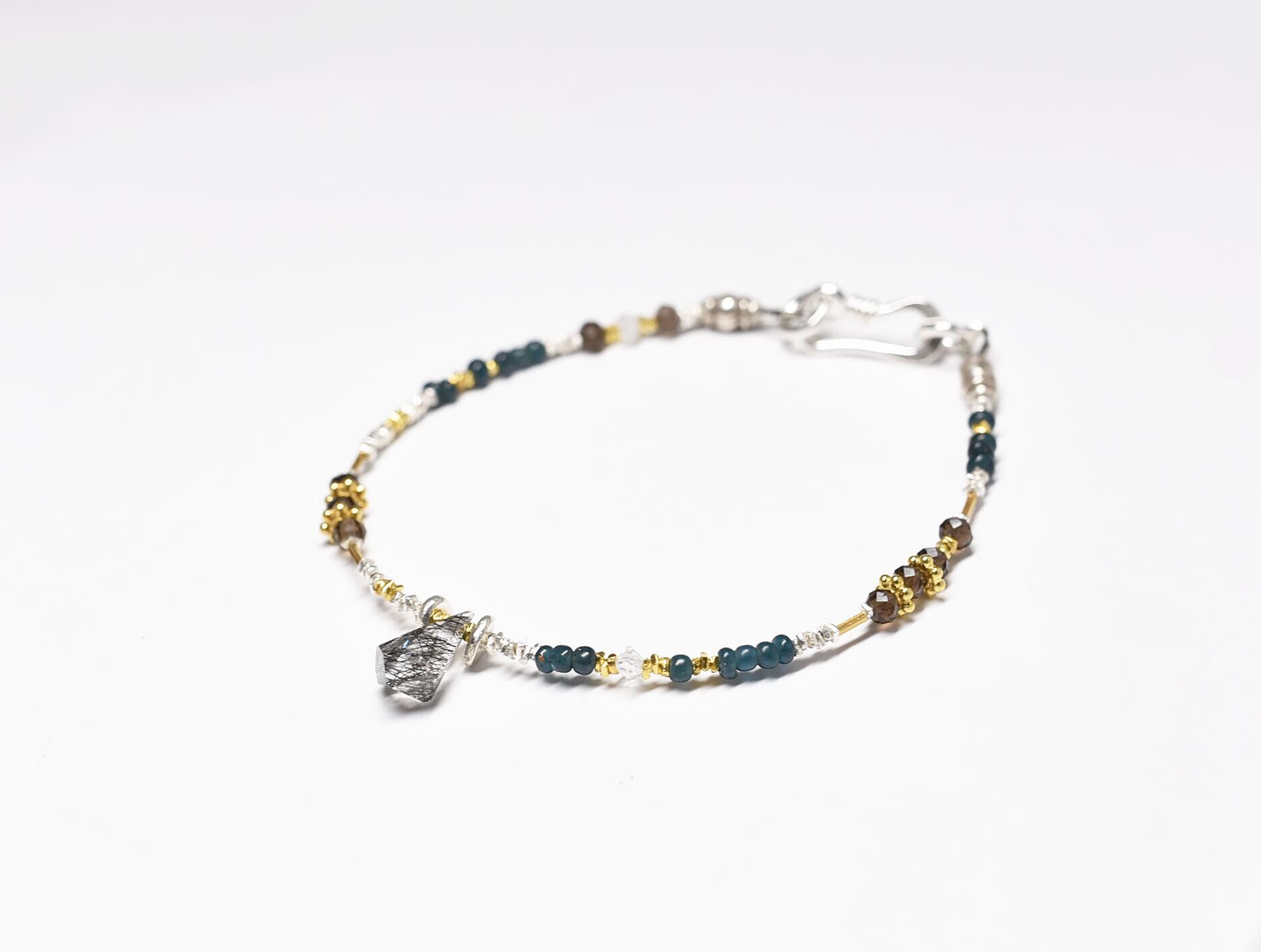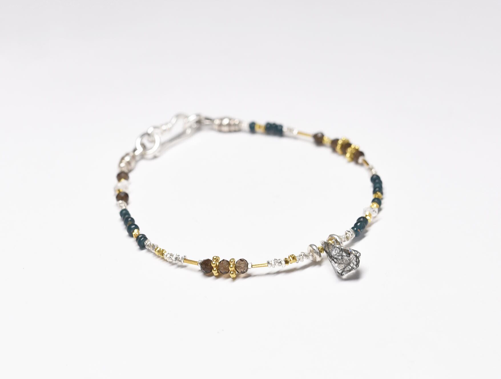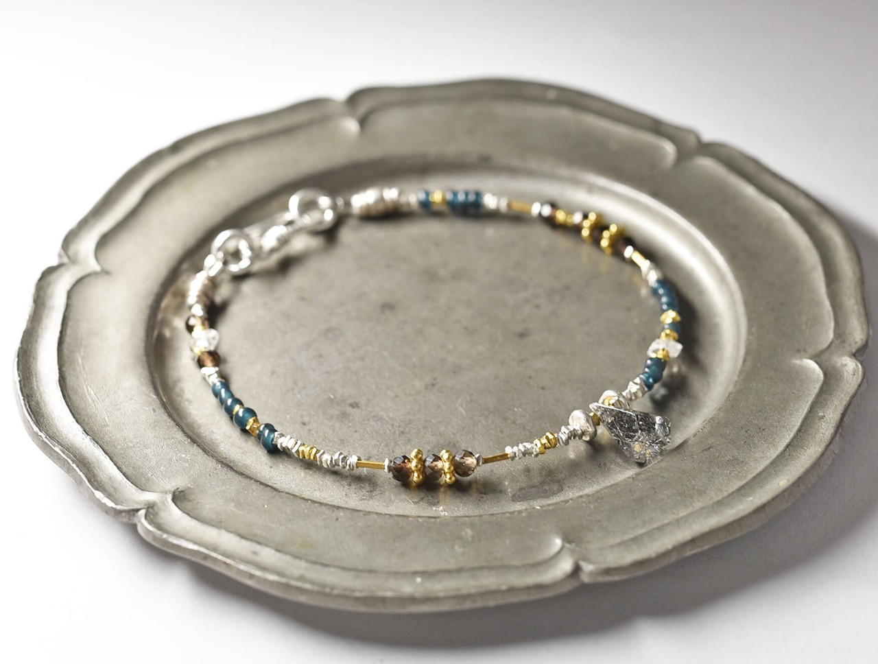 ブラックルチルクォーツ、ハーマーダイヤモンド、アンティークビーズ、スモーキークォーツと煌めくカレンシルバーを繋いだ華奢なブレスです。