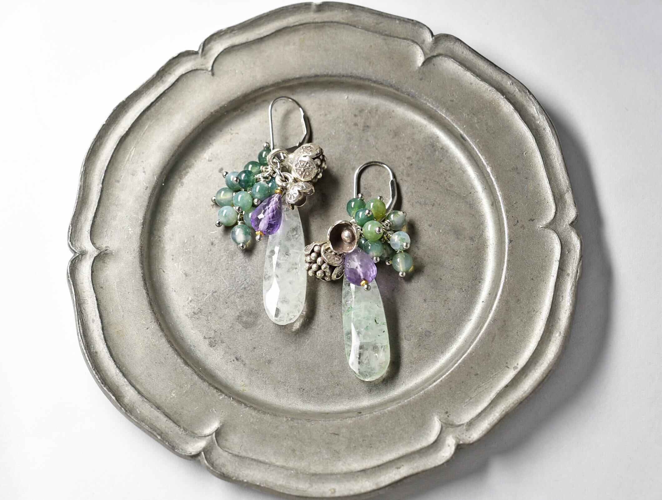 クリソコラインクォーツとたわわなモスアゲート、アメジストとカレンシルバーのピアス