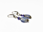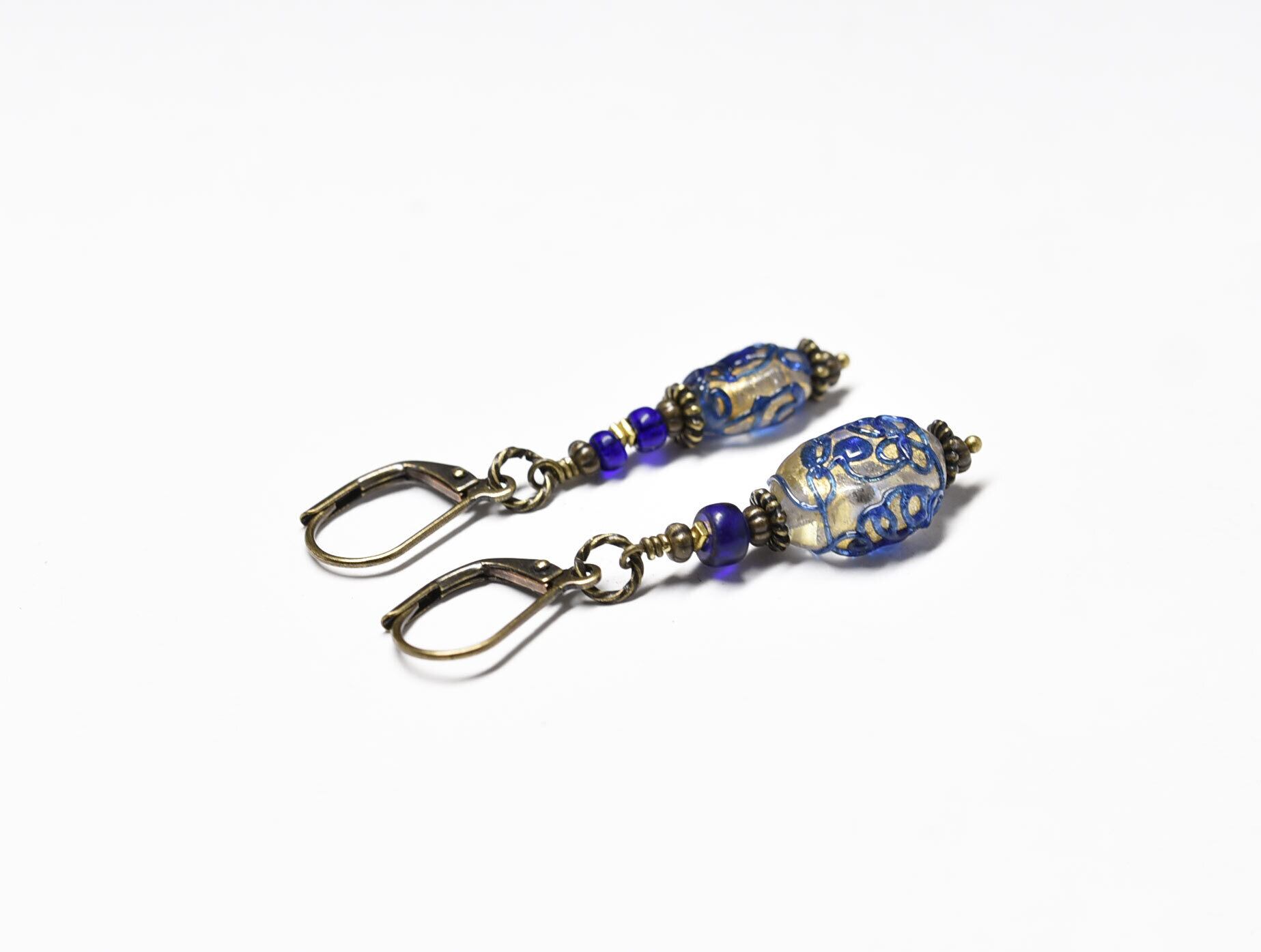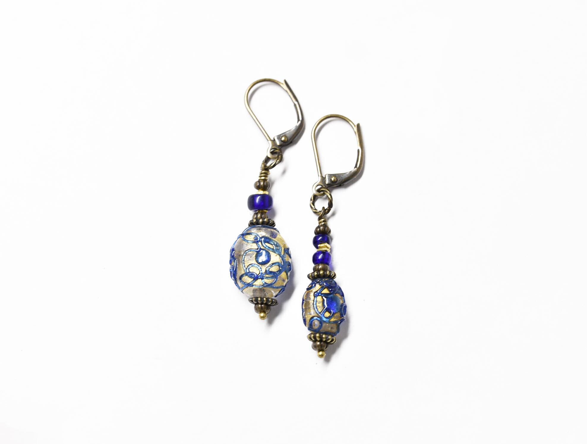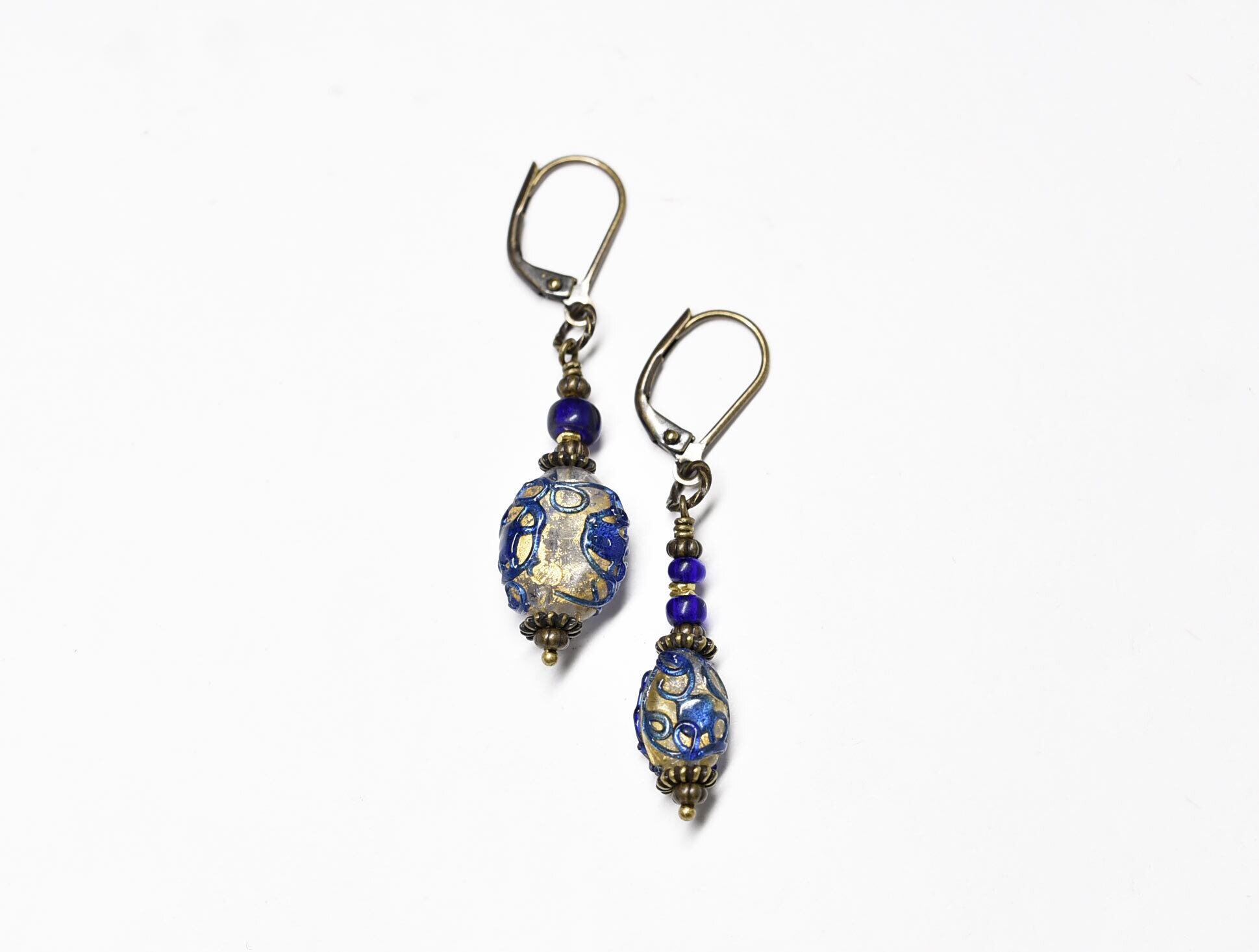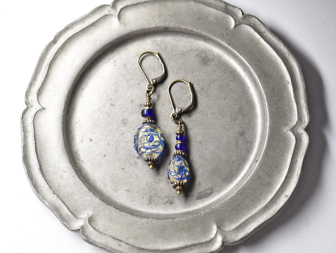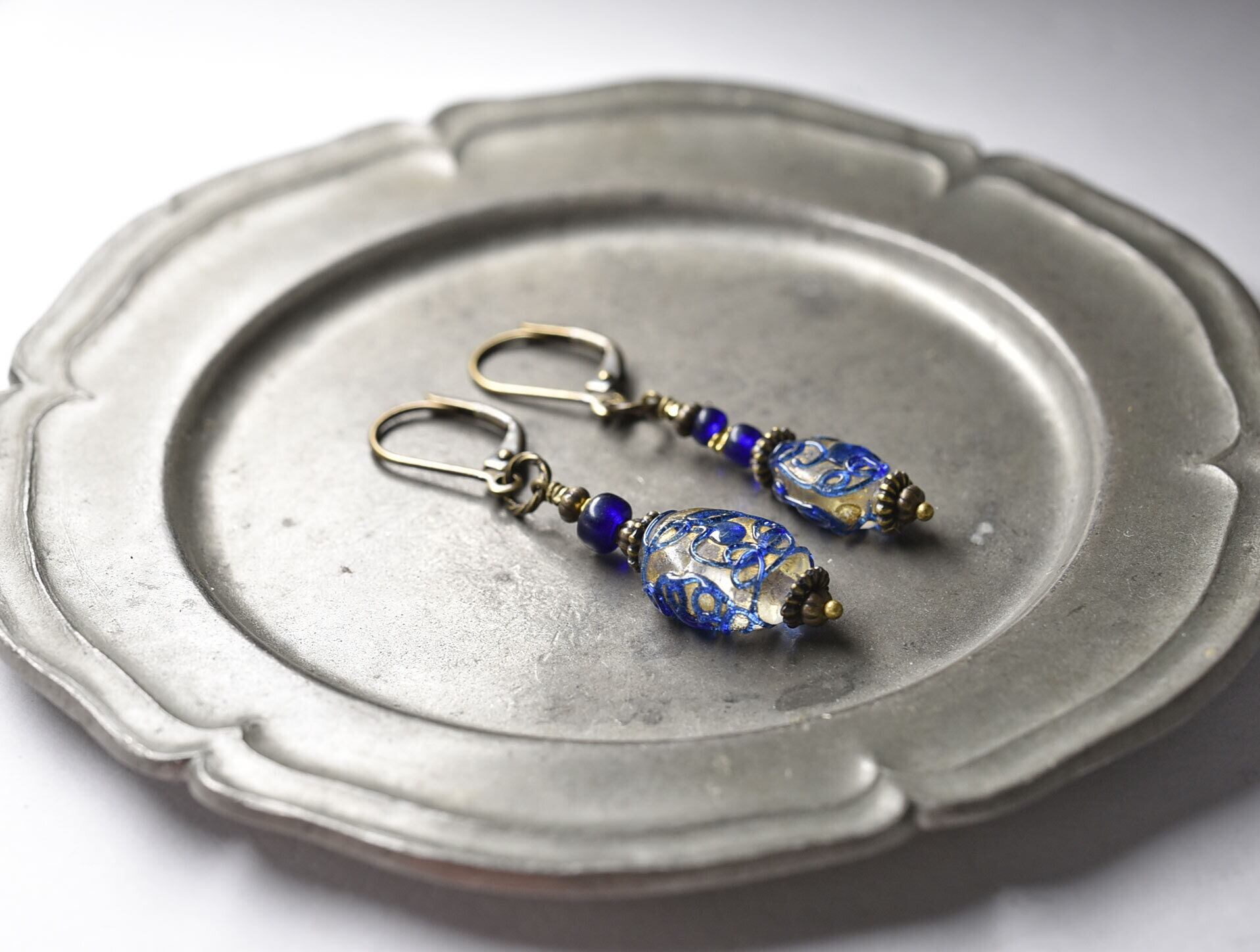 アンティーク瑠璃色トレイルデコレーションの金箔装飾ビーズと瑠璃色ビーズのアンシメトリーピアス