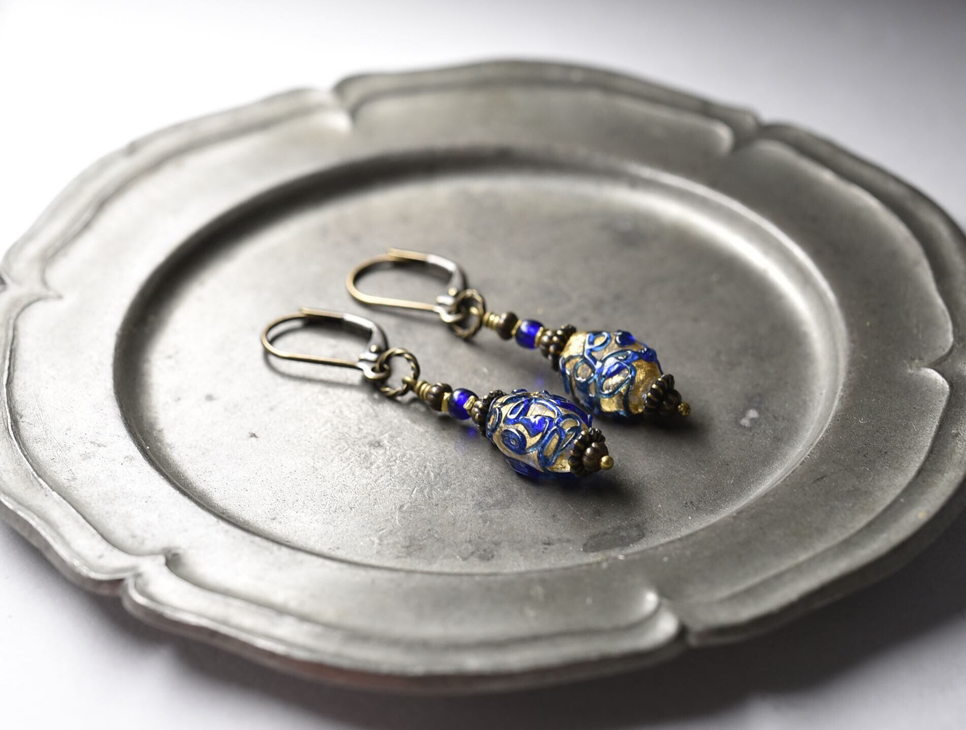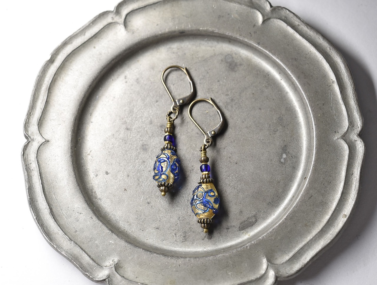 アンティーク瑠璃色トレイルデコレーションの金箔装飾ビーズと瑠璃色ビーズのピアス