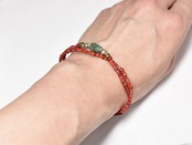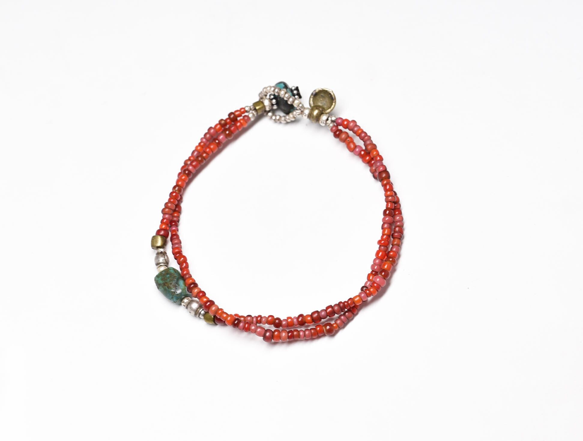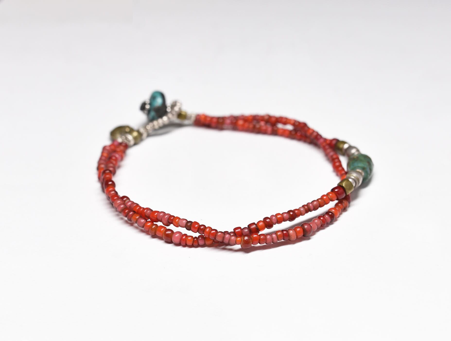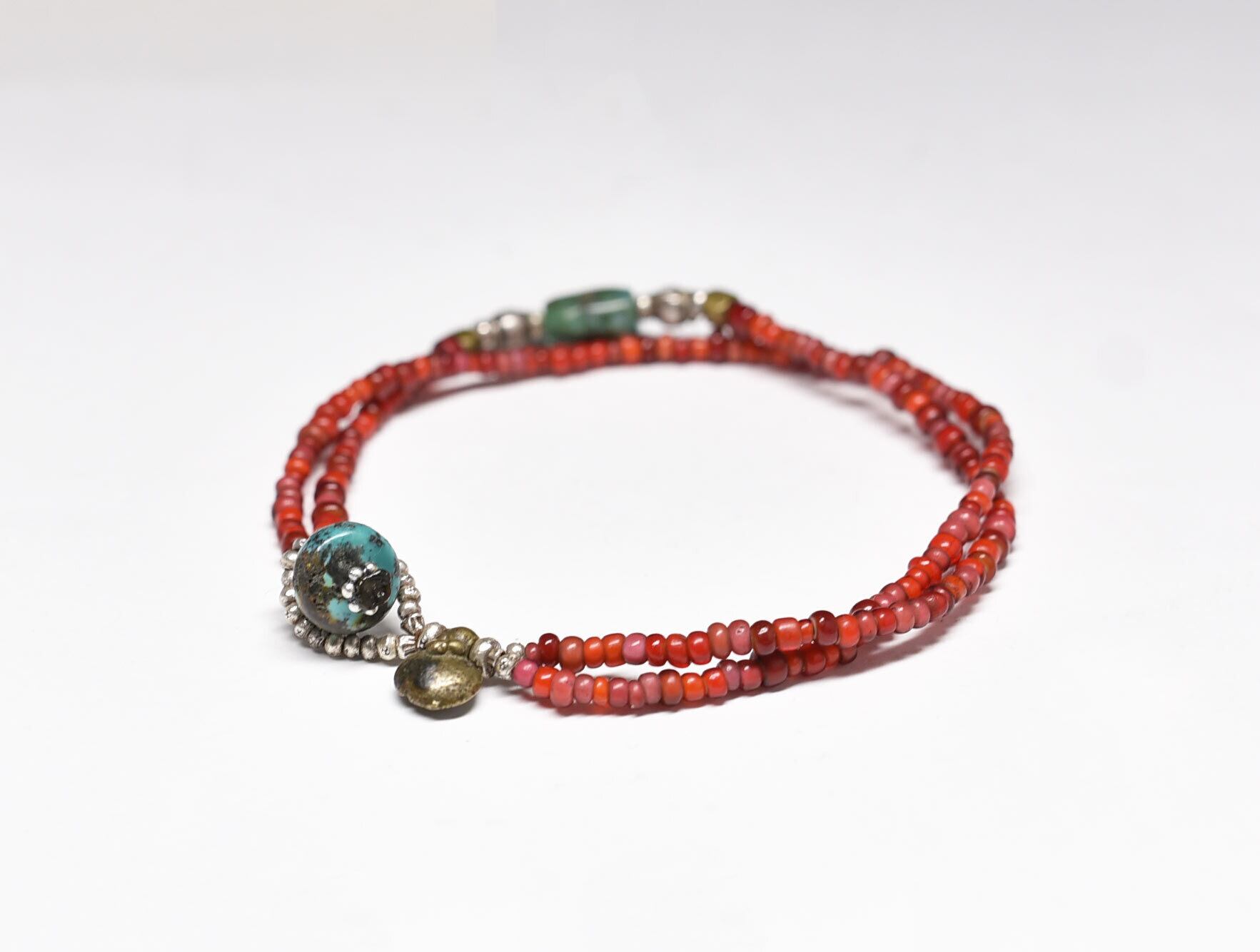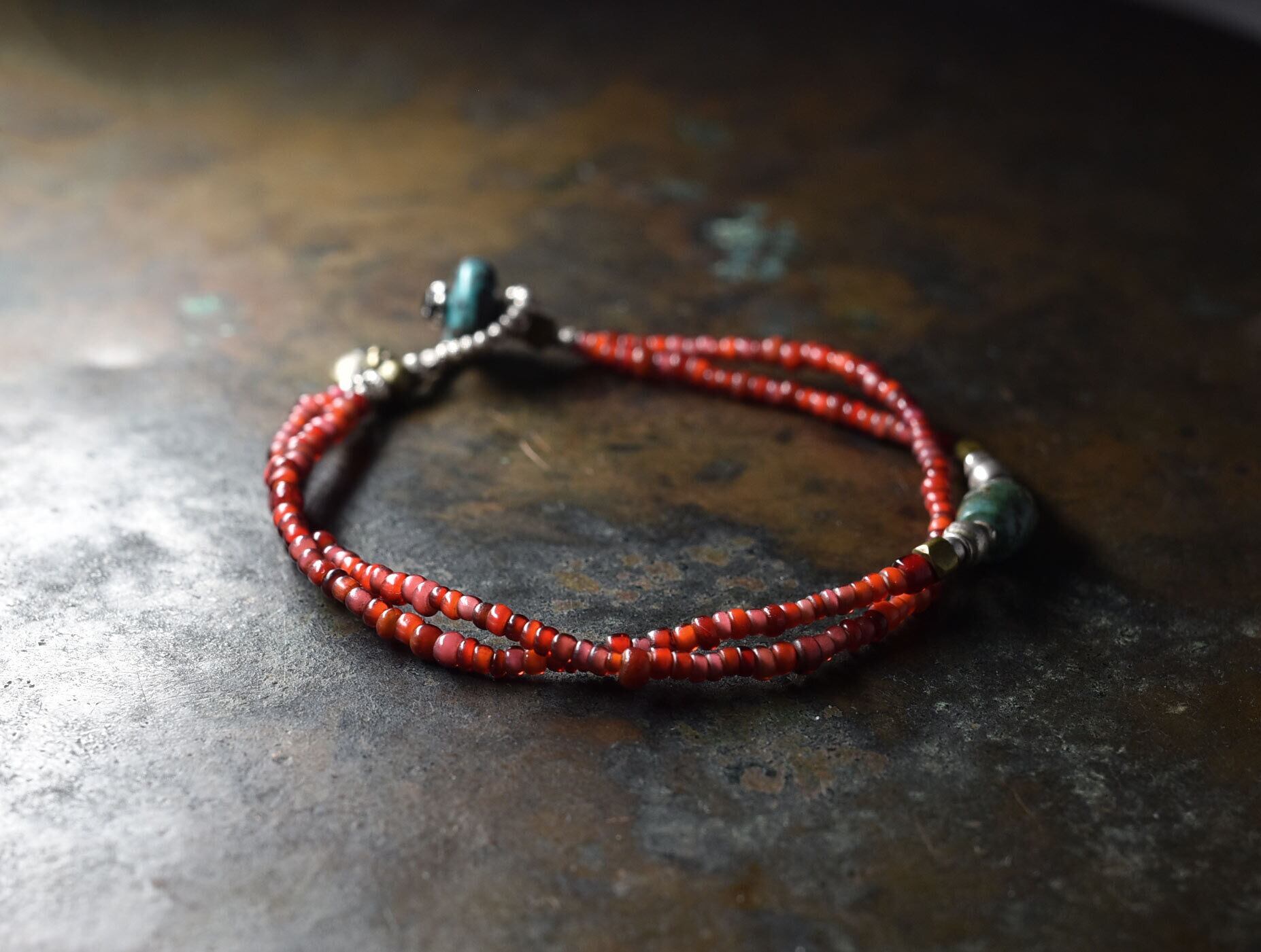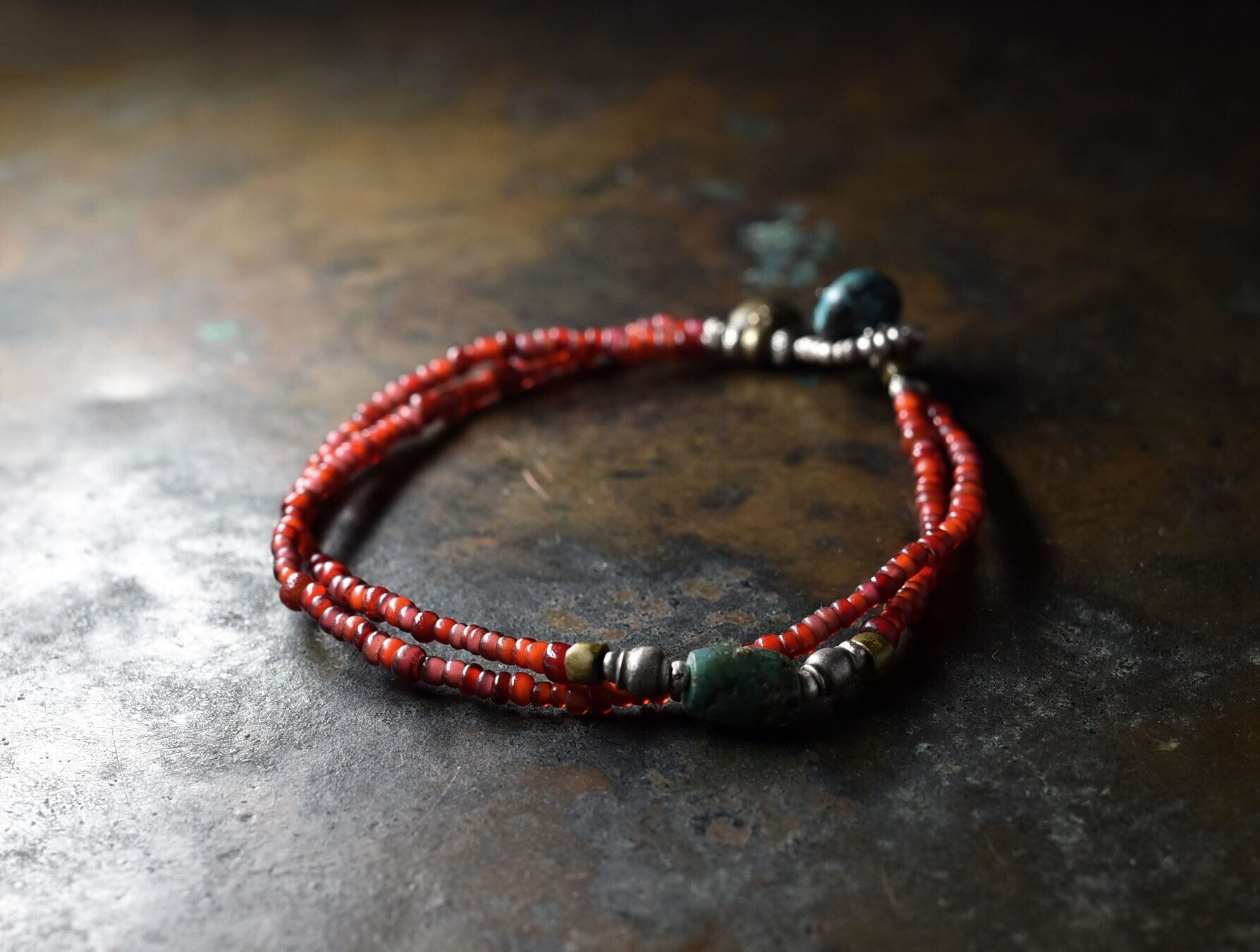 赤色のビーズはホワイトハーツと呼ばれるアンティークビーズです。芯(ハート)部分が白いことからこう呼ばれています。こちらは19~20世紀頃のベネチア産のビーズです。