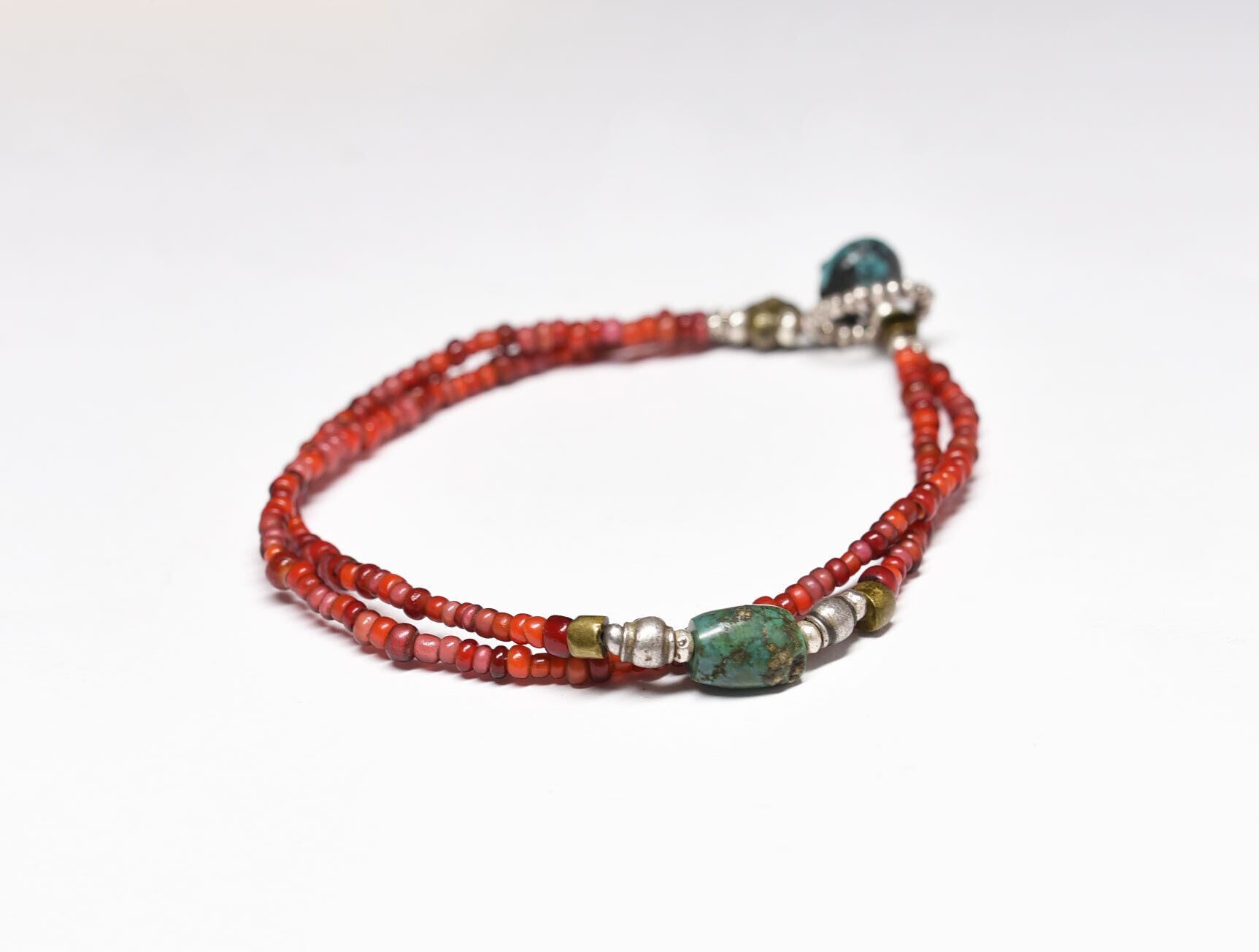 素材:oldチベタンターコイズ、oldチンシルバー、oldオリッサブラス、ガラス、ターコイズ、ロウビキ紐